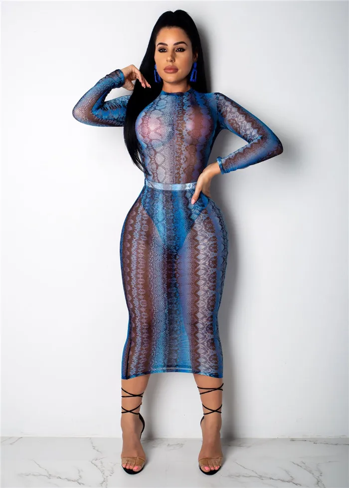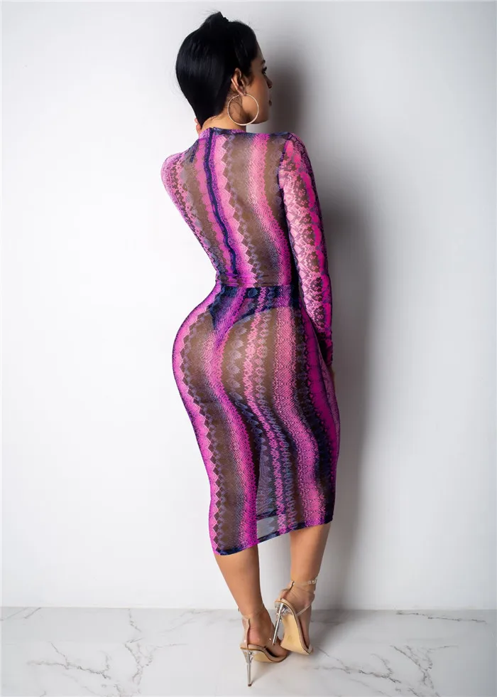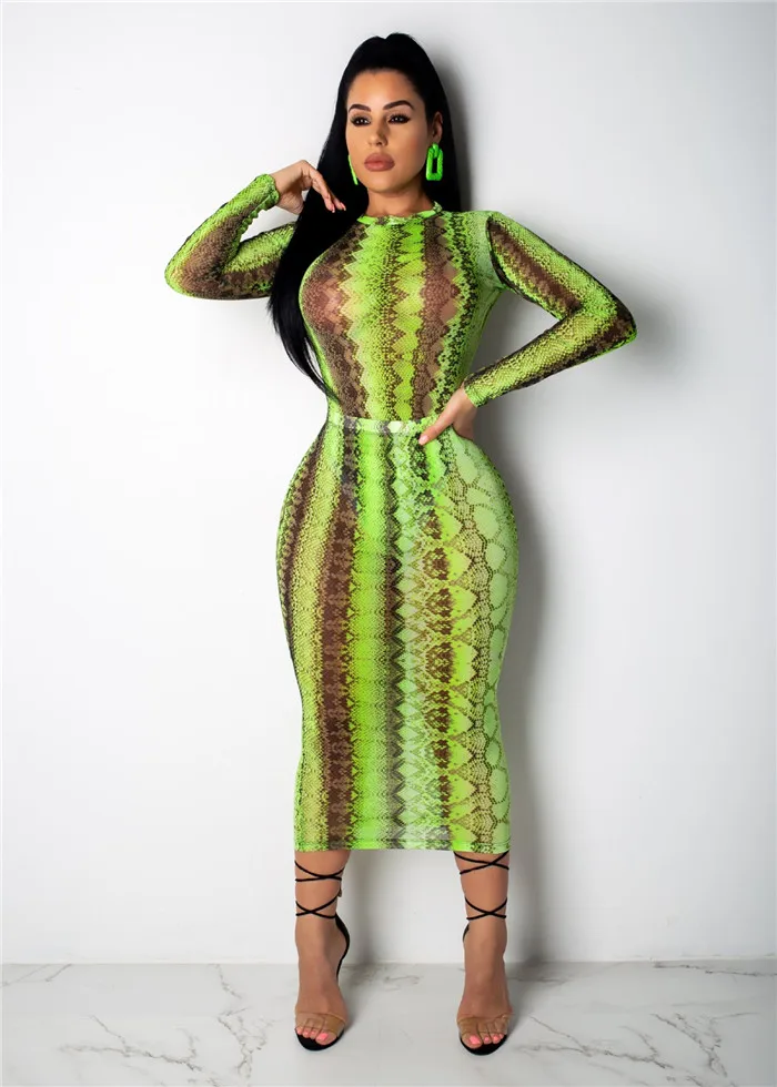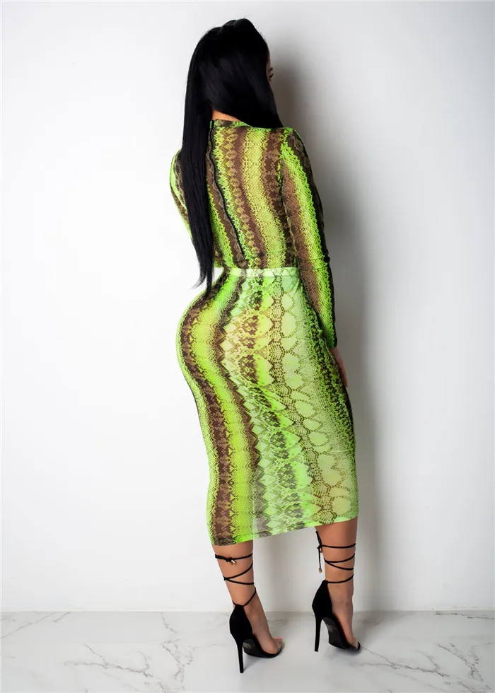 Party Club Dress Summer Sexy Sheer Bandage Bodycon Dress Long Sleeve Neon Green Snake Print Transparent Mesh Dress