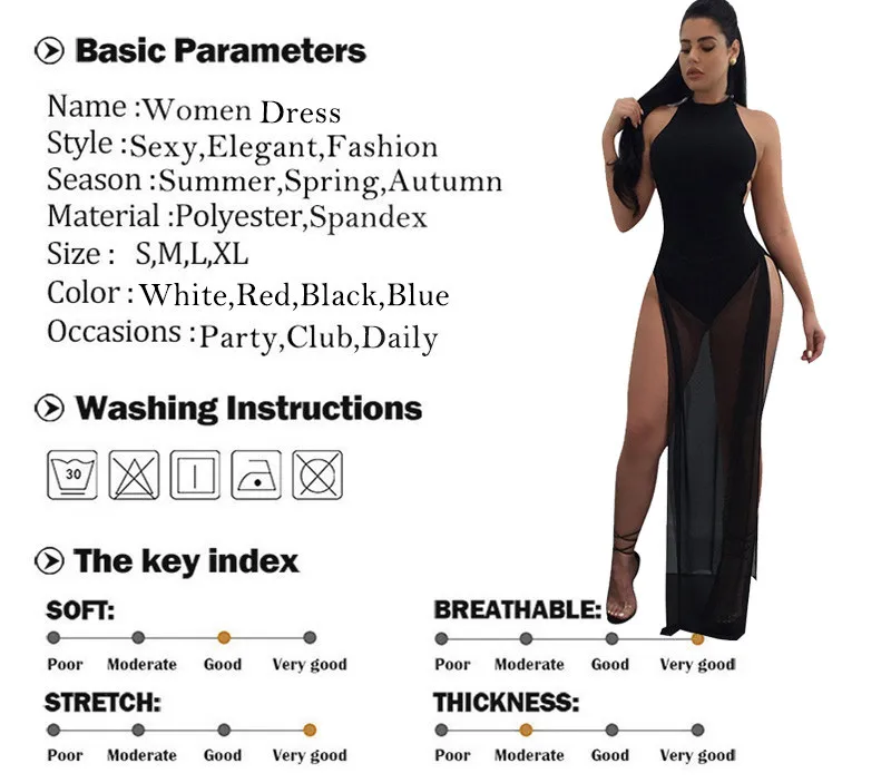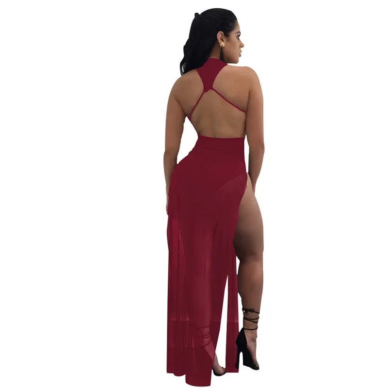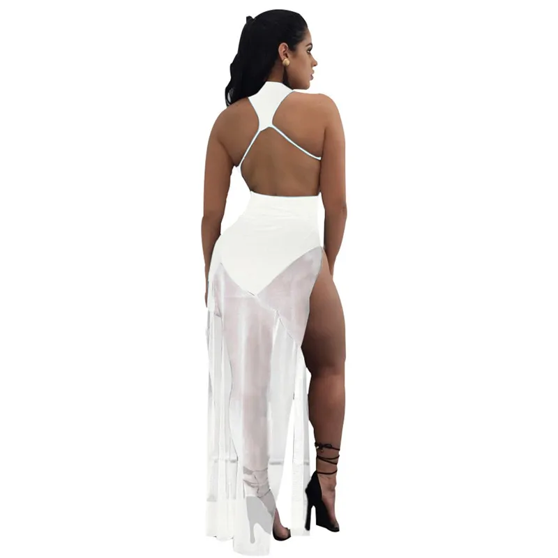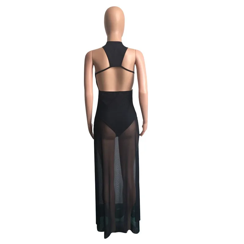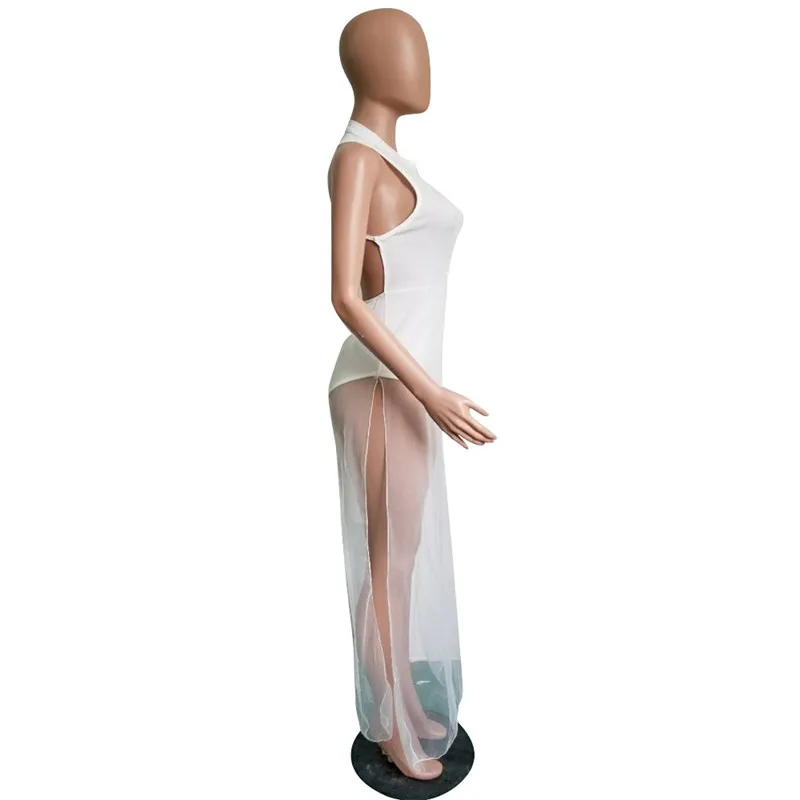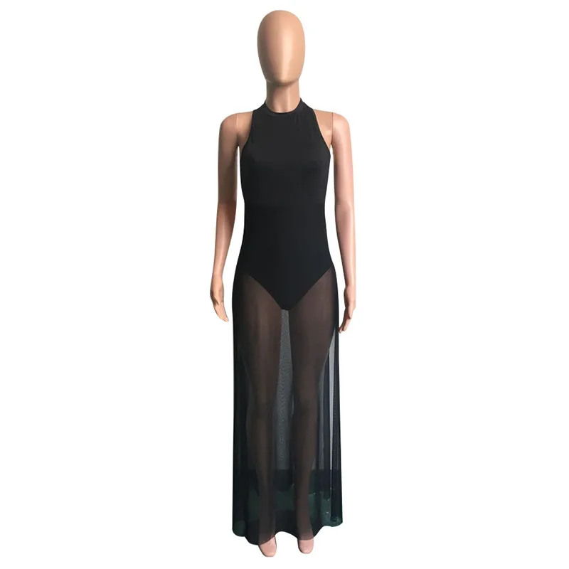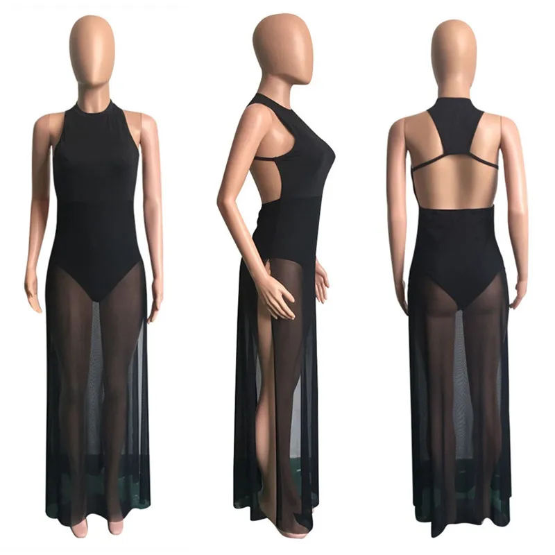 Doyerl Backless Long Black Mesh Dress Women Sexy Sleeveless O-Neck High Split Sheer Maxi Dresses Party Clubwear Outfits Vestidos