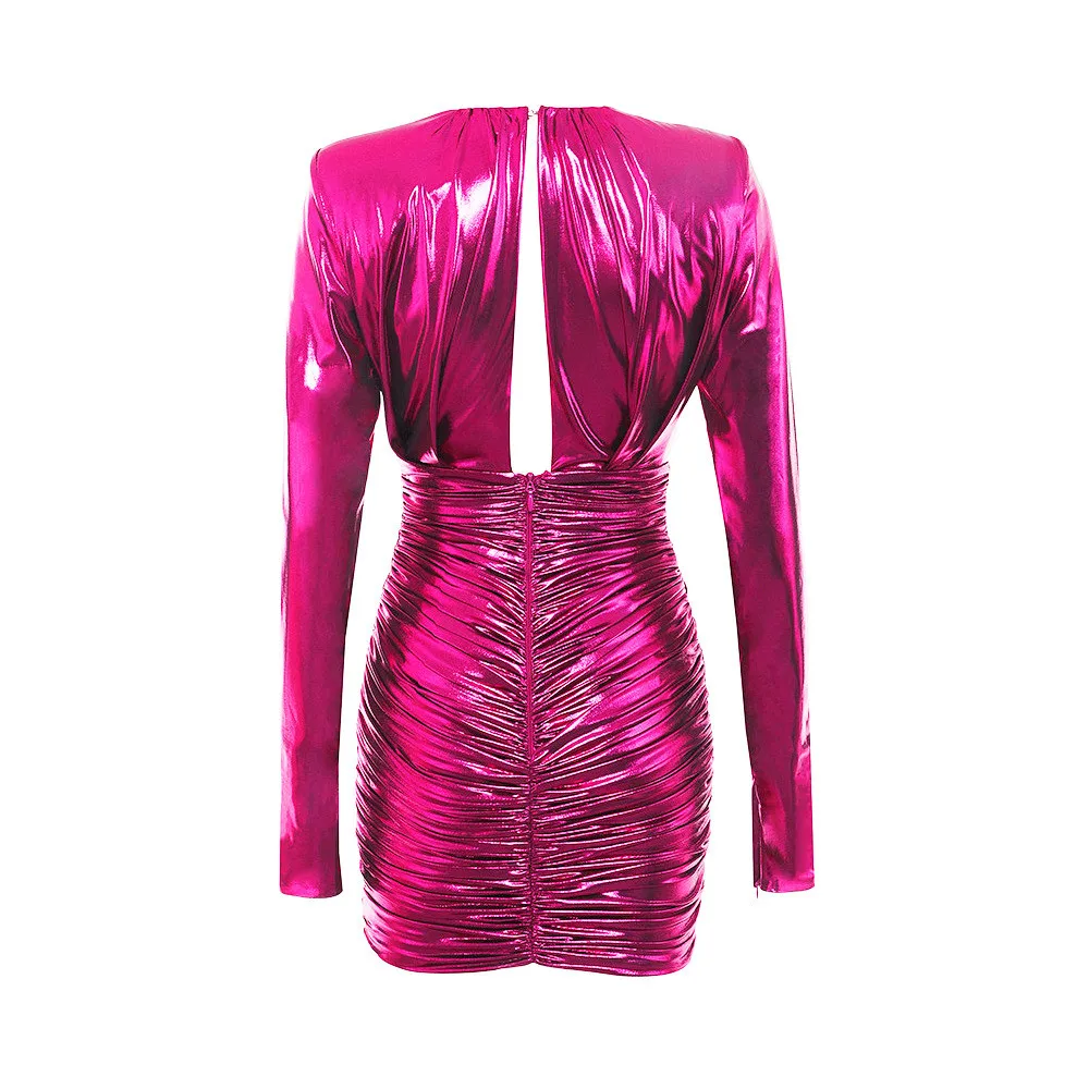 Metallic Shiny Sparkly Long Sleeve Bodycon Dress Women V Neck Ruched Stretchy PU Faux Leather Dress Sexy Night Party Club Dress