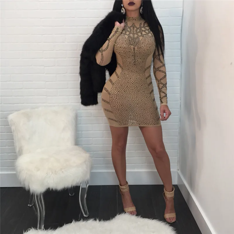 Rhinestone Bodycon Mini Dress Women Winter Long Sleeve Elegant Embellished Celebrity Evening Party Dress NightClub Dresses