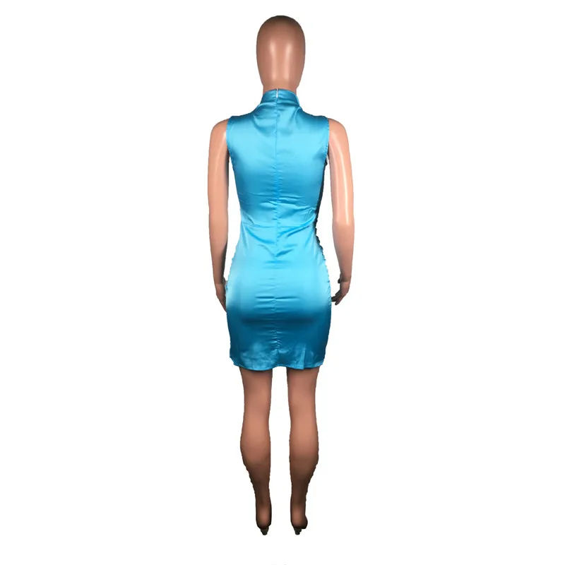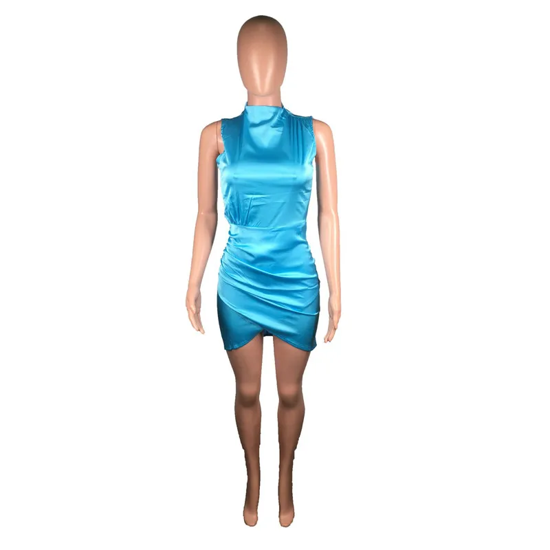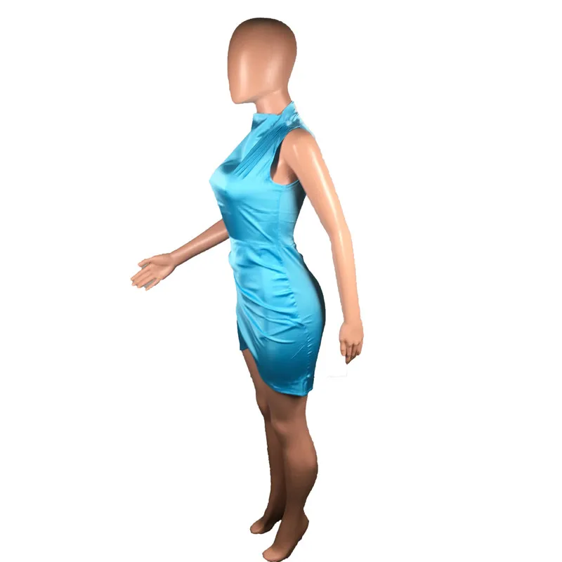 Sexy Elegant Stretch Satin Mini Dress Women Sleeveless Sheath Draped Blue Bodycon Dress Nightclub Short Tight Dresses Robe Femme