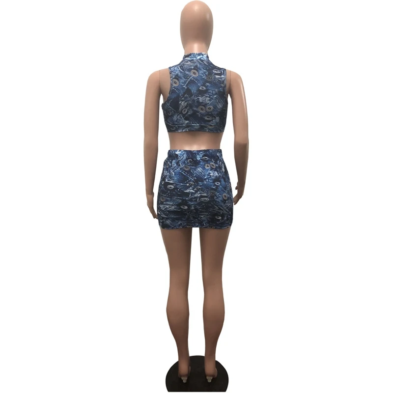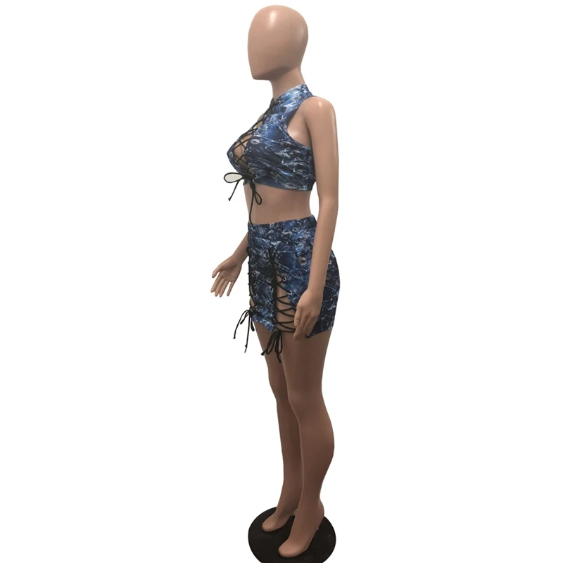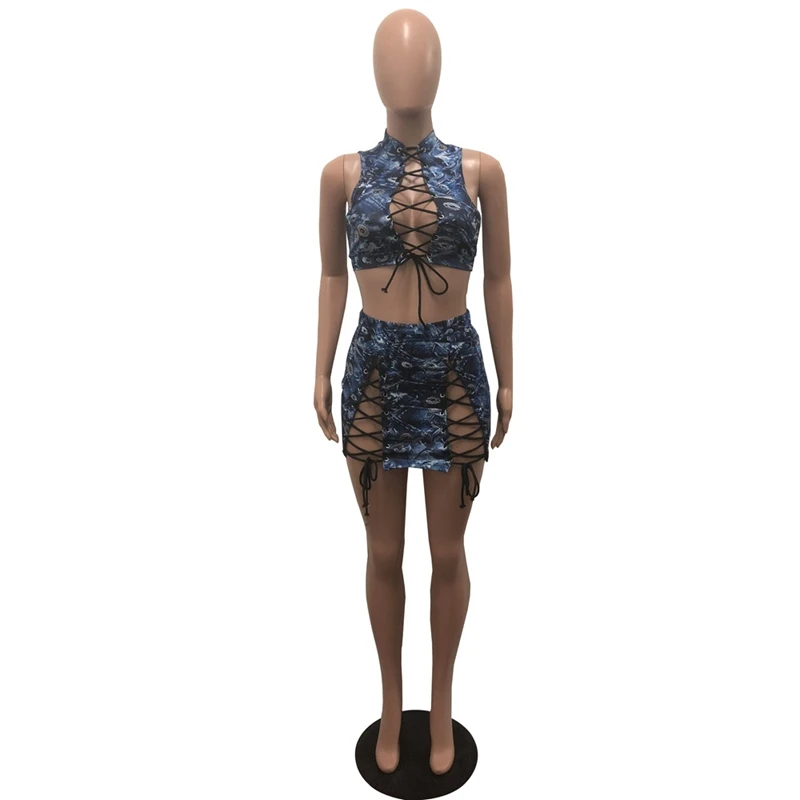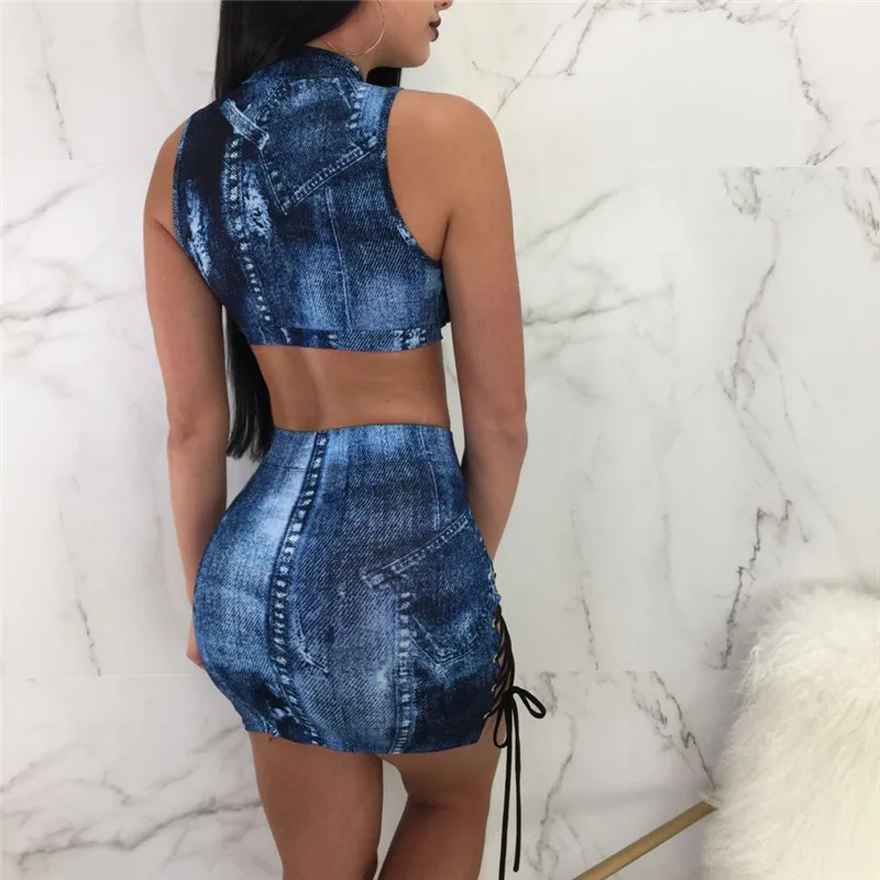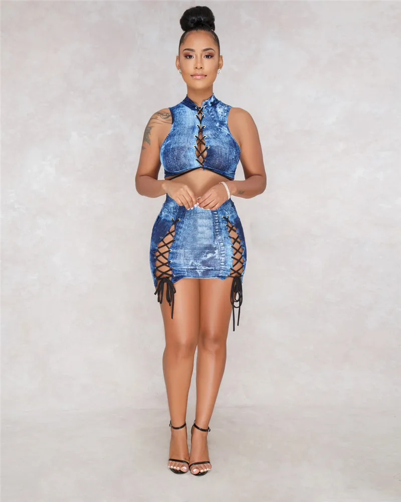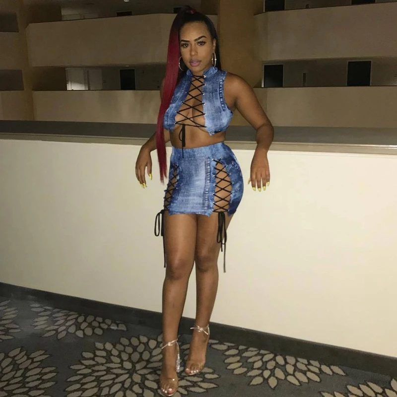 Sexy Lace up Two Piece Sets Women Bodycon Dresses Summer Sleeveless Hollow Out Jeans Crop Top and Skirt Set Party Club Outfit