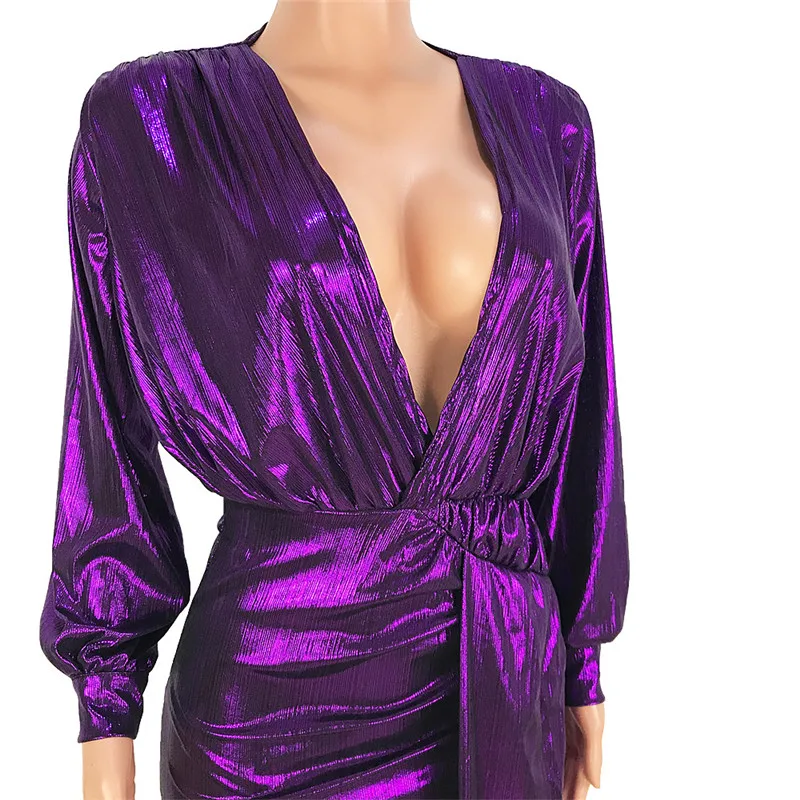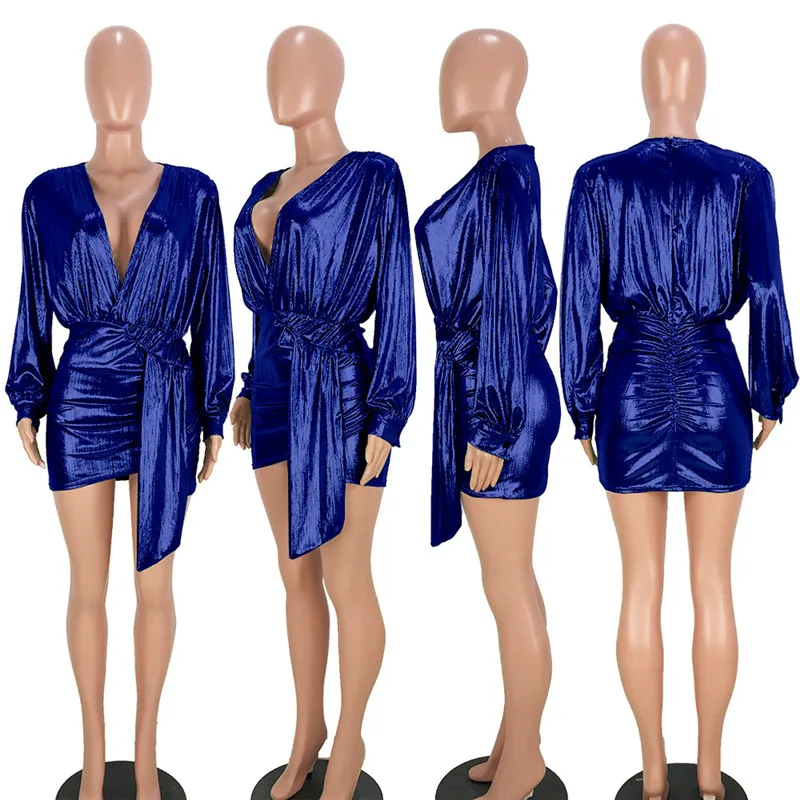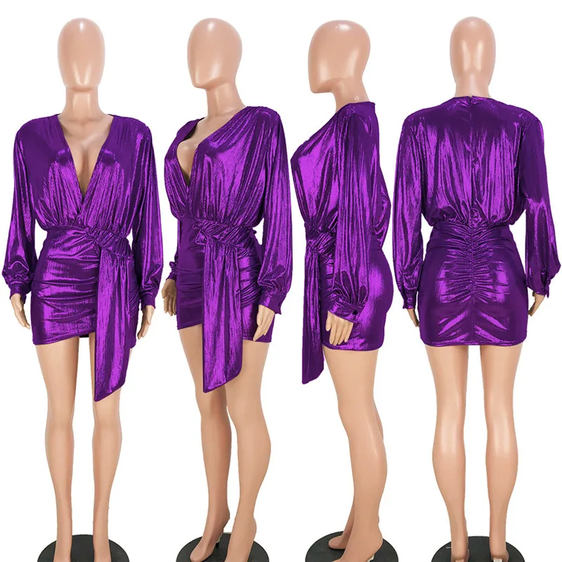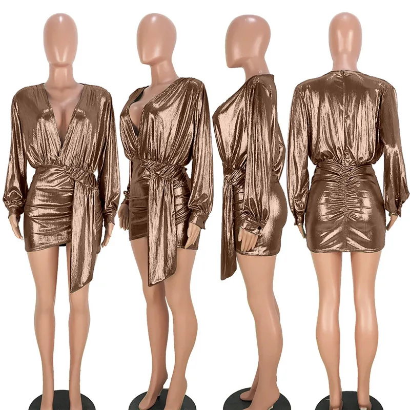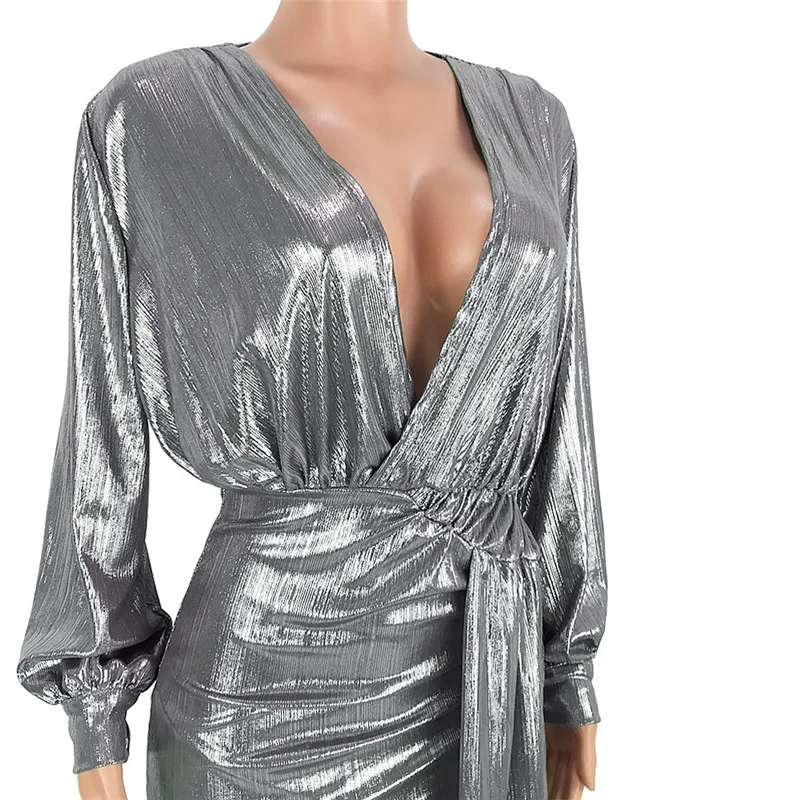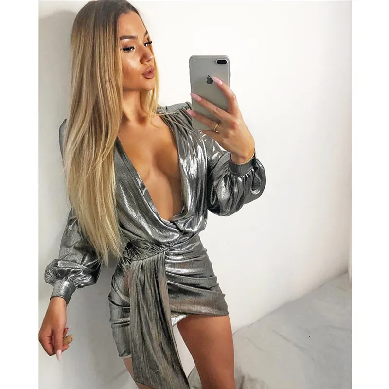 Sexy Silver Long Sleeve Mini Dress New Women Deep V Neck Ruched Night Out Clubwear Metallic Wrap Dress Asymmetrical Club Dresses