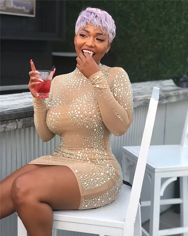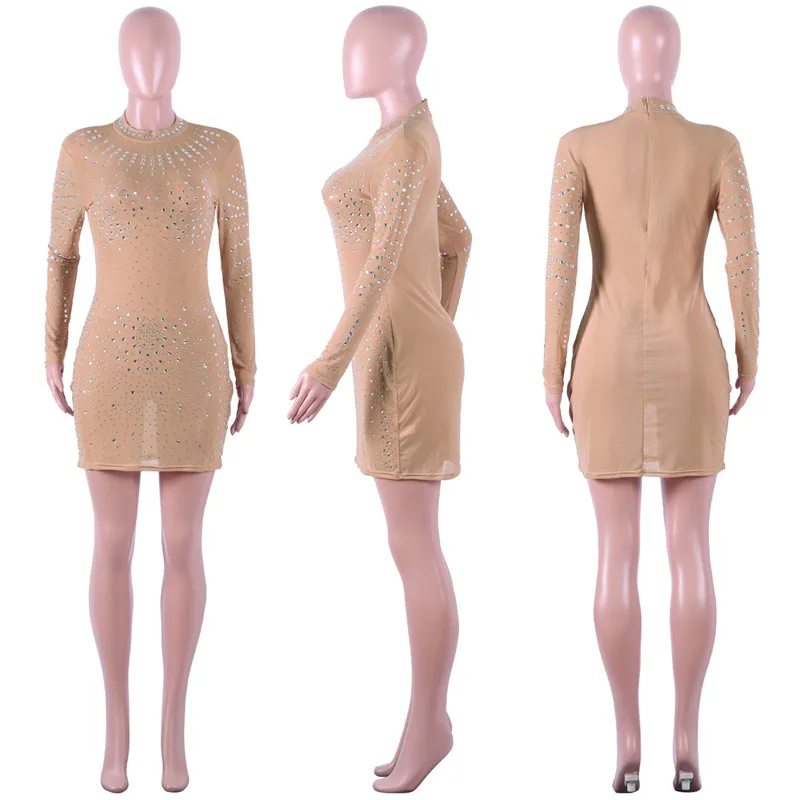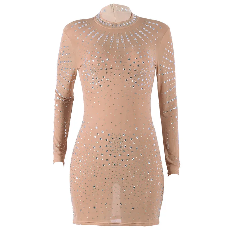Sexy Sparkly Rhinestone Black Bodycon Dress Women Long Sleeve Mesh See Through Sheath Mini Dress Elegant Birthday Party Dresses