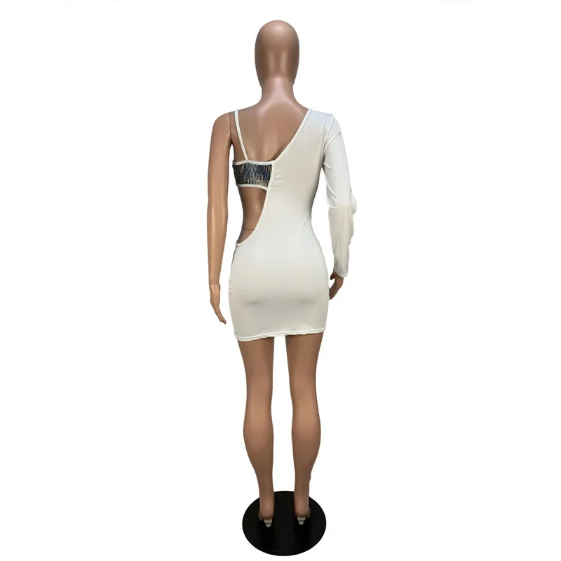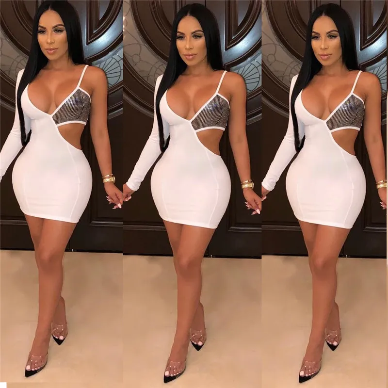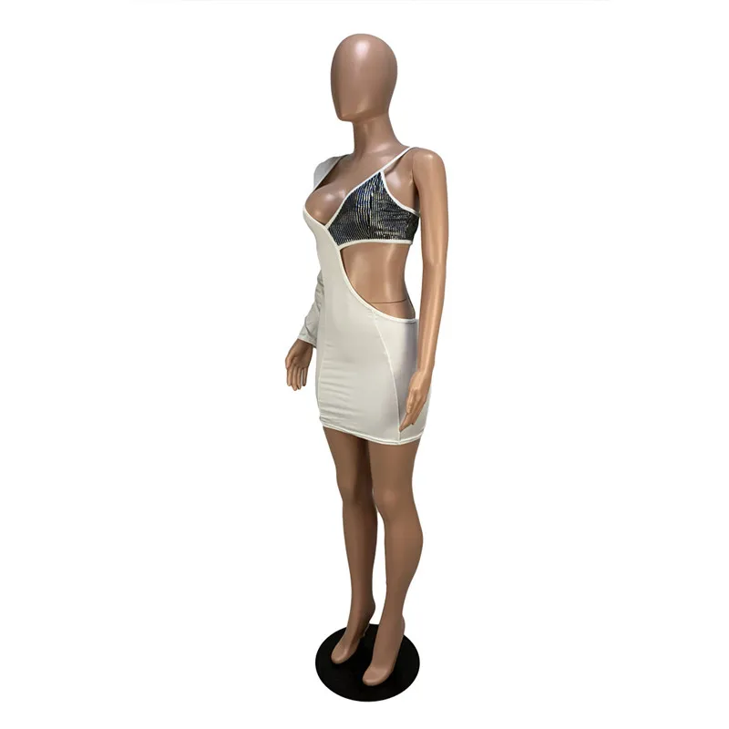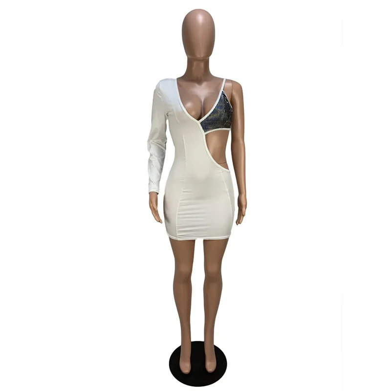 Sexy V Neck White Bodycon Mini Dress Women Autumn One Shoulder Long Sleeve Sequin Patchwork Cut Out Night Club Party Dresses