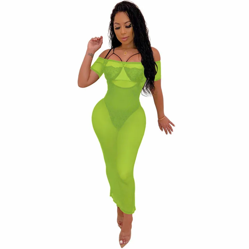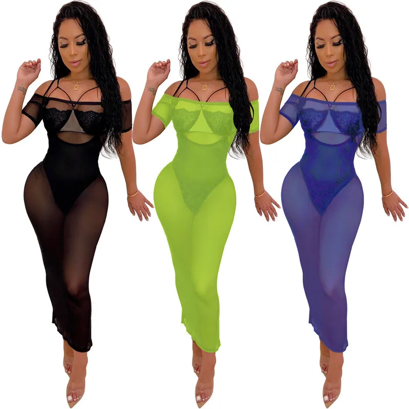 Women Black Sheer Mesh Dress Sexy Night Club Dresses Off the Shoulder See Through Ankle-length Long Party Exotic Dresses Female
