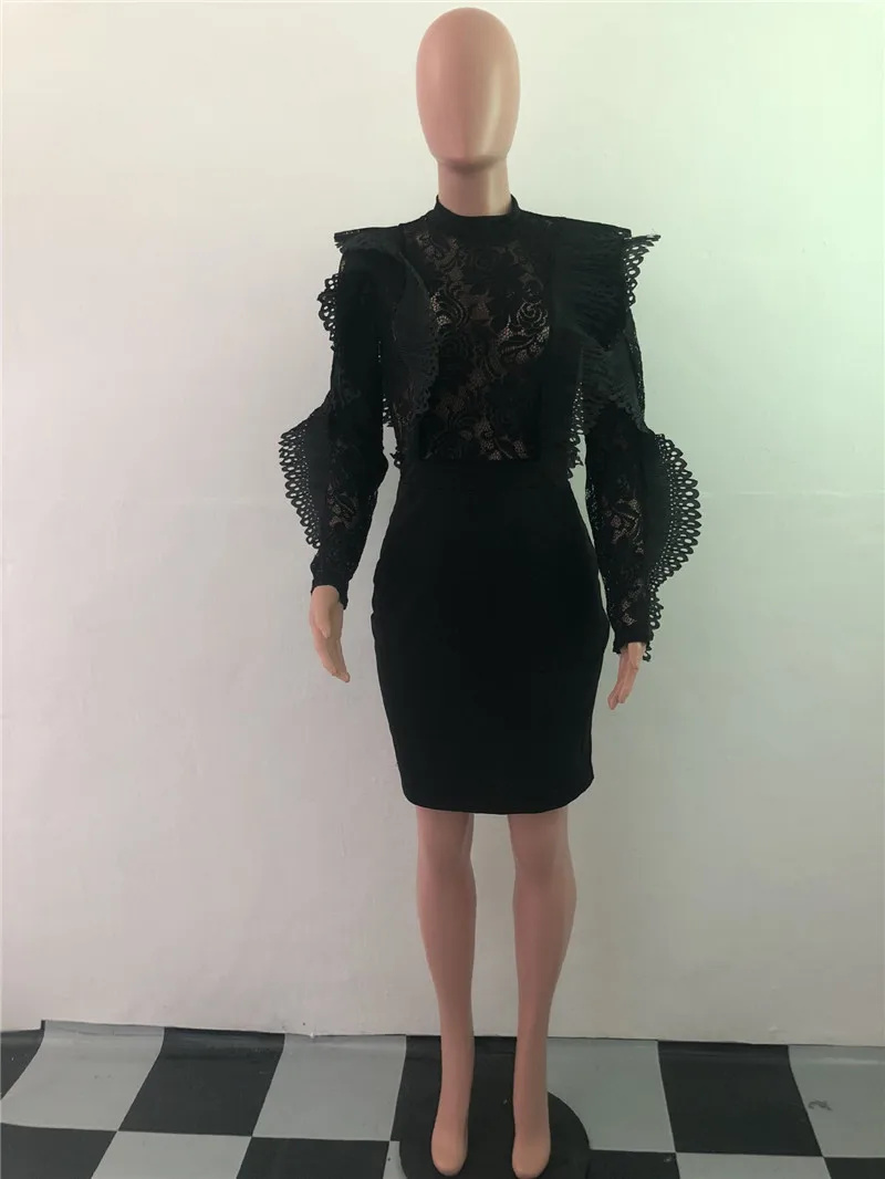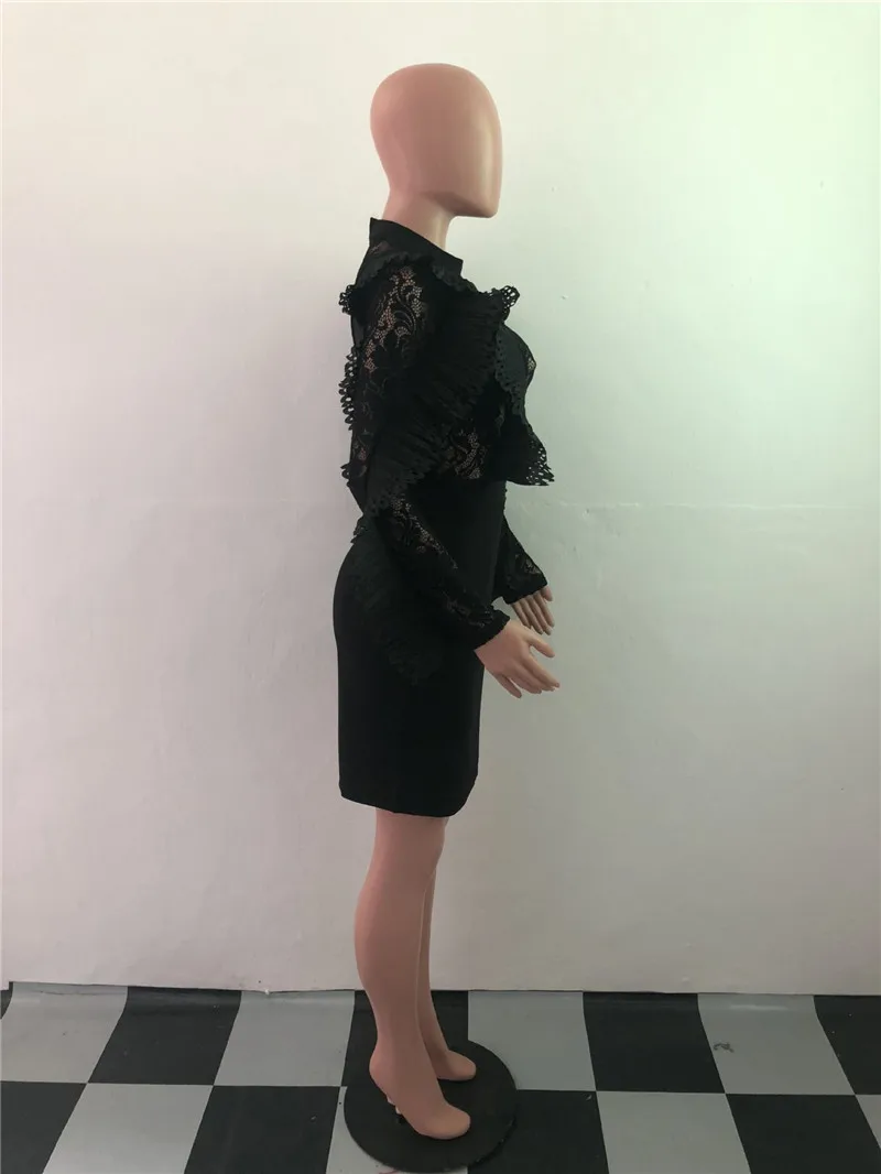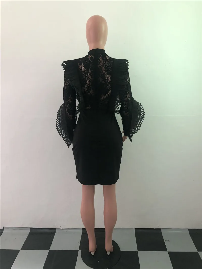 Women Long Sleeve Black Lace Dress Sexy Hollow Out Sheer Elegant Christmas Bodycon Dress Luxury Club Short Party Dresses Robe