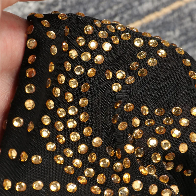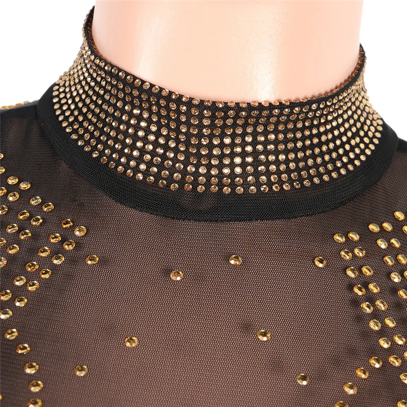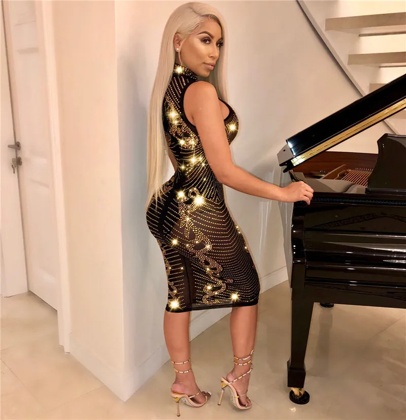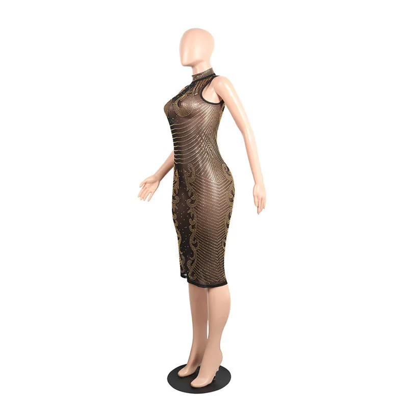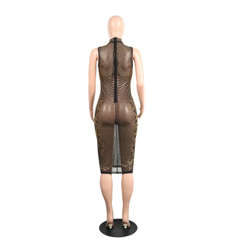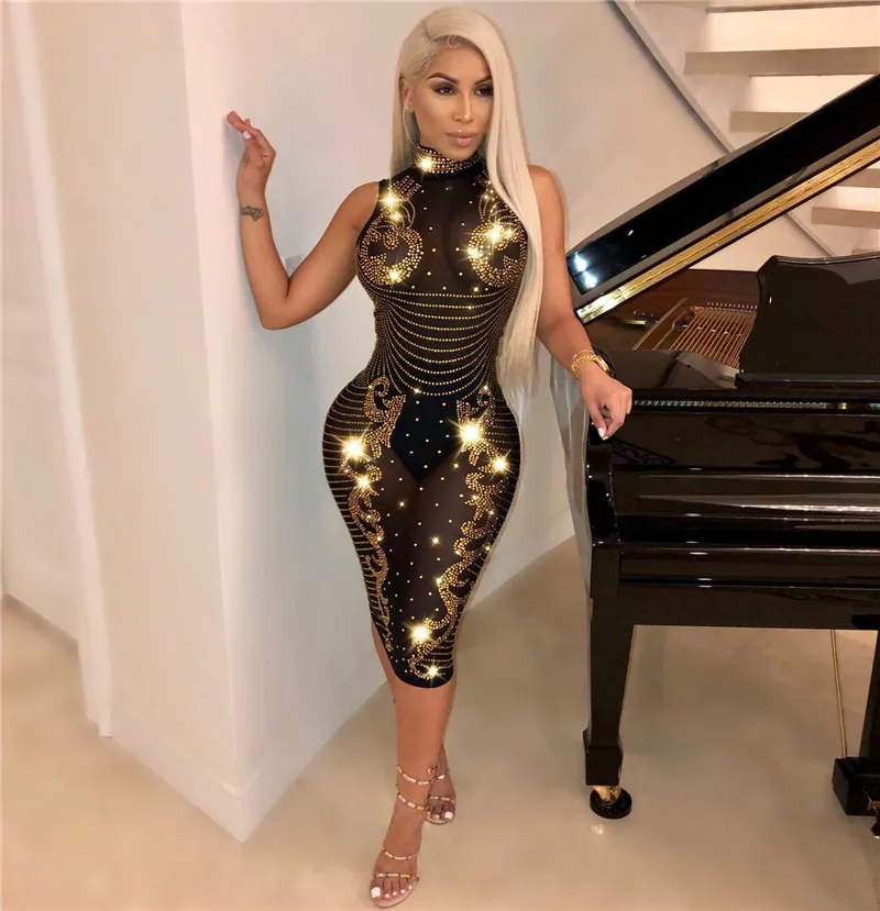 Women Party Clubwear Sexy Sheer Mesh Dress Rhinestone Diamonds Sleeveless See Through Knee Length Black Sparkly Bodycon Dress