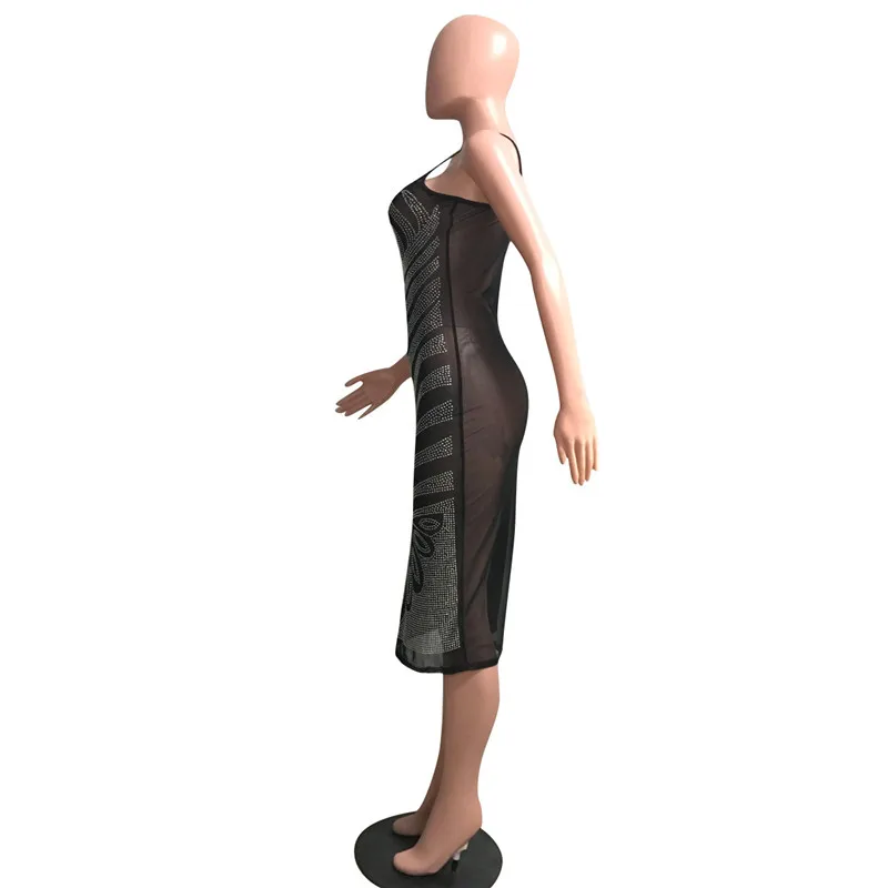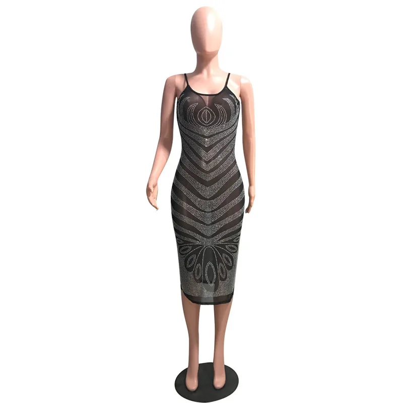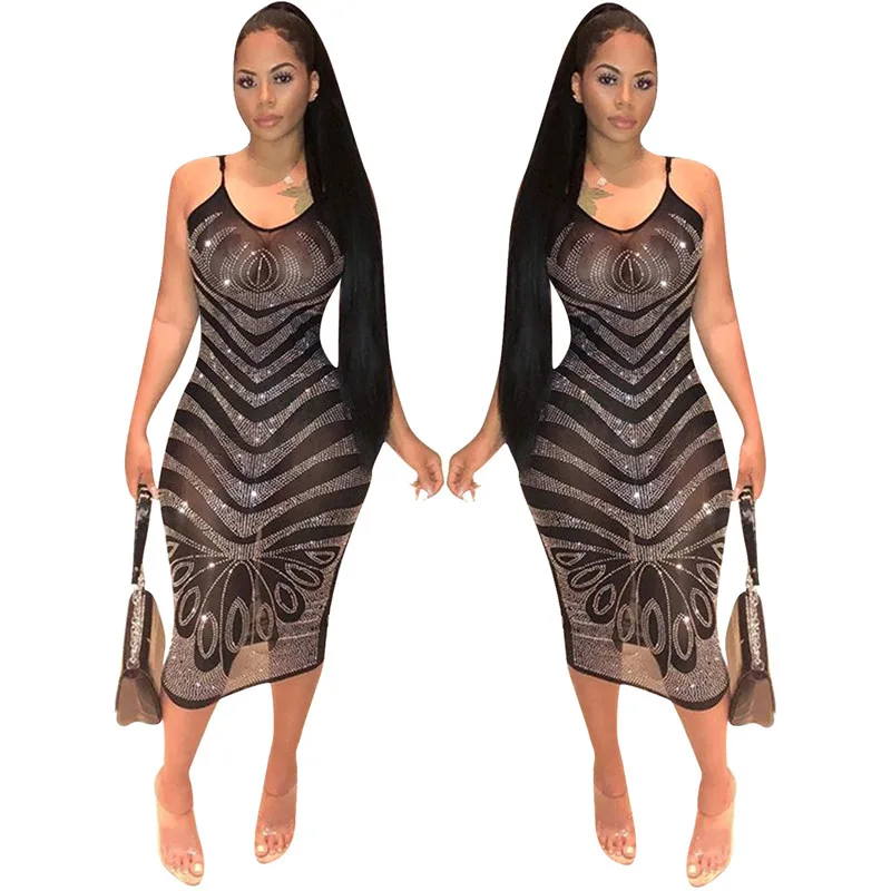 Women Sexy Dress Club Wear Black Sheer Mesh Dress Elegant Rhinestone Diamond Birghtday Outfits See Through Bodycon Party Dresses