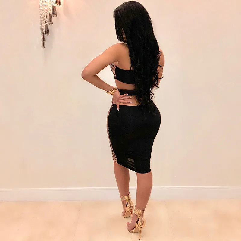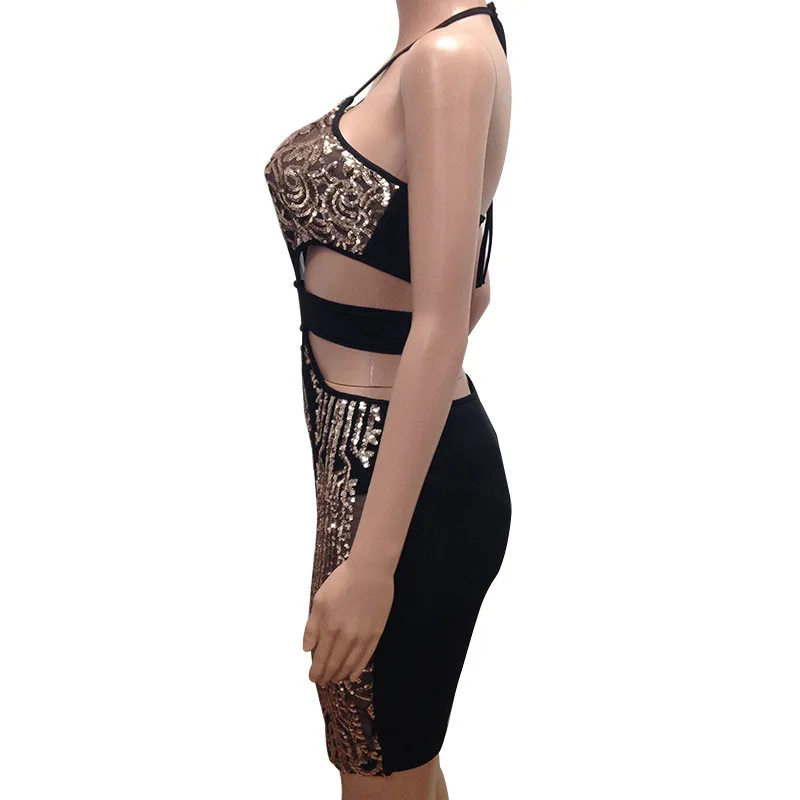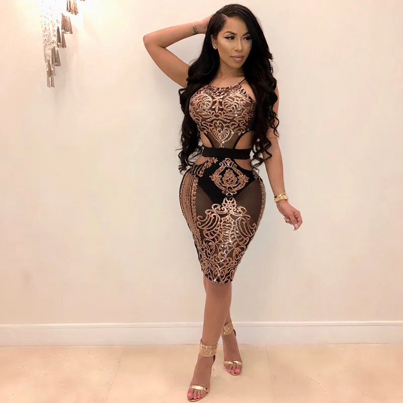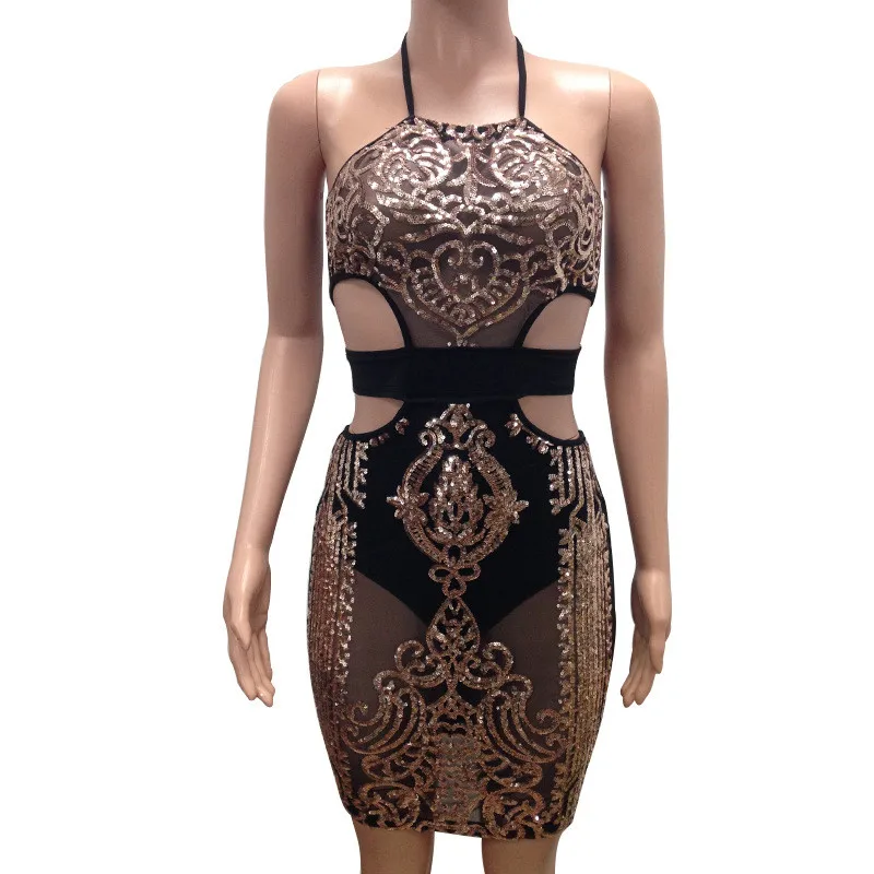 Womens Rose Gold Sequin Dress Sexy Mesh Sheer Hollow Out Halter Sheath Party Club Wear Sparkly Dresses Vestidos De Festa