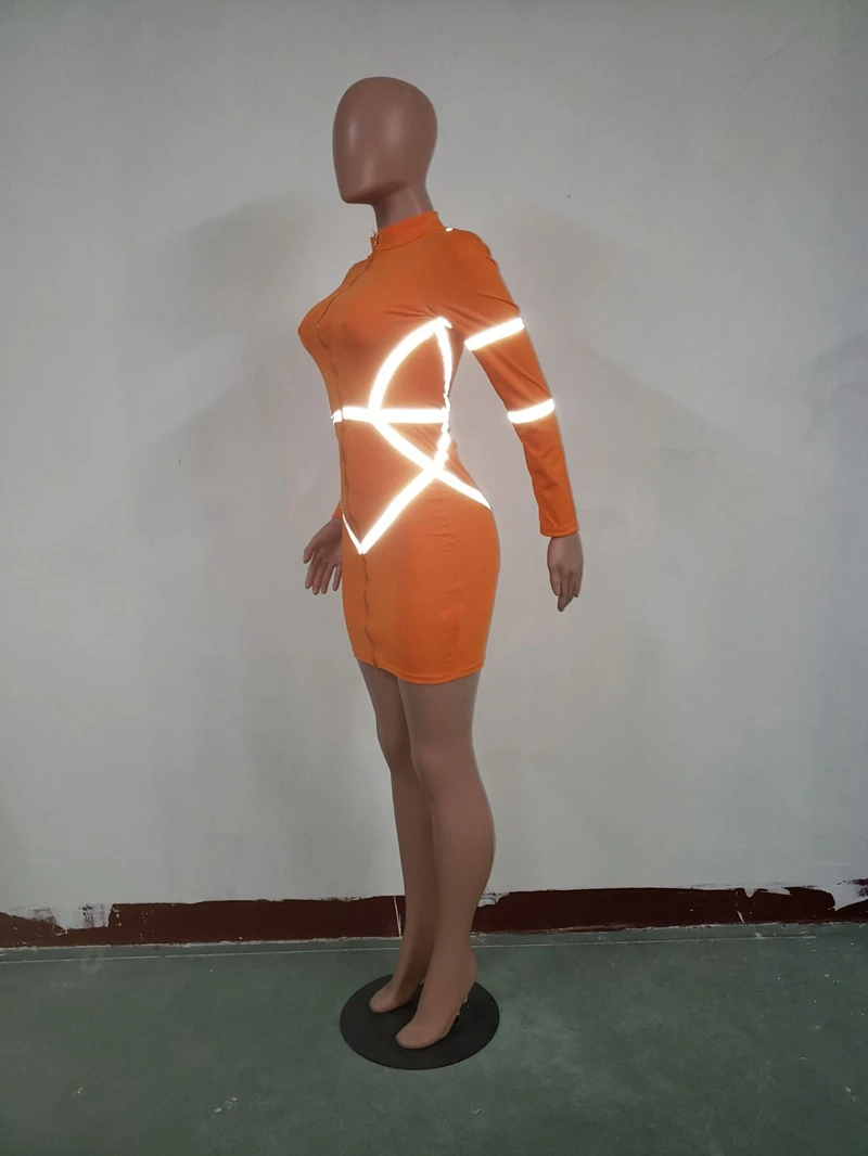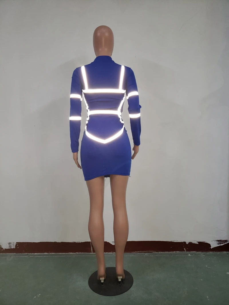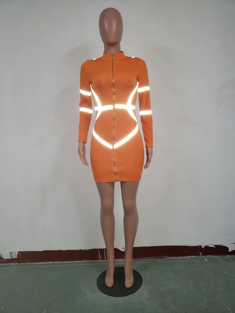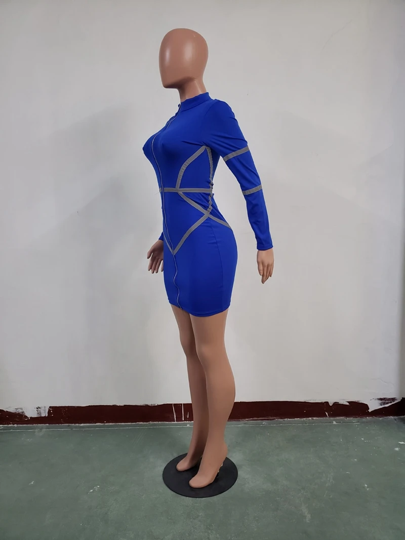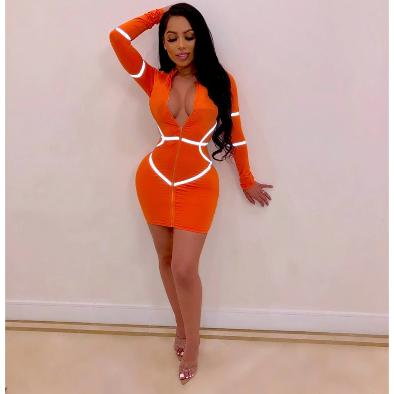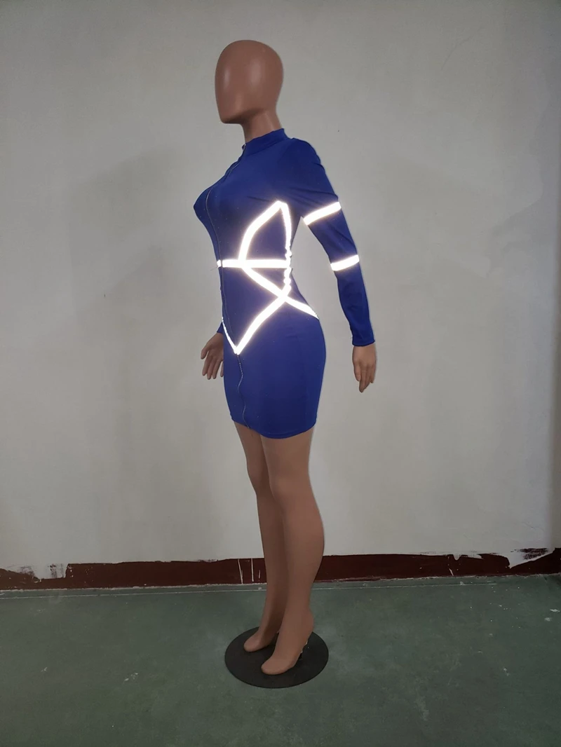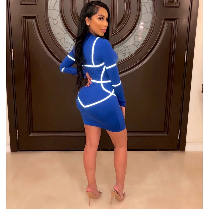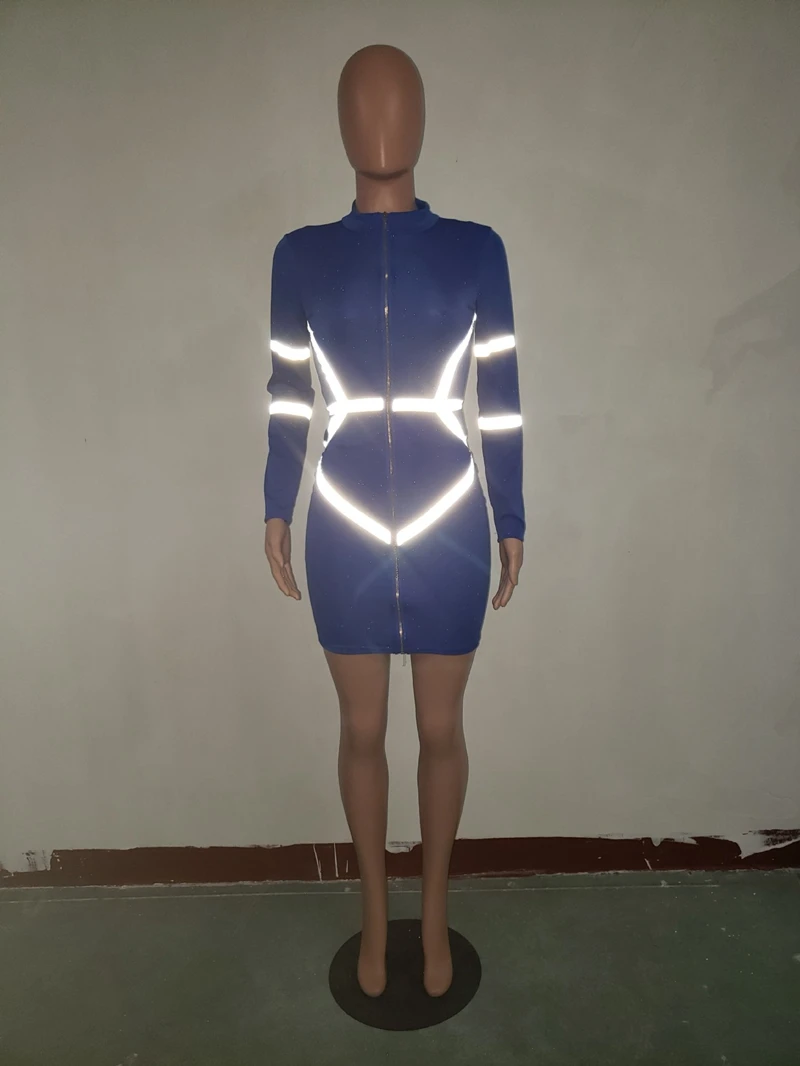 Zipper Front Long Sleeve Sexy Bodycon Dress Women Autumn Winter Reflective Bandage Party Dresses Female Mini Night Club Dress