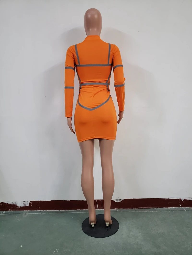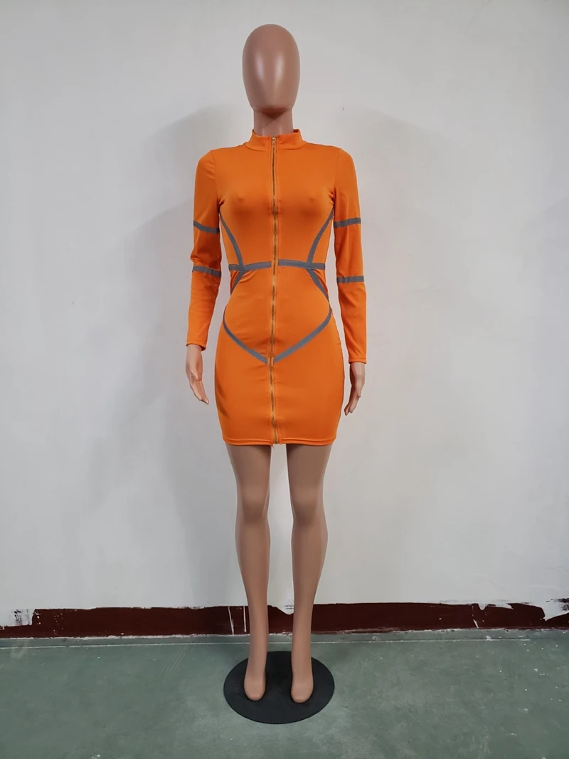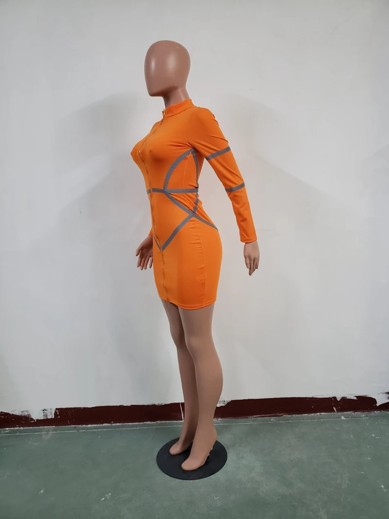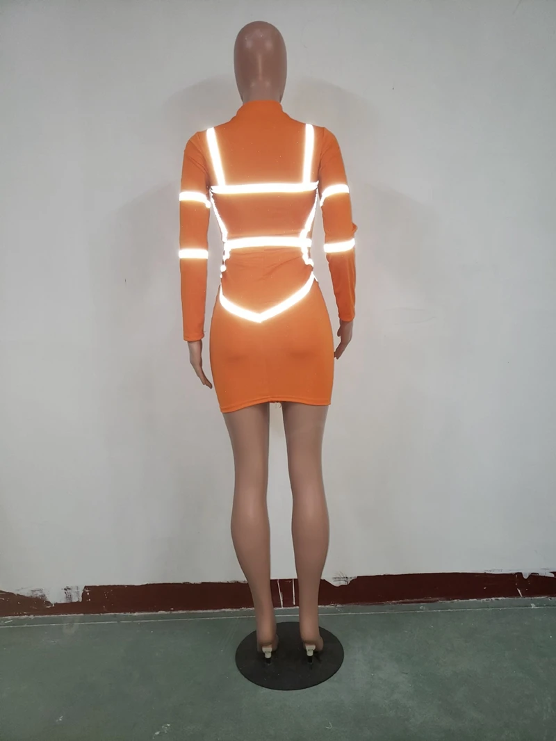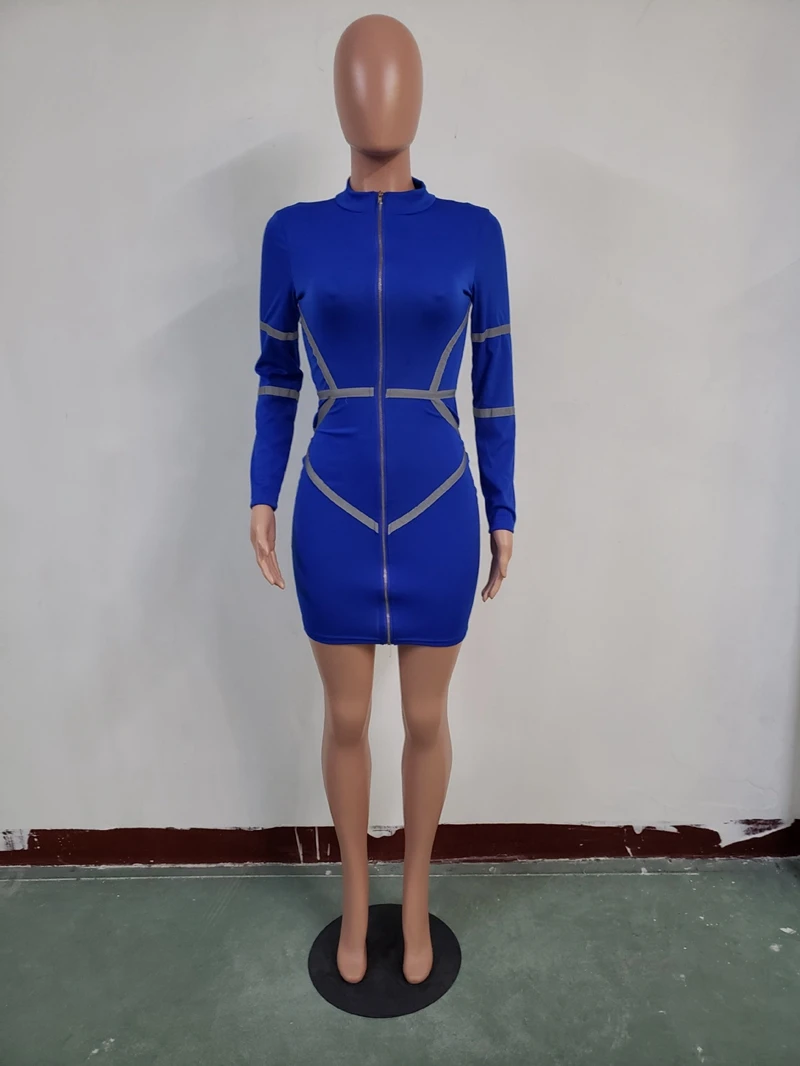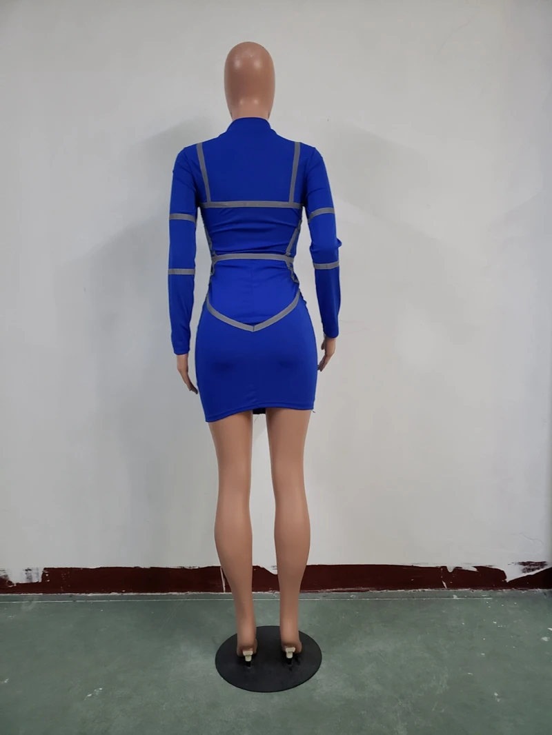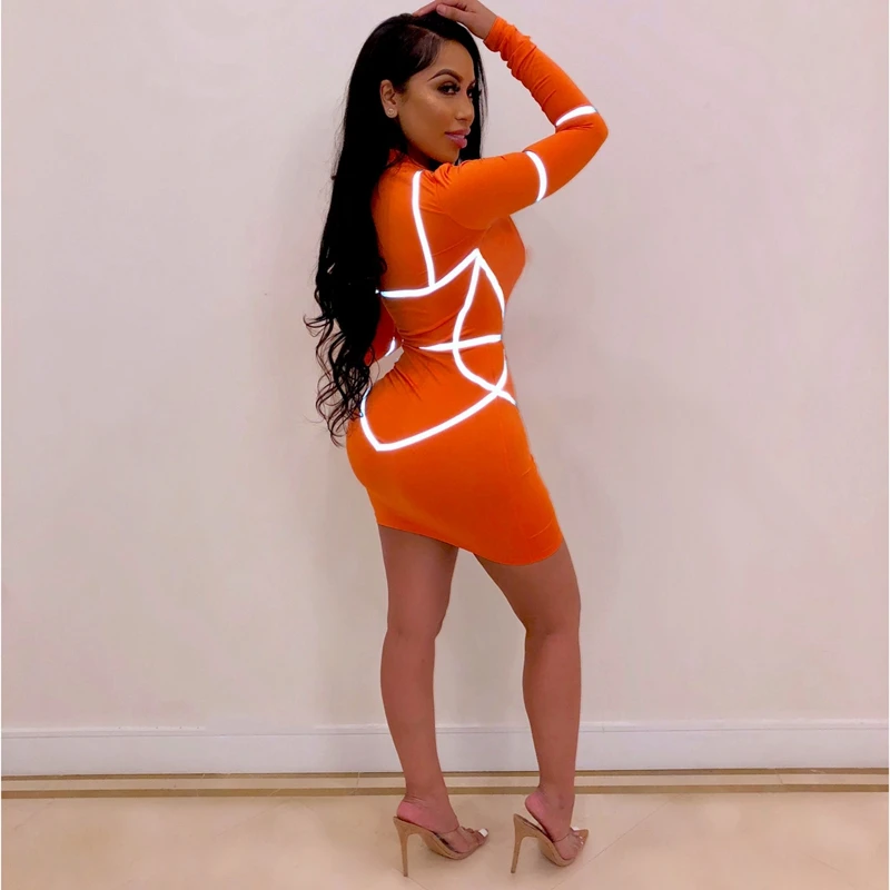 Zipper Front Long Sleeve Sexy Bodycon Dress Women Autumn Winter Reflective Bandage Party Dresses Female Mini Night Club Dress