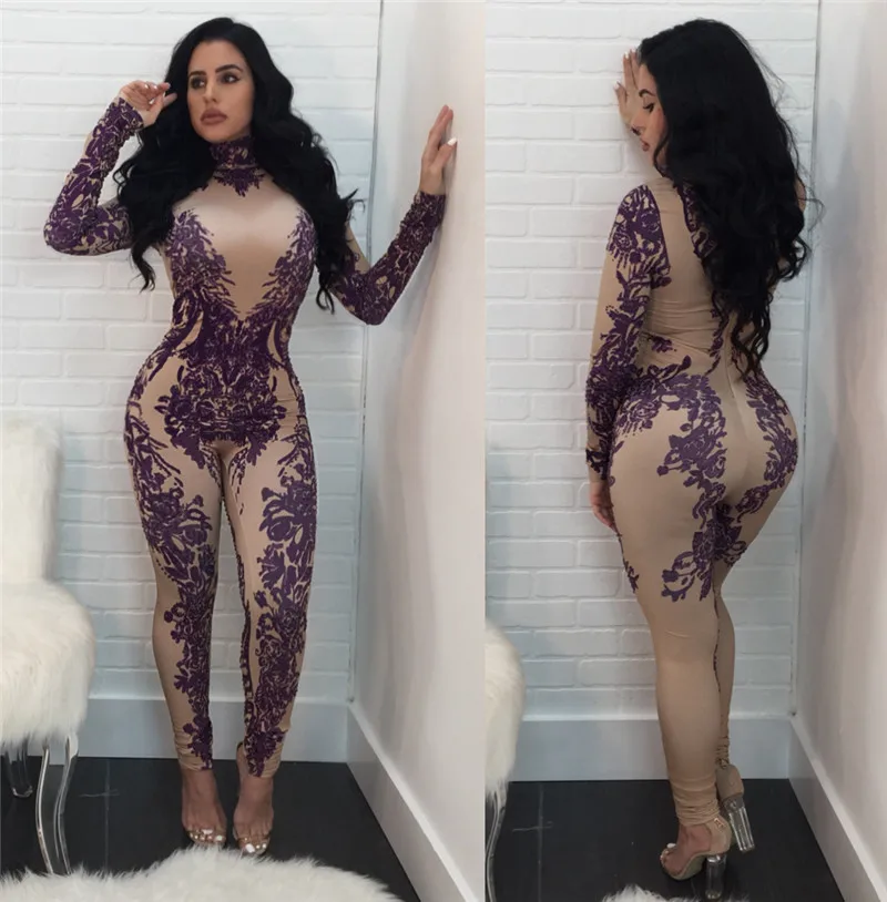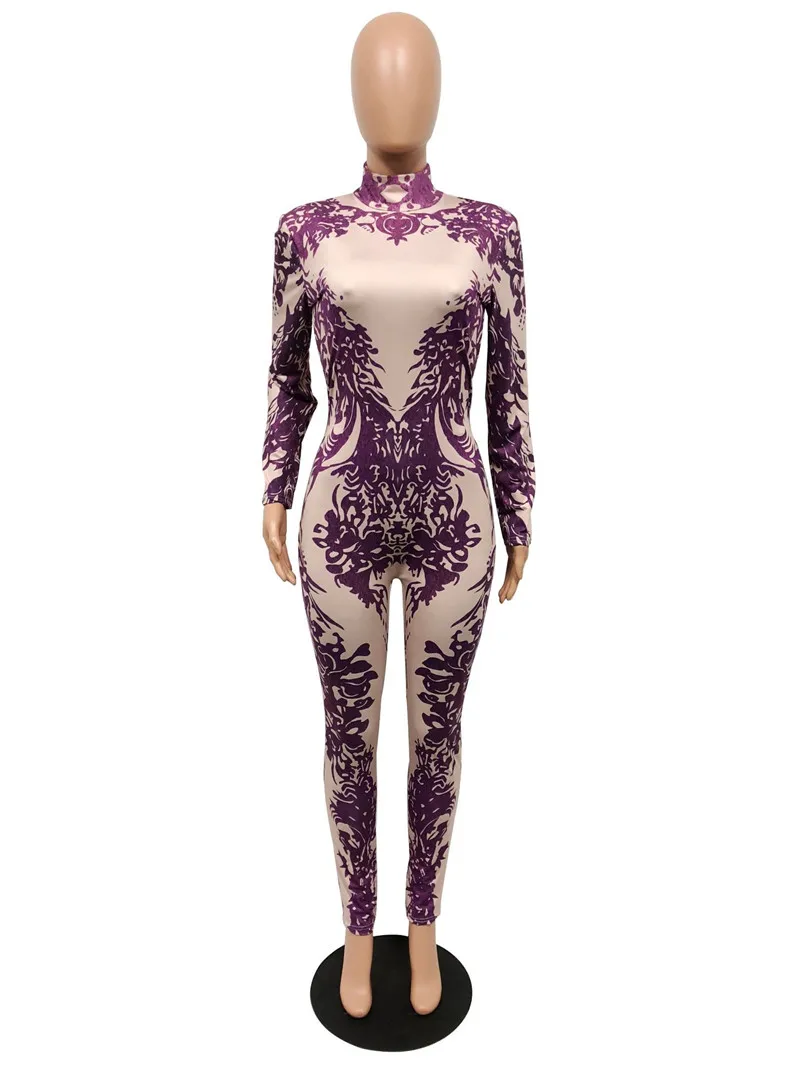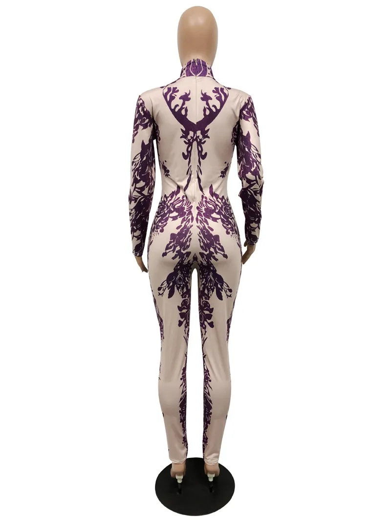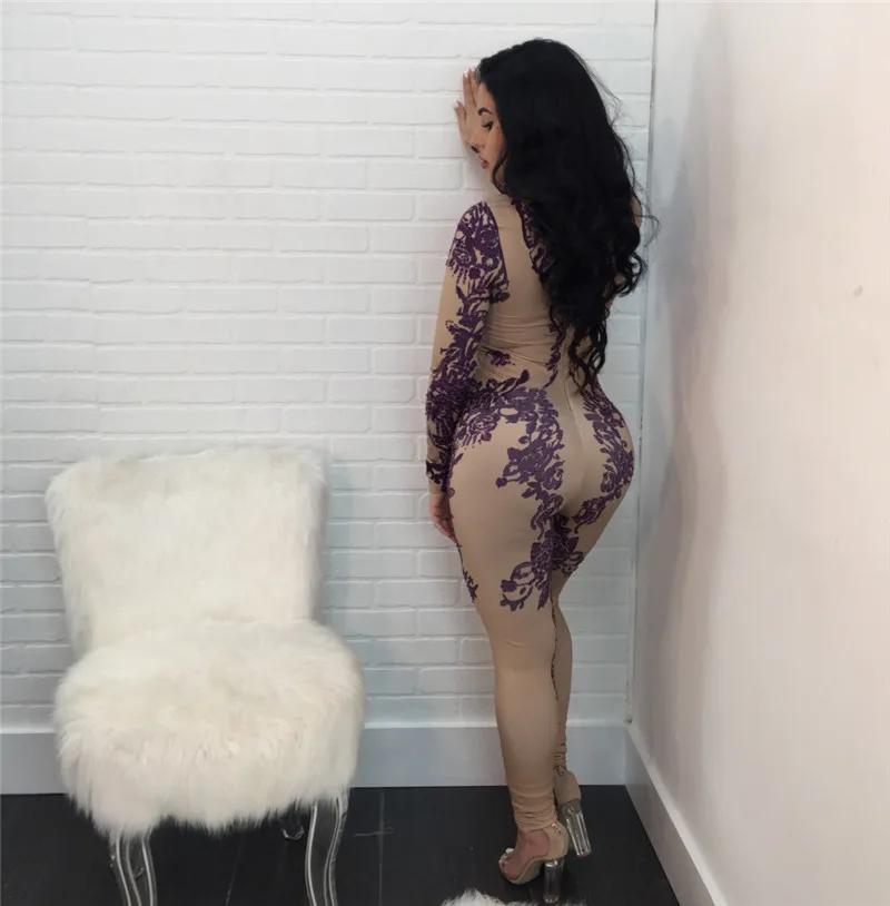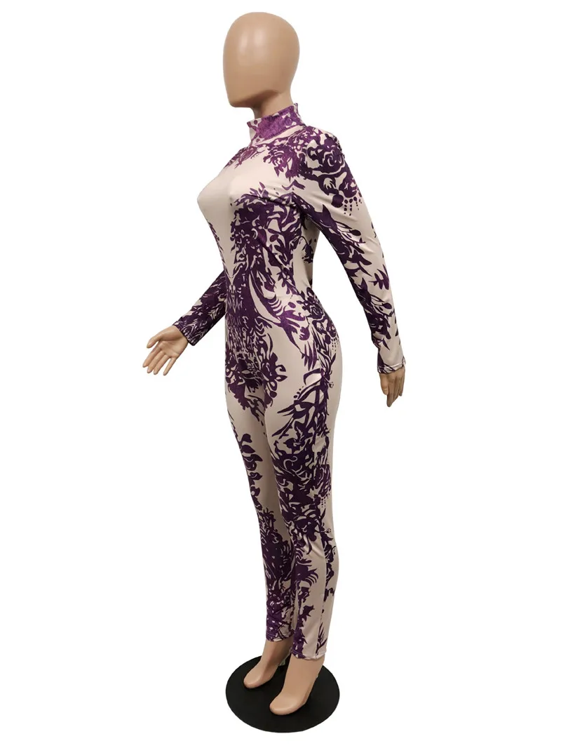 Floral Printed Bodycon Jumpsuit Women Winter Long Sleeve Skinny Long Pants Romper Tight Nightclub Party Jumpsuits Overalls