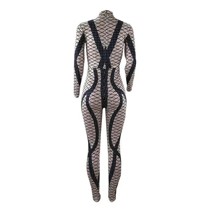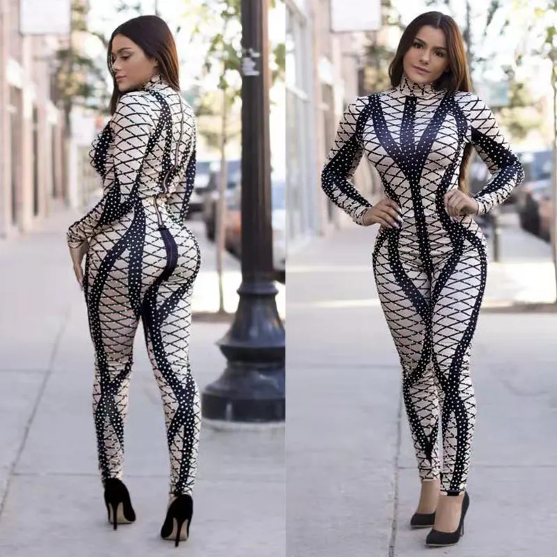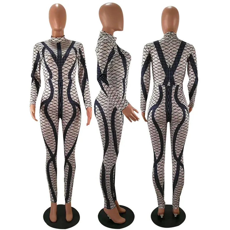 Sexy Printed Jumpsuit Women Turtleneck Bodysuit Long Sleeve Pants Romper Leotard Bandage Bodycon Jumpsuit Catsuit