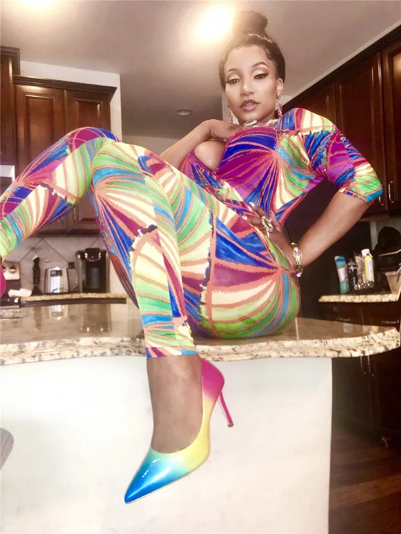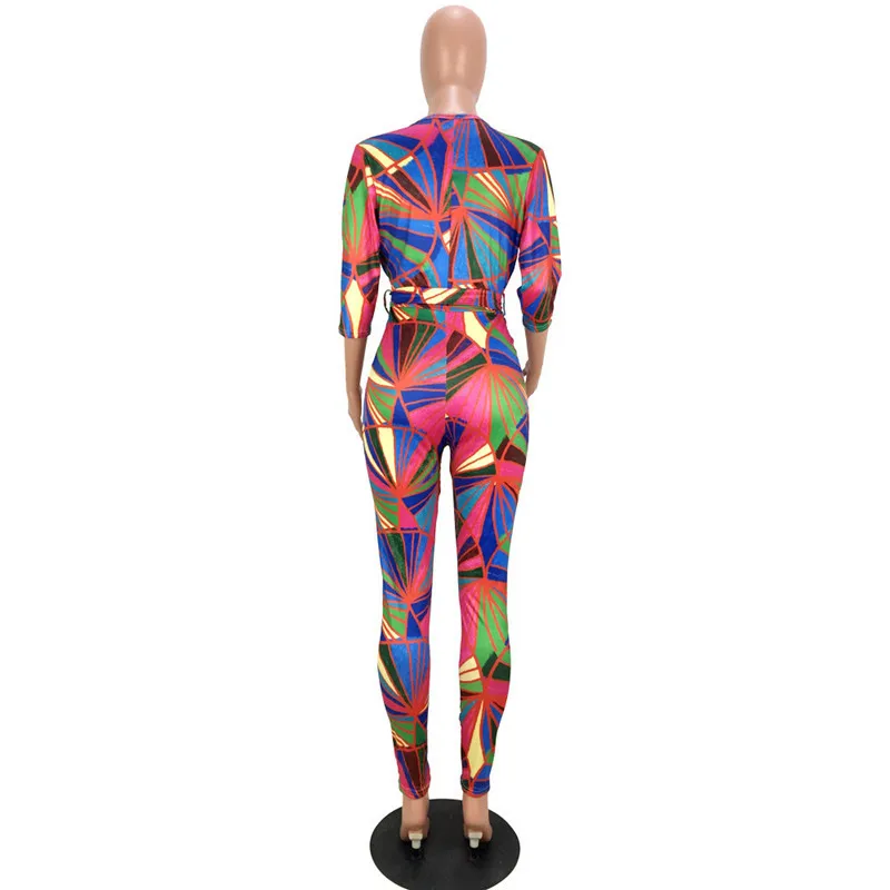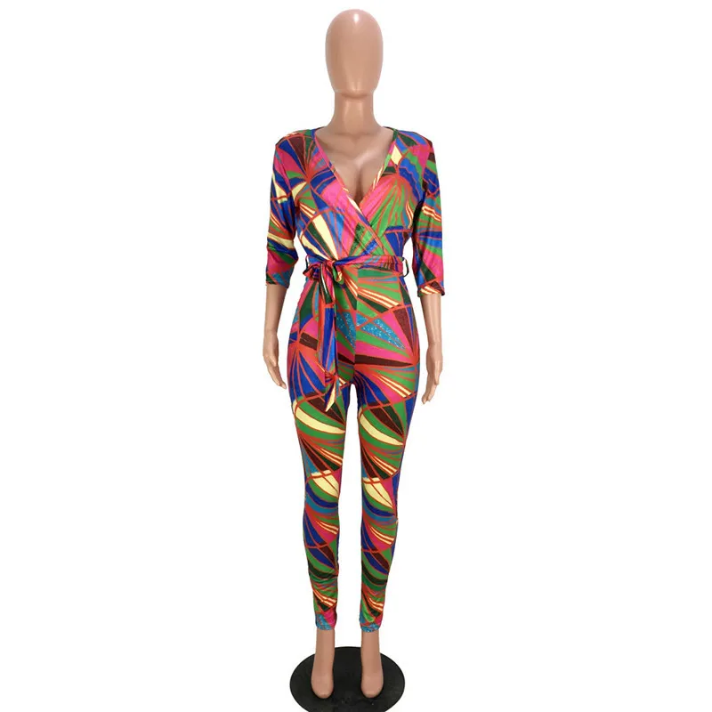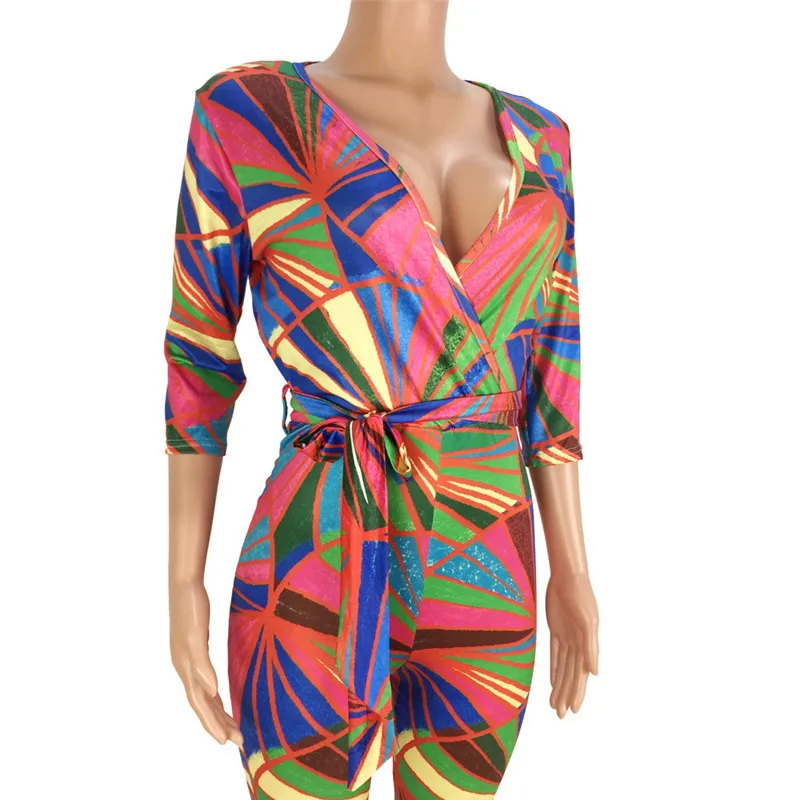 Geometric Print Deep V Neck Sexy Jumpsuit Women Autumn 3/4 Long Sleeve Club Party Playsuits High Waist Bodycon Jumpsuit Sashes