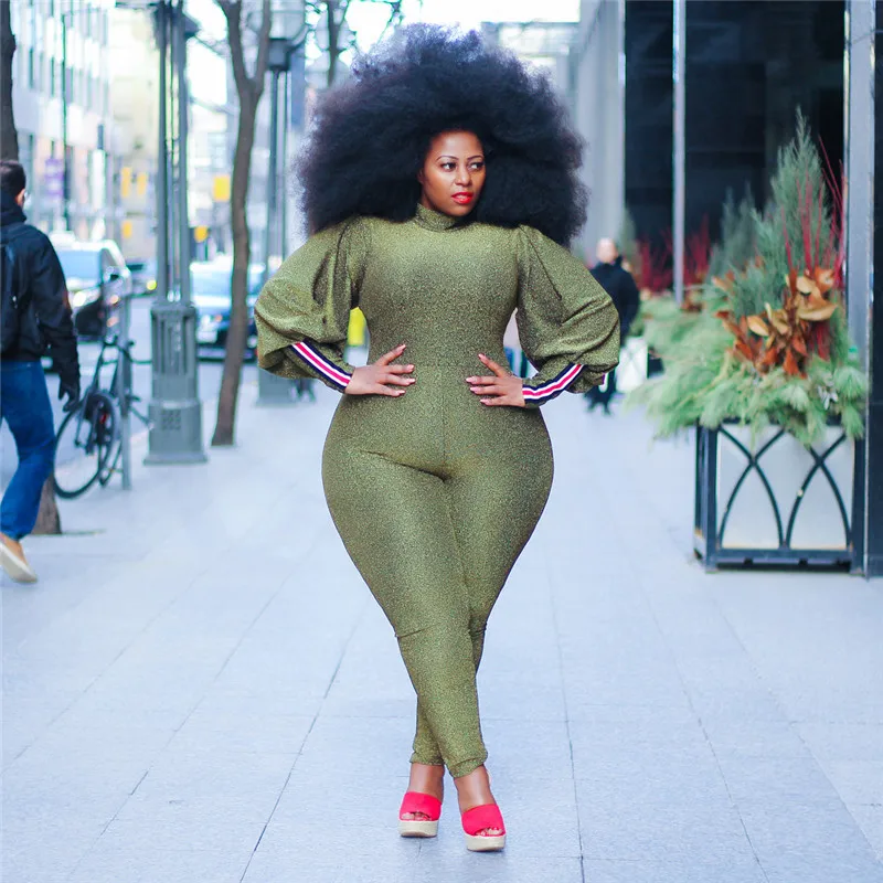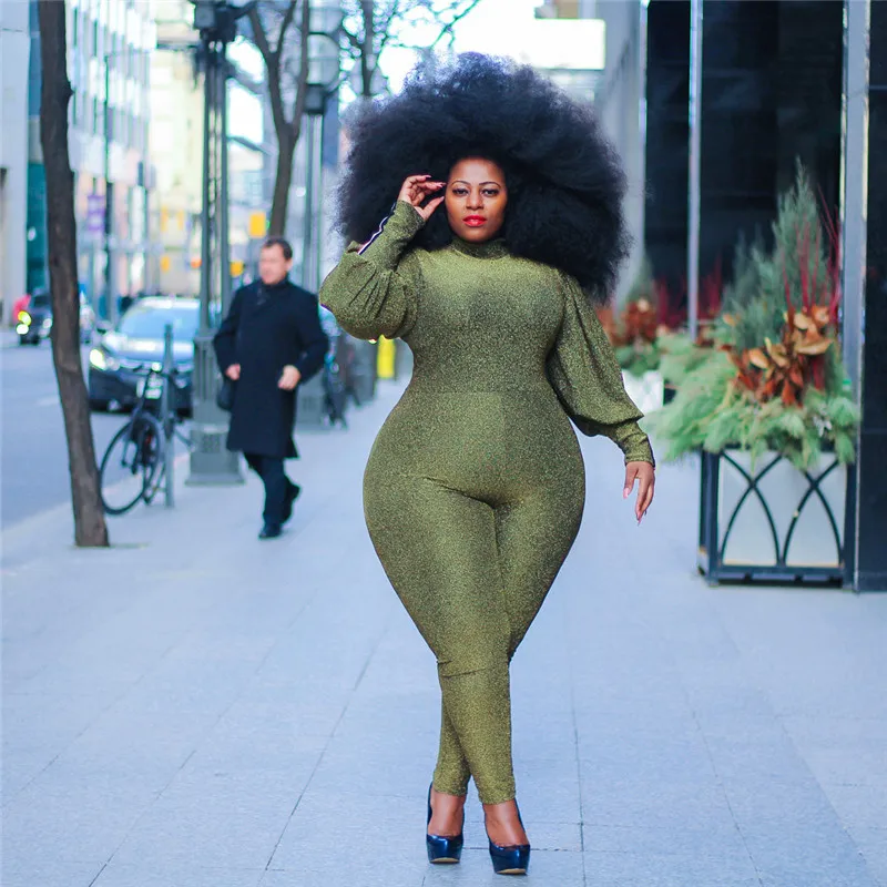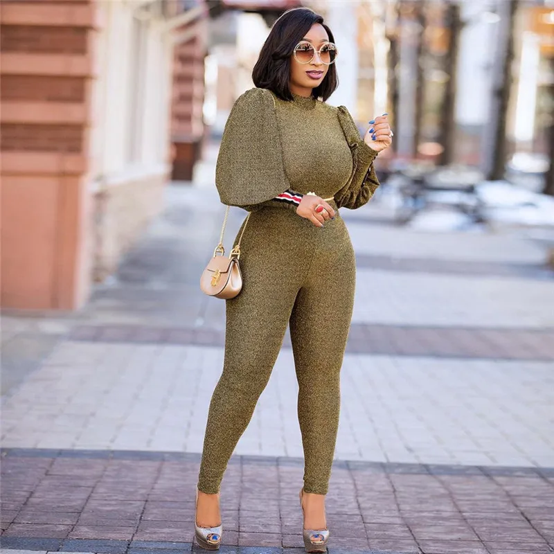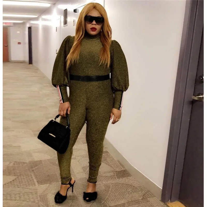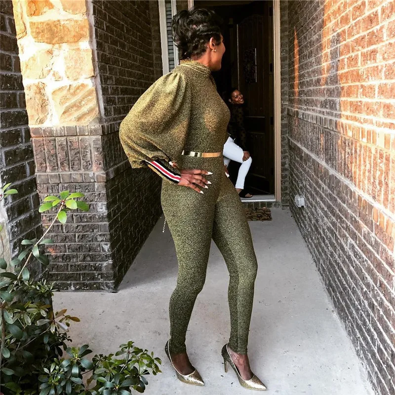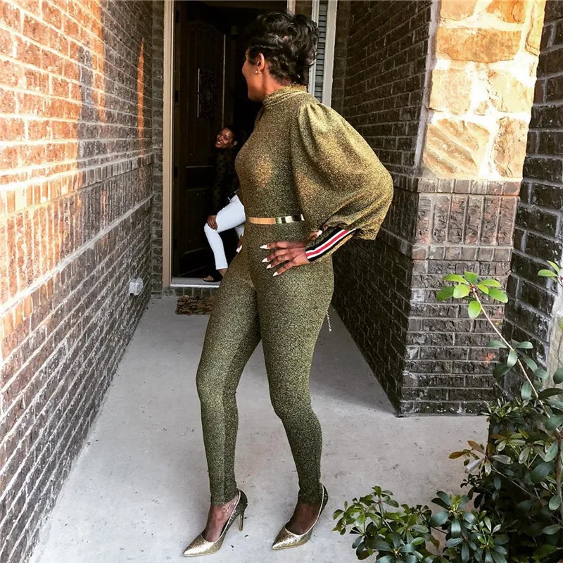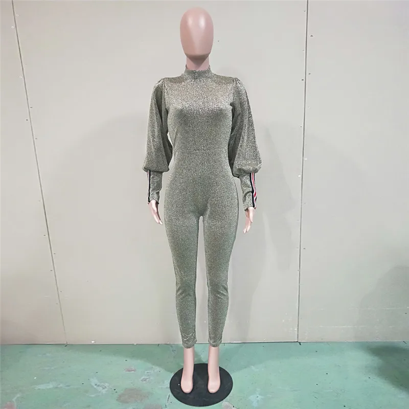 Gold Glitter Bodycon Jumpsuit Romper Women Autumn Winter High Neck Lantern Long Sleeve One Piece Sparkly Party Jumpsuit Catsuit