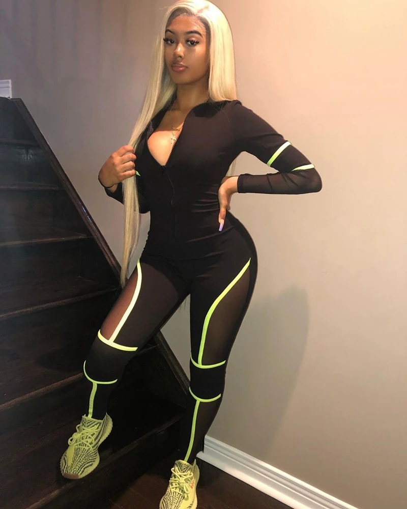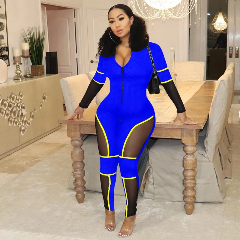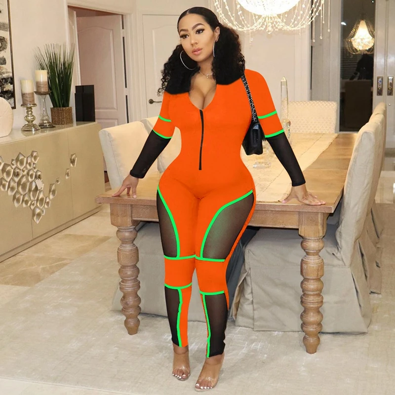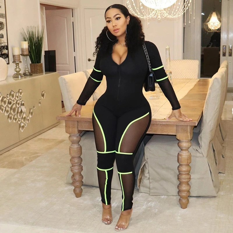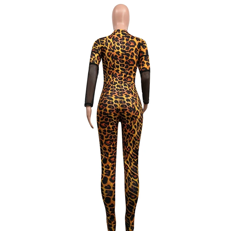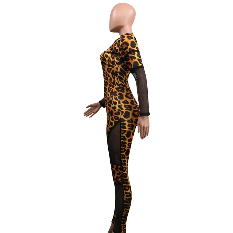 Leopard Bodycon Sexy Jumpsuits Mesh Patchwork Tights Zip Long Sleeve Party Romper Fall Autumn Jumpsuit Overalls