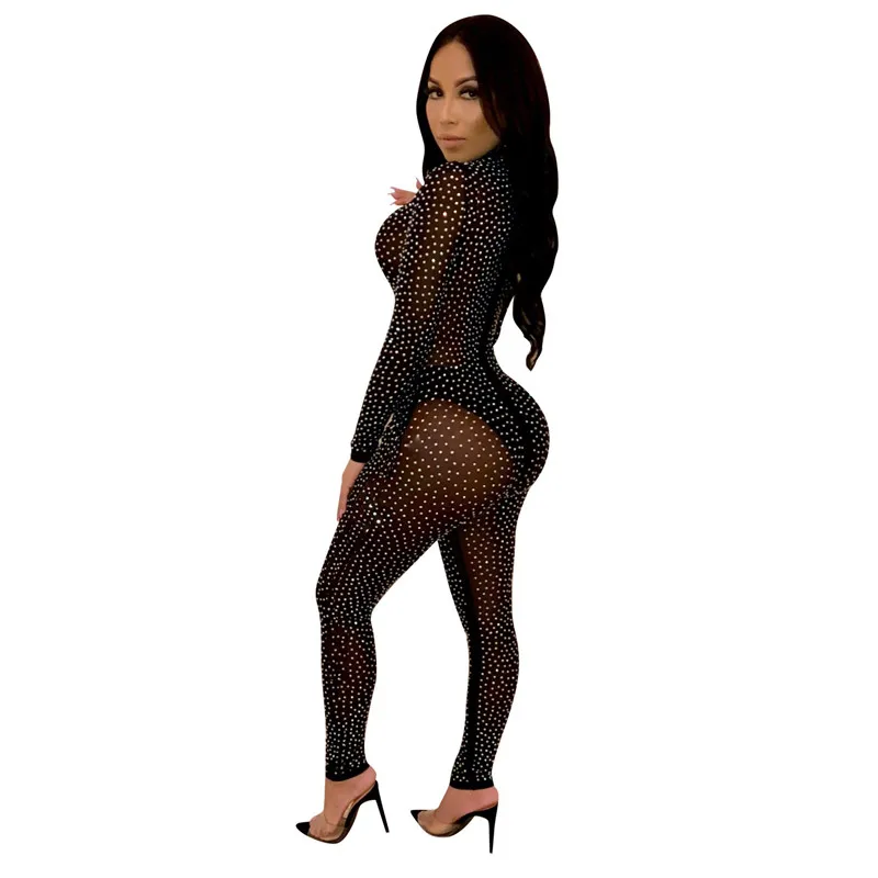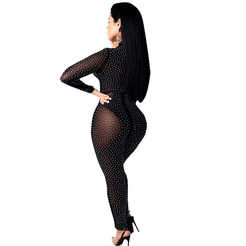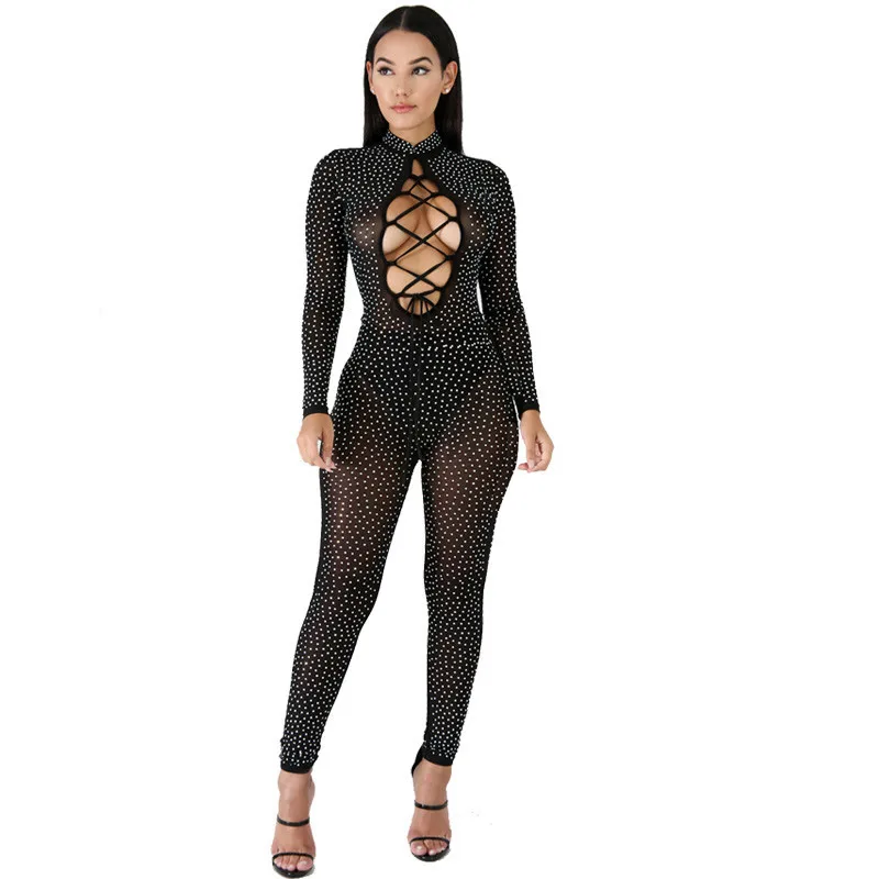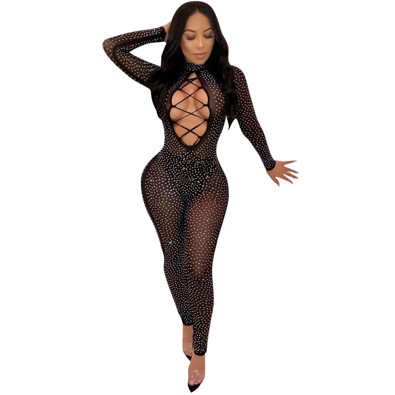 Long Sleeve Rhinestone Sexy Bodycon Jumpsuit Women Hollow Out Lace Up Long Pants Romper Party Club Sheer Mesh Jumpsuits Catsuit