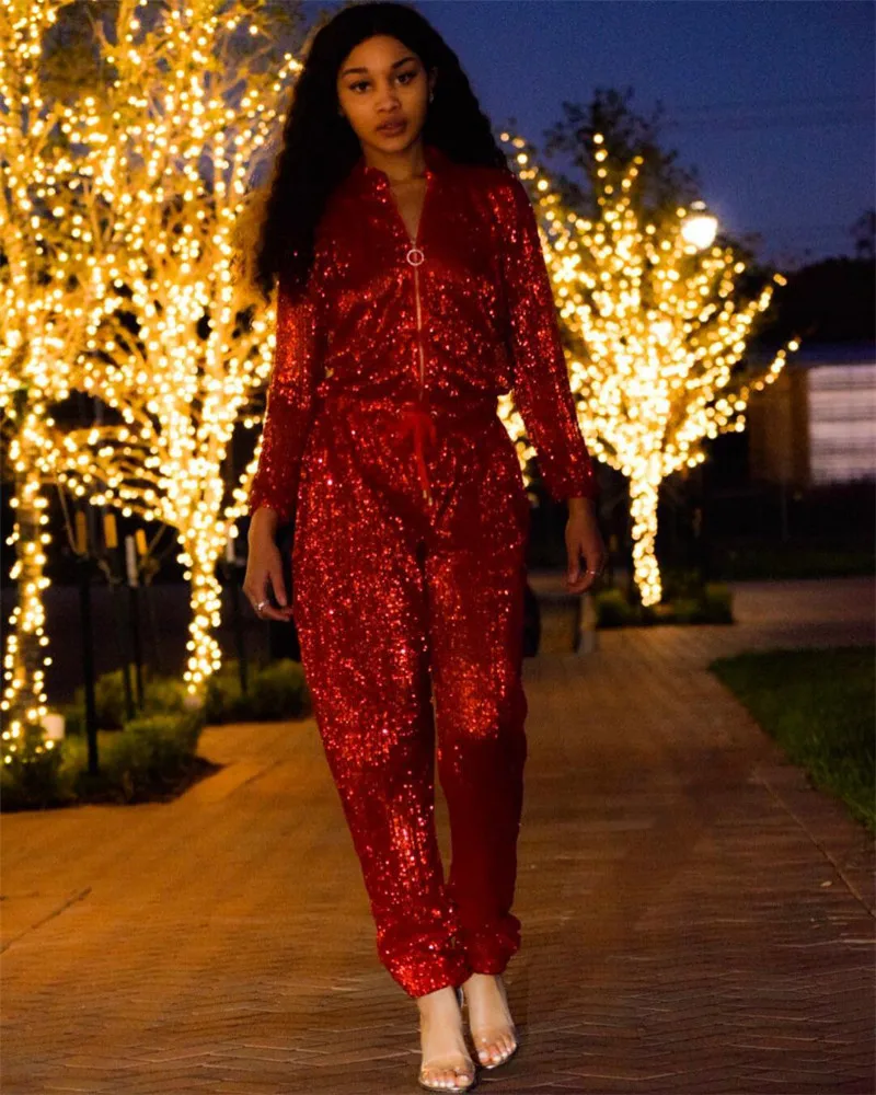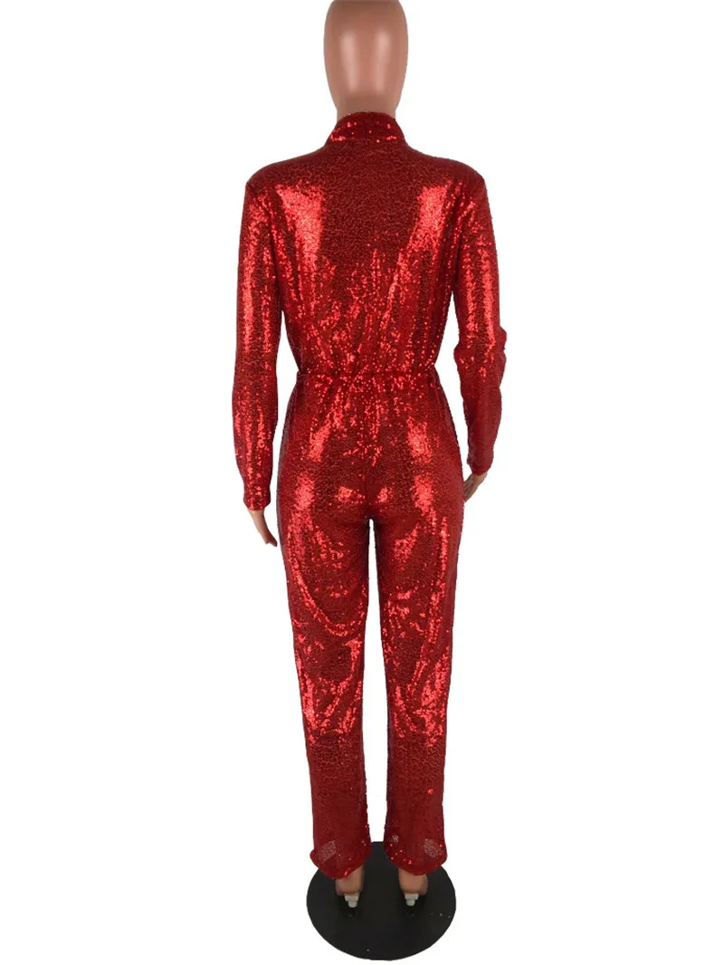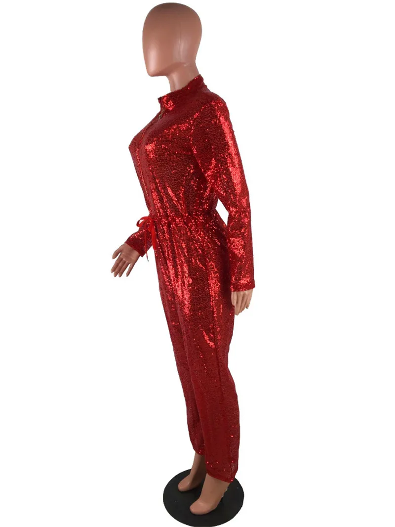 Long Sleeve Sequin Jumpsuit Women Spring Autumn Front Zipper Drawstring Waist Clubwear Long Pants Romper Sparkly Party Jumpsuits