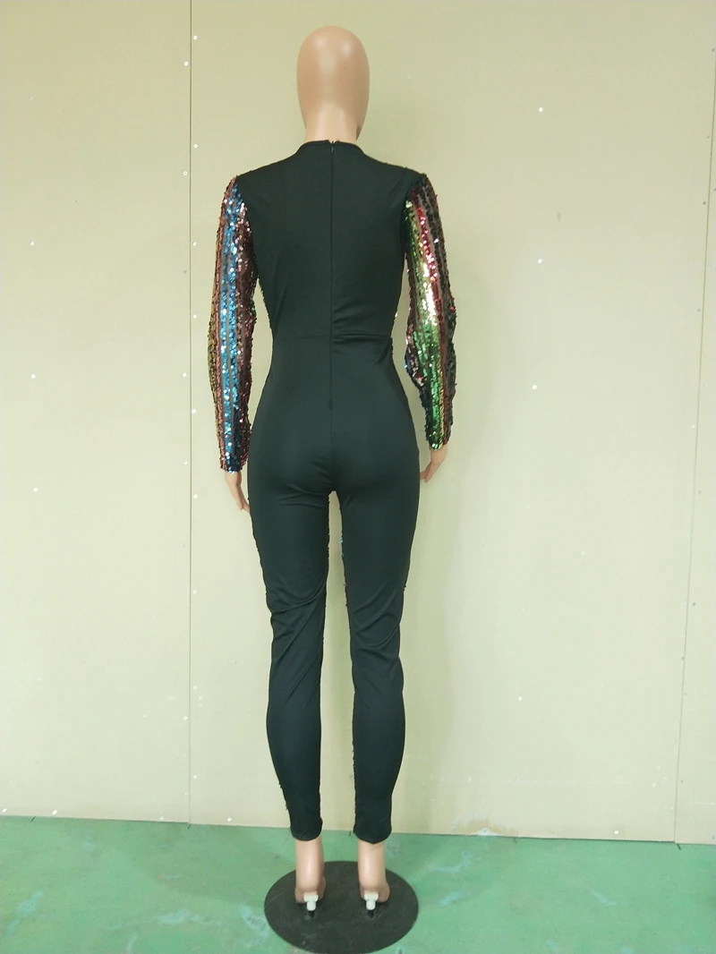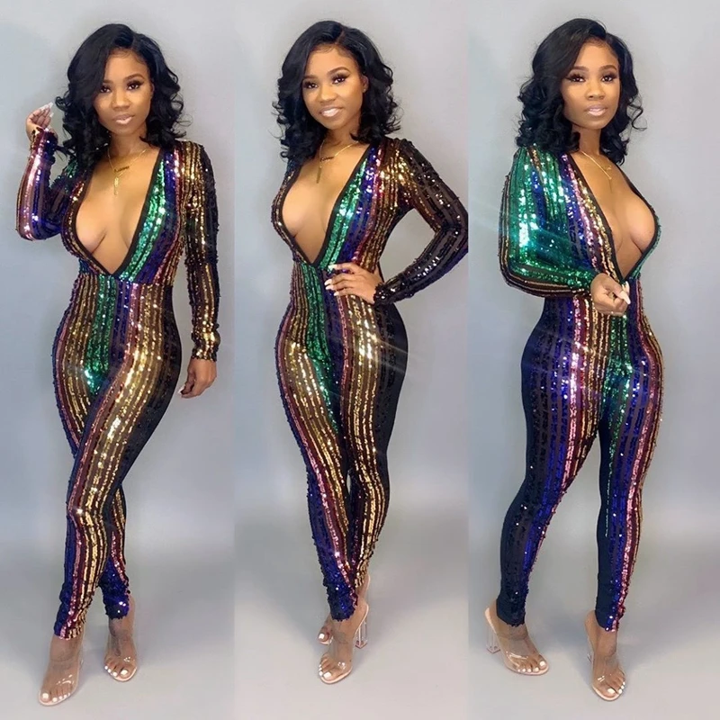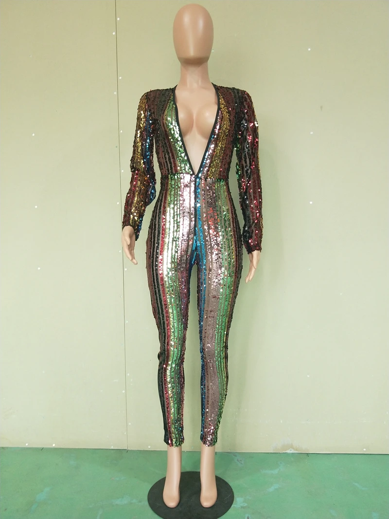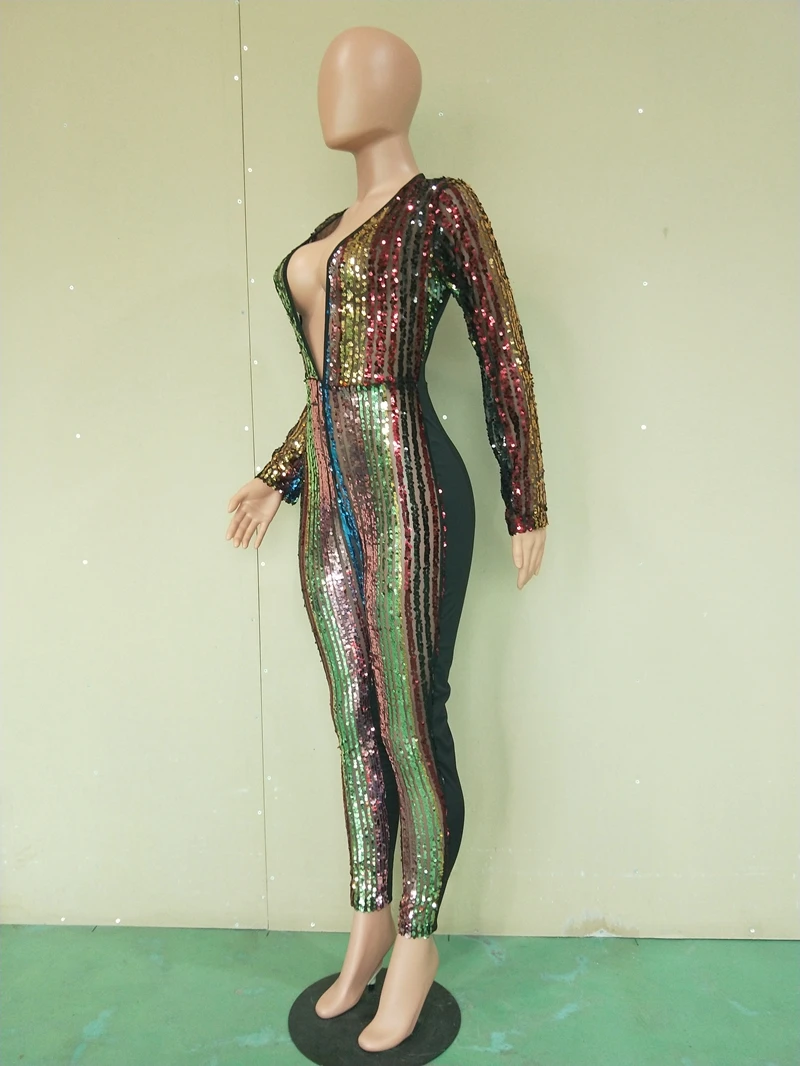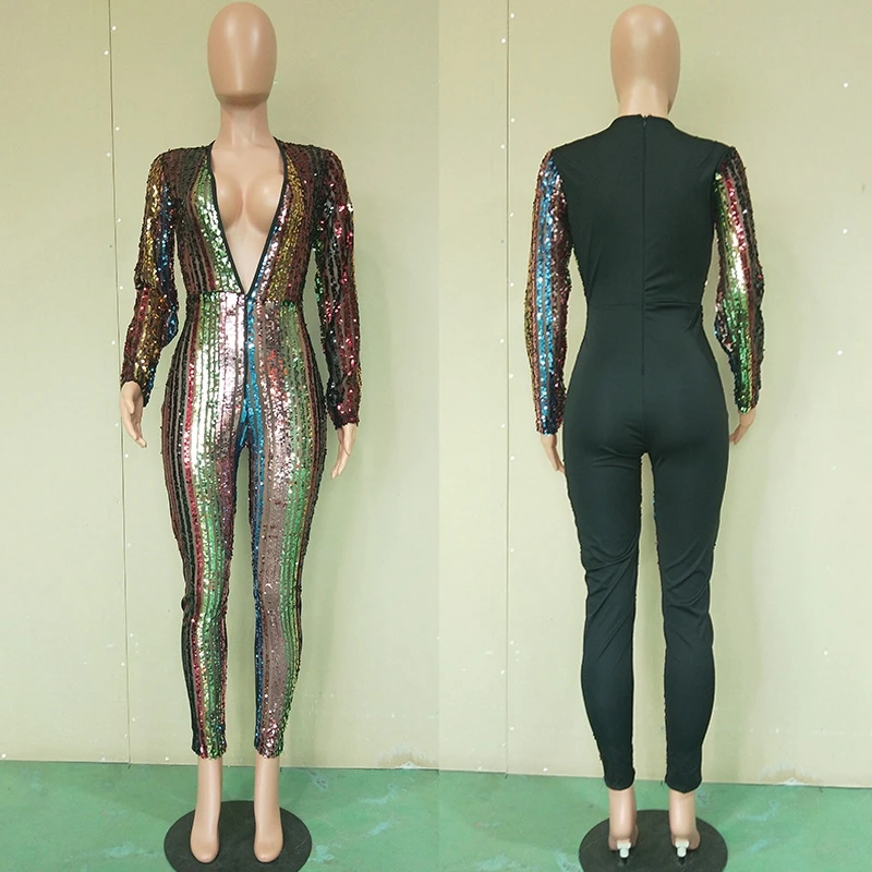 Multicolor Sequin Jumpsuit Women V Neck Long Sleeve Sexy Bodysuit Sparkly Bodycon Jumpsuit Night Club Party Rompers Jumpsuit
