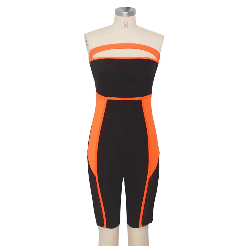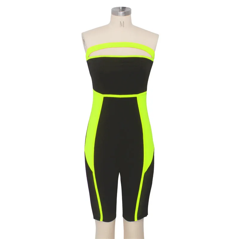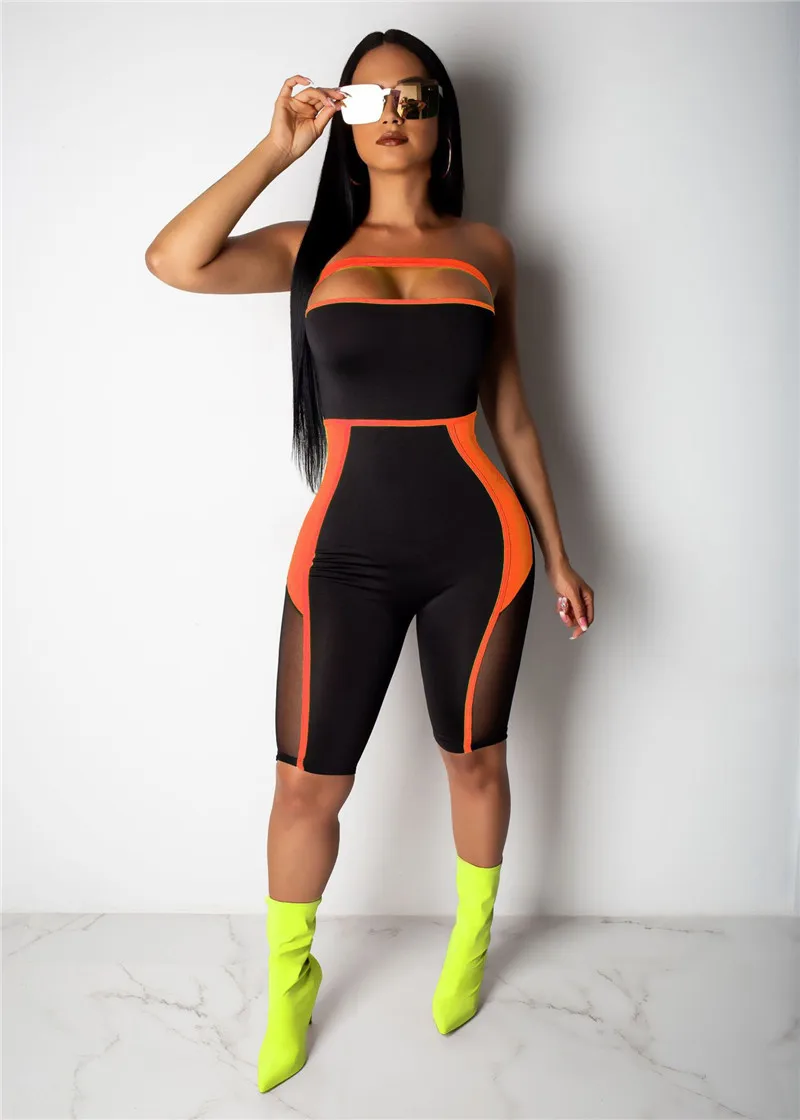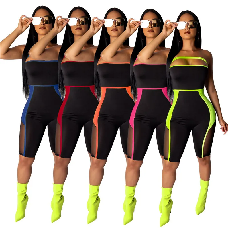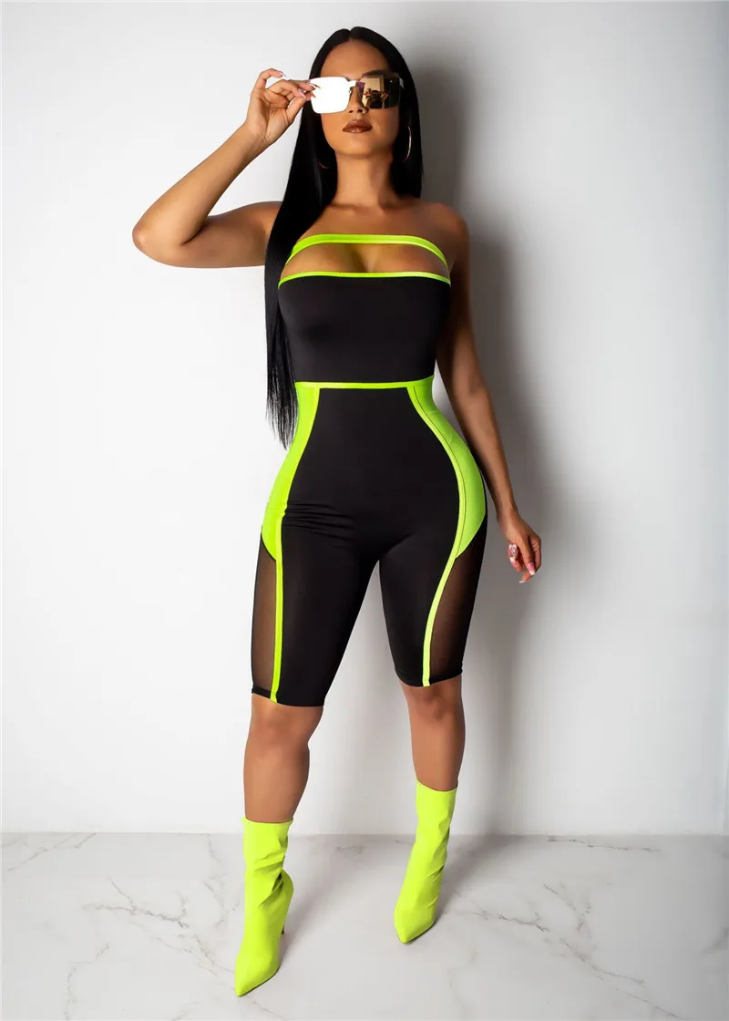 Neon Patchwork Sheer Mesh Sexy Bodycon Jumpsuit Shorts Romper Women Bandage Jumpsuit Summer Party Overalls Club Playsuit