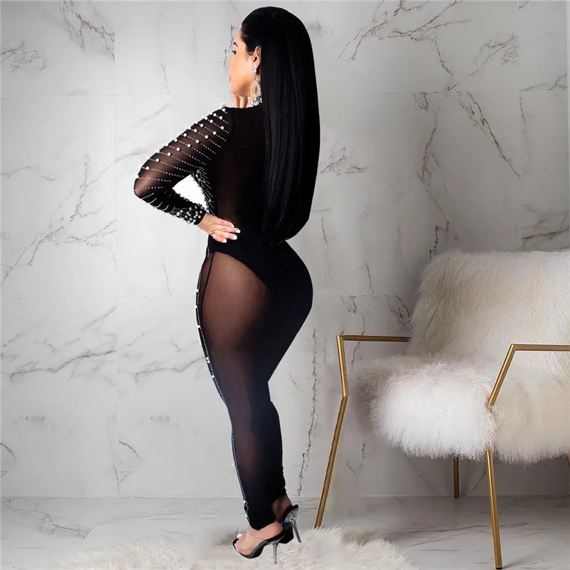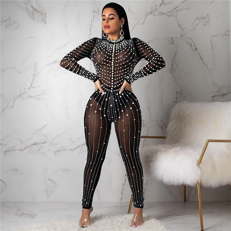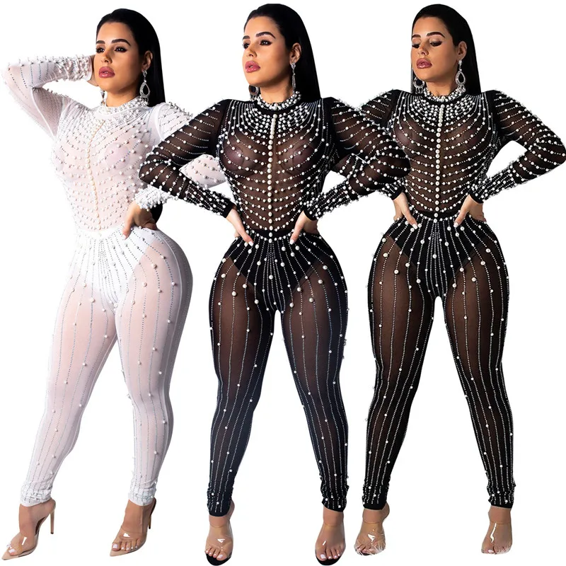 Pearls Beading Rhinestone Mesh Jumpsuit Women Sexy See-through Long Sleeve One Piece Bodysuit Party Birthday Overalls Outfits