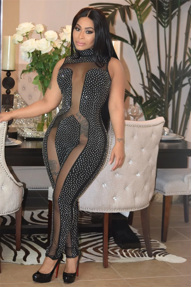 Rhinestone Jumpsuit Women Summer Sleeveless Sheer Mesh Patchwork Club Bodycon Jumpsuit Long Pants Romper Party Jumpsuits Catsuit