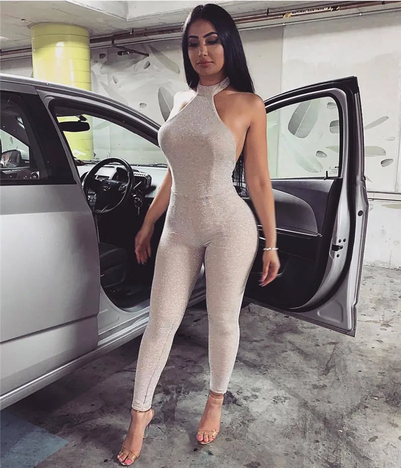 Sexy Halter Glitter Jumpsuit for Women Sleeveless Open Back Bodycon Romper Skinny Night Club Wear Party Jumpsuit Female Overalls