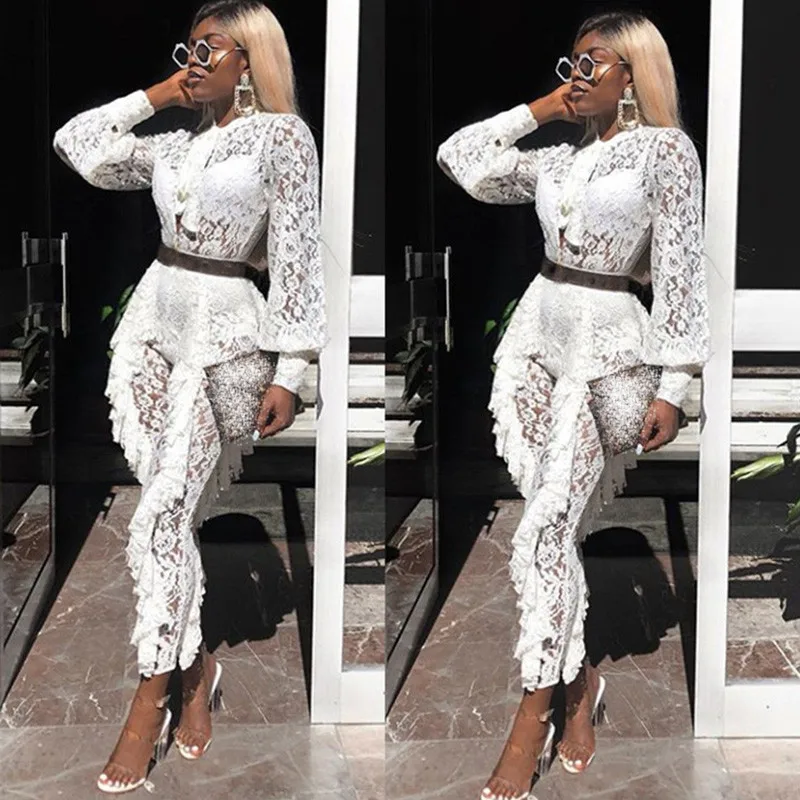 Sheer Long Sleeve White Lace Jumpsuit for Women Sexy See Through Floral Ruffles Bodycon Rompers Christmas Night Club Overalls