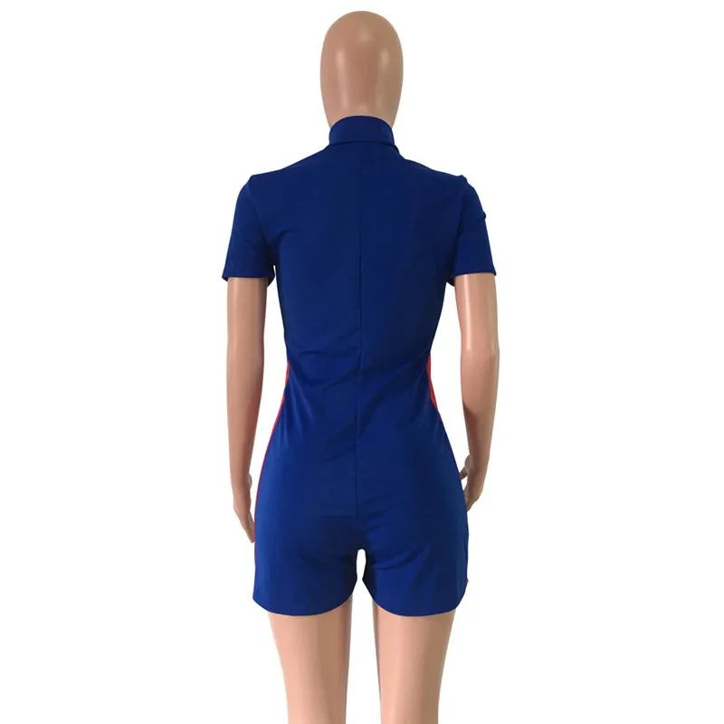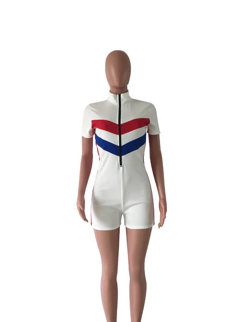Summer Playsuits Bodycon Jumpsuit Shorts for Women Short Sleeve Turtleneck Zipper Fly Fitness Romper Striped Casual Bodysuits