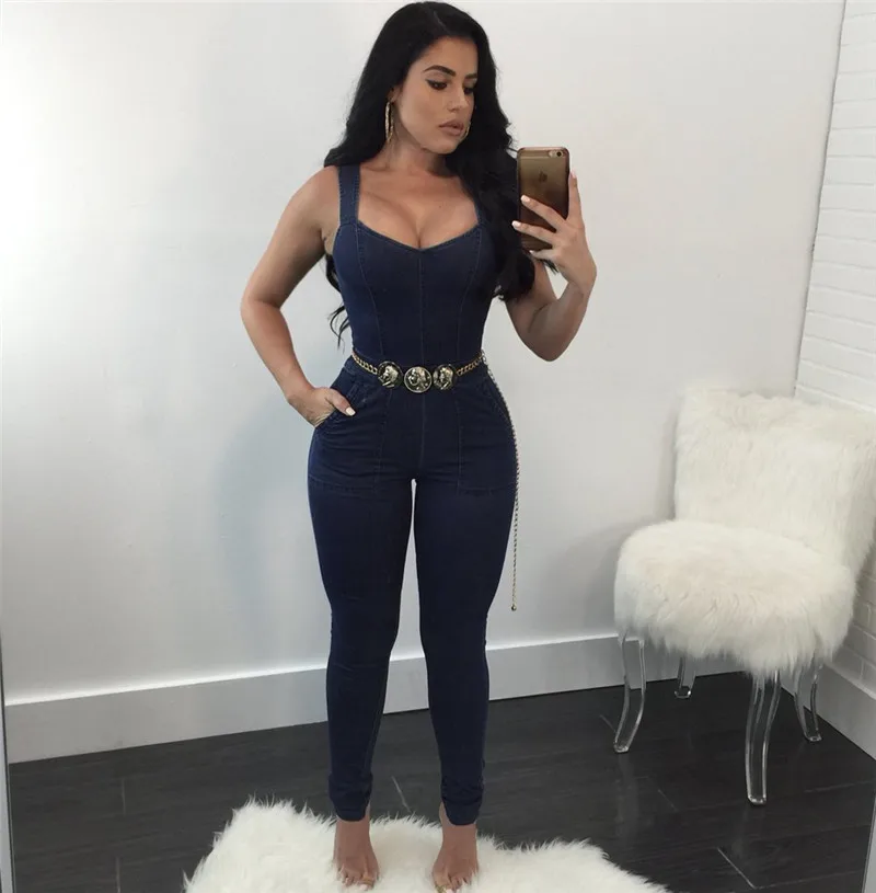 Women Elegant Denim Jumpsuit Pants with Belt Pockets Off Shoulder Sleeveless Sexy Straps Bodycon Jeans Jumpsuit Overall Catsuit