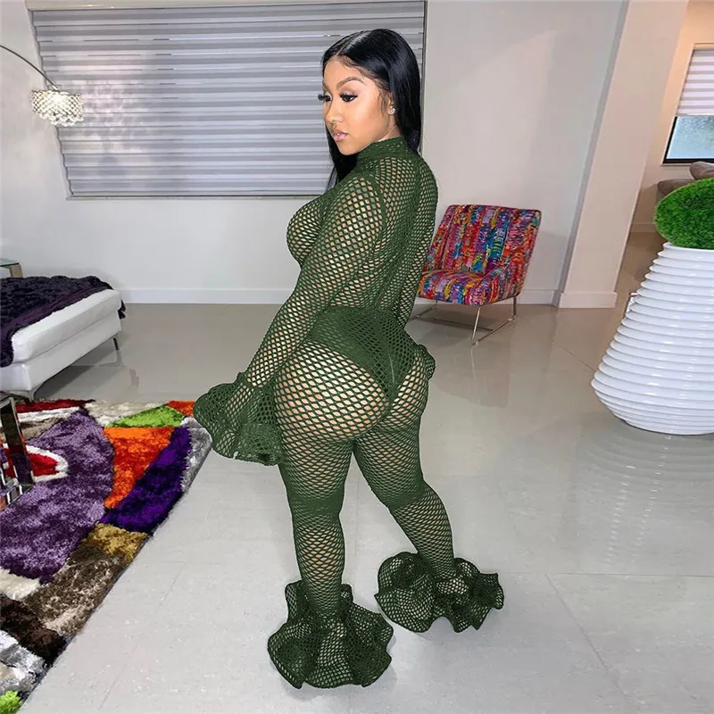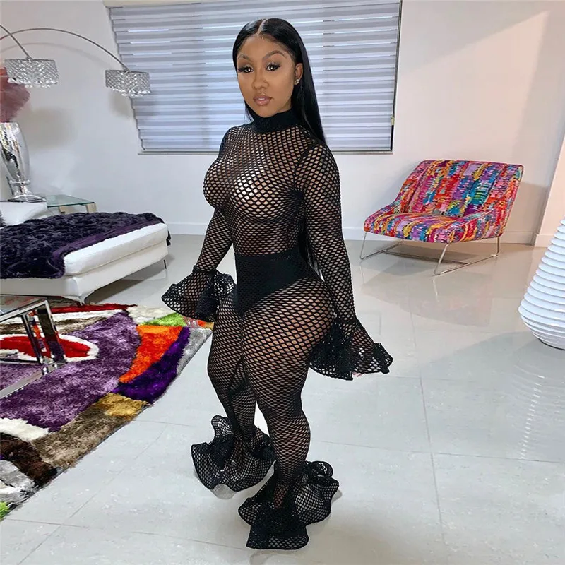 Women Mesh See-through Sexy Jumpsuit Autumn Long Sleeve Hollow Out One Piece Overalls Flare Pants Nightclub Party Romper