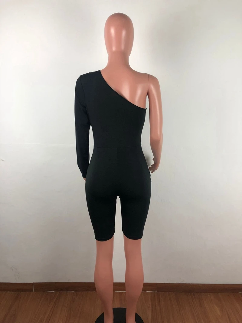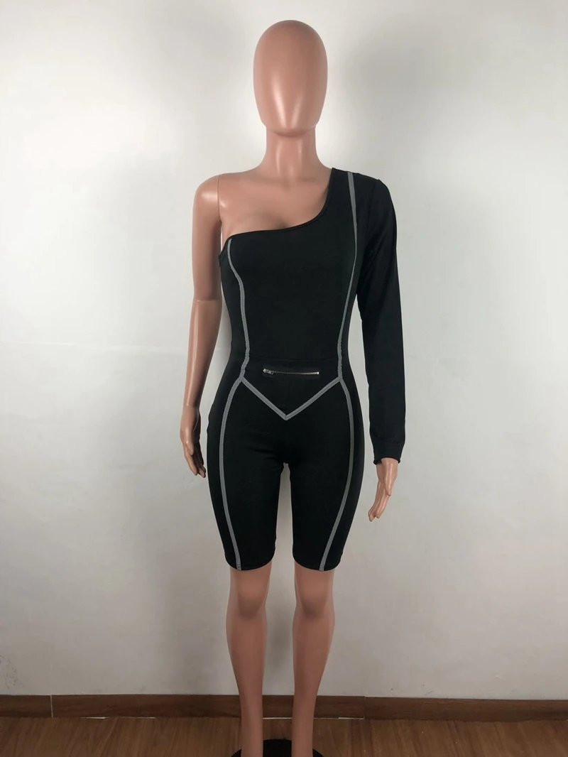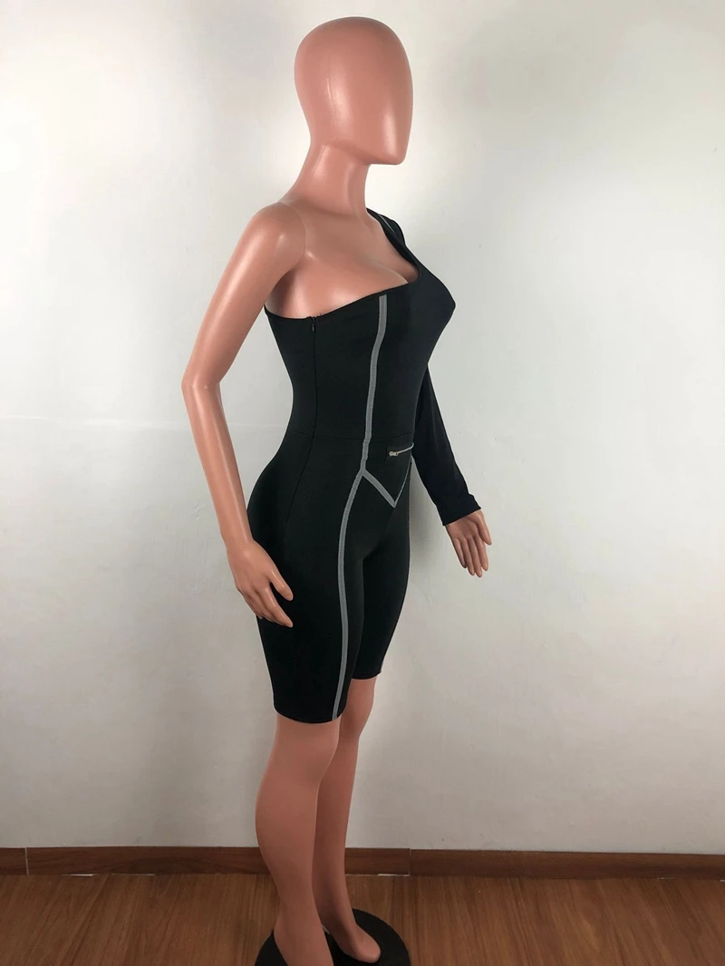 Women One Shoulder Sexy Bodycon Jumpsuit Skinny Romper Long Sleeve Reflective Playsuit One Piece Short Jumpsuit Club Outfits