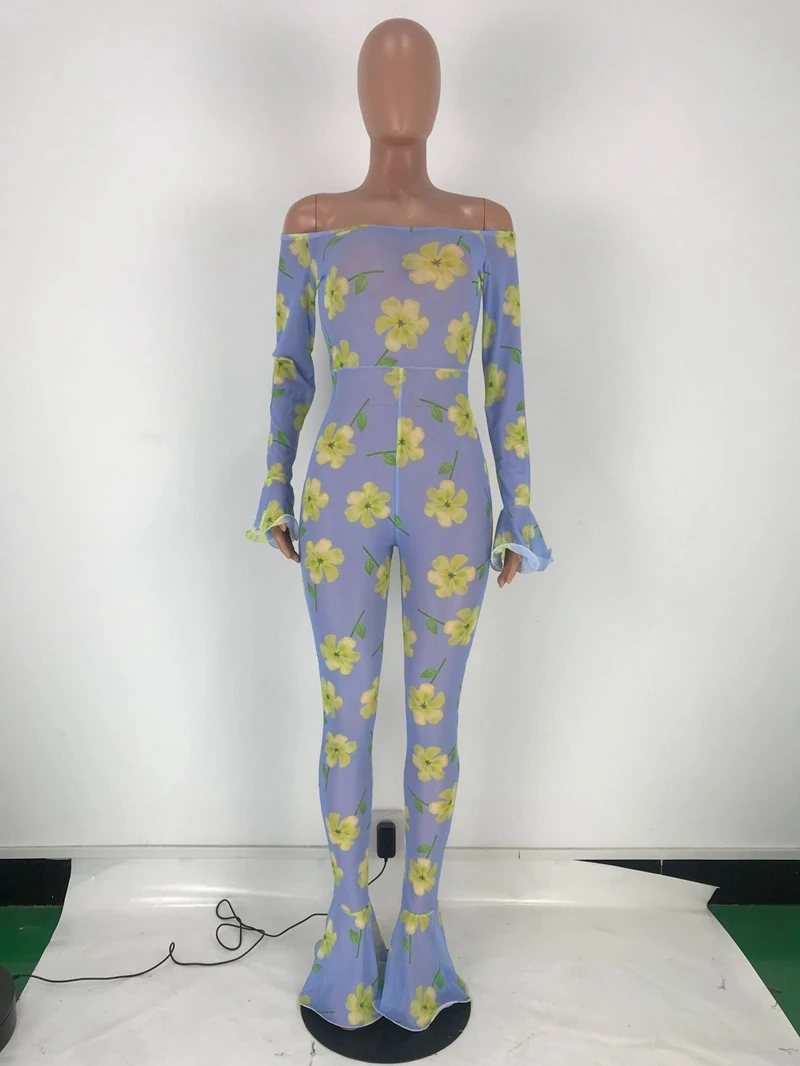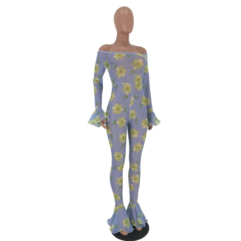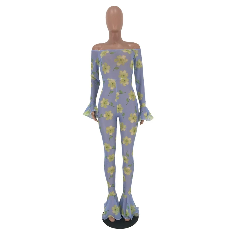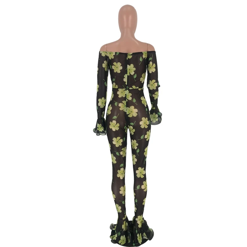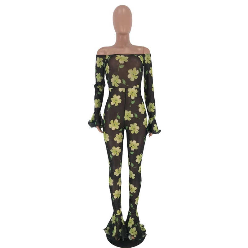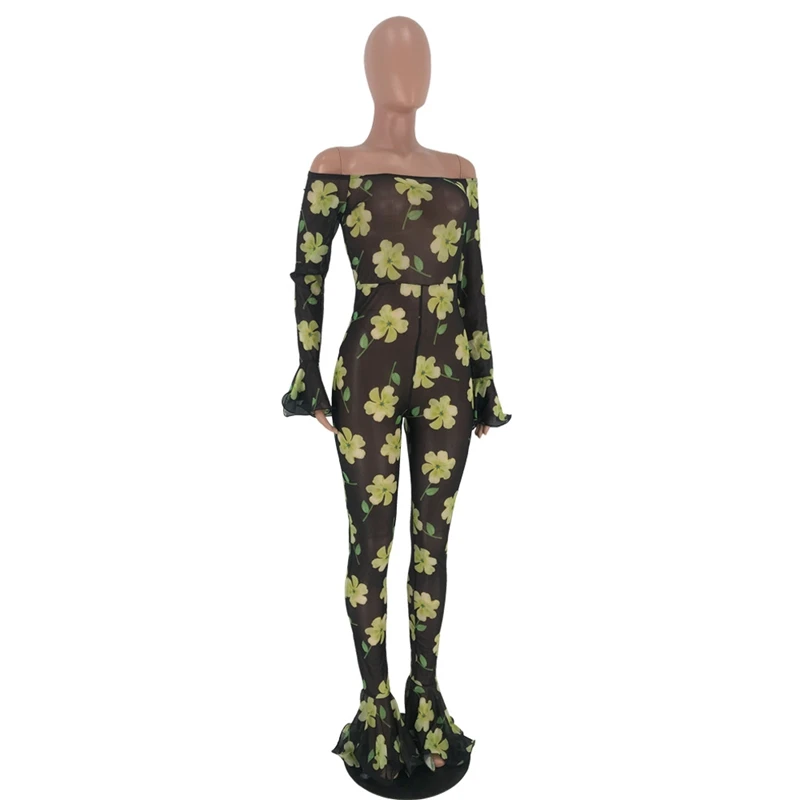 Women Sexy Mesh Jumpsuits Rompers Overalls Long Sleeve Flare Floral Print Off Shoulder Jumpsuit Clubwear Party Bodycon Jumpsuit