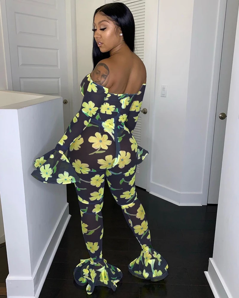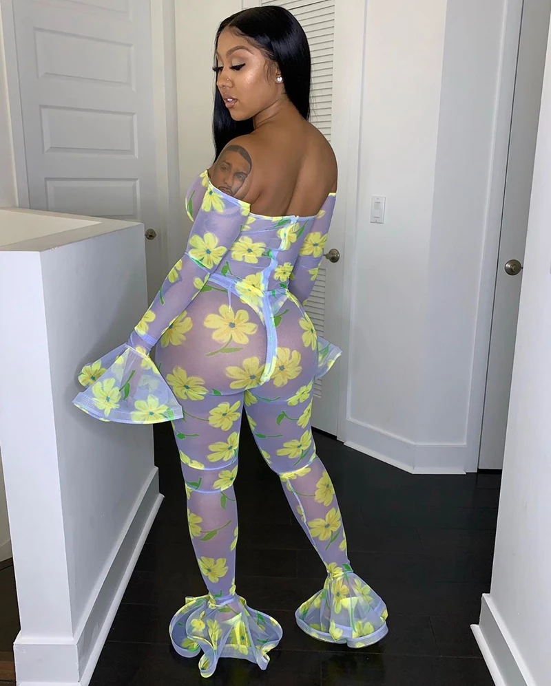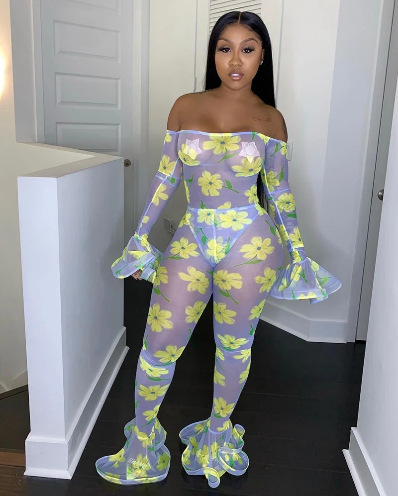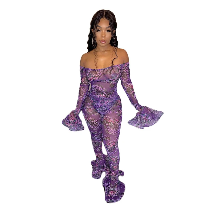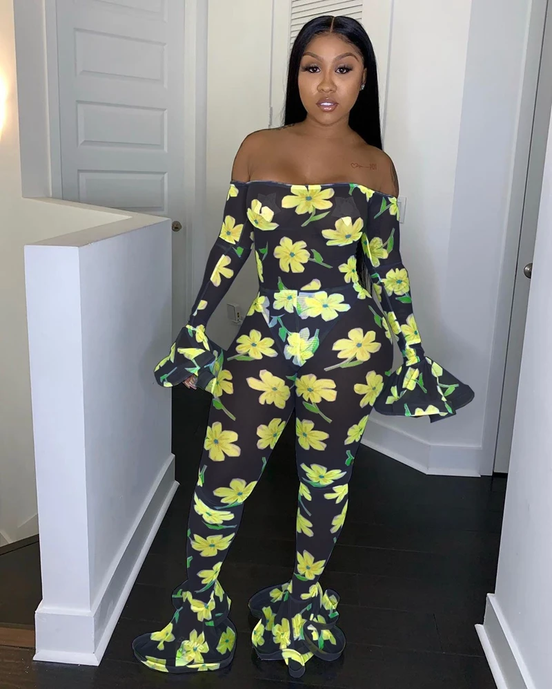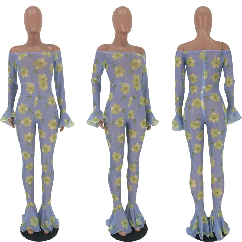 Women Sexy Mesh Jumpsuits Rompers Overalls Long Sleeve Flare Floral Print Off Shoulder Jumpsuit Clubwear Party Bodycon Jumpsuit