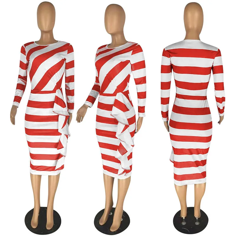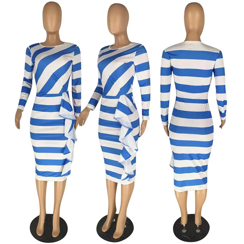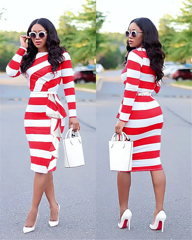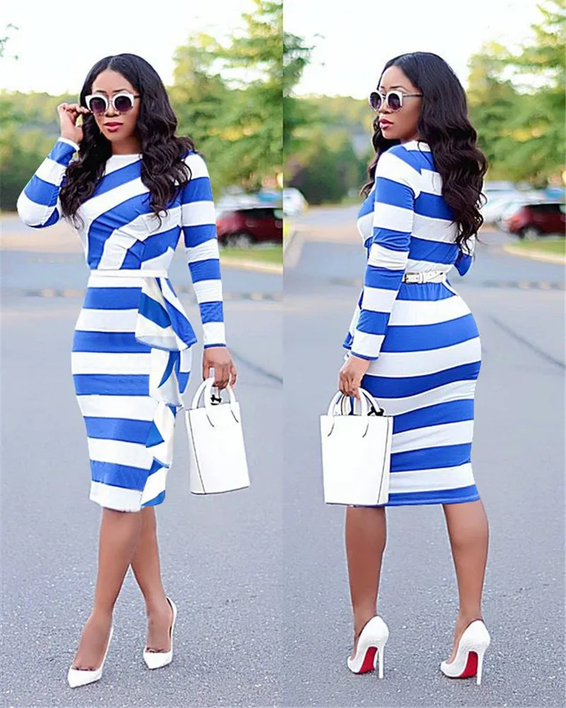 New Striped Print Office Lady Elegant Pencil Dress Women Long Sleeve Draped Sheath Business Work Dress Female Bodycon Midi Dress