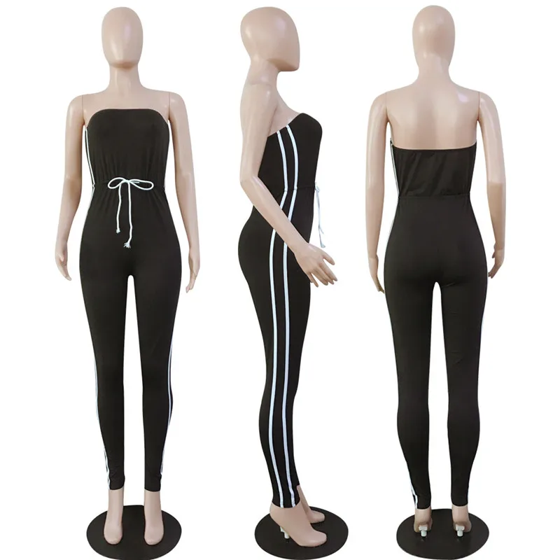 New Women Casual Strapless Jumpsuit Sexy Sleeveless Off Shoulder Romper Skinny Drawstring Striped Side Bodycon Fitness Overalls