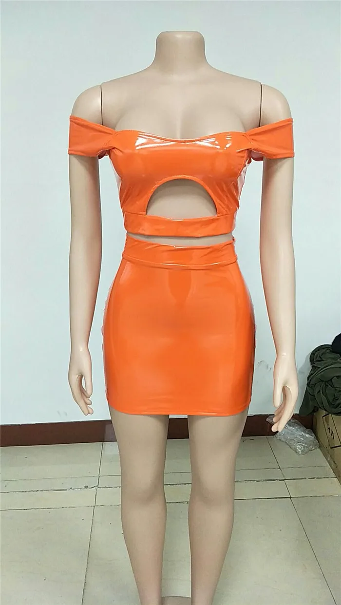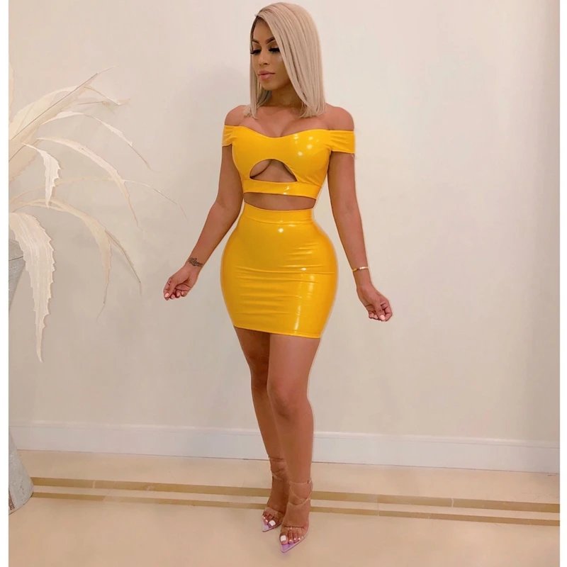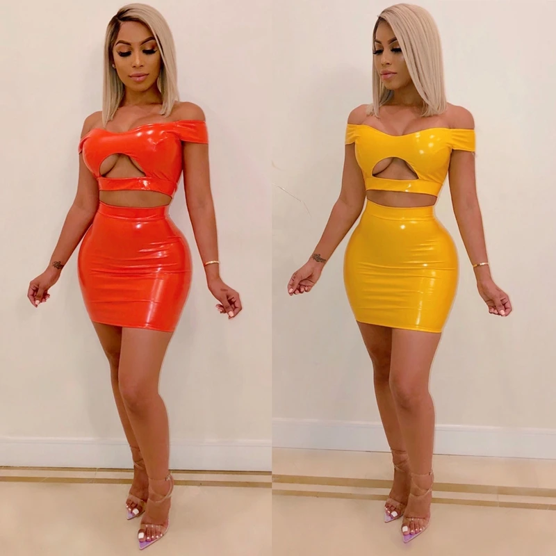 PU Leather Sexy Two Piece Set Women Off Shoulder 2 Piece Crop Top and Bodycon Skirt Set Party Summer Matching Sets Club Outfits