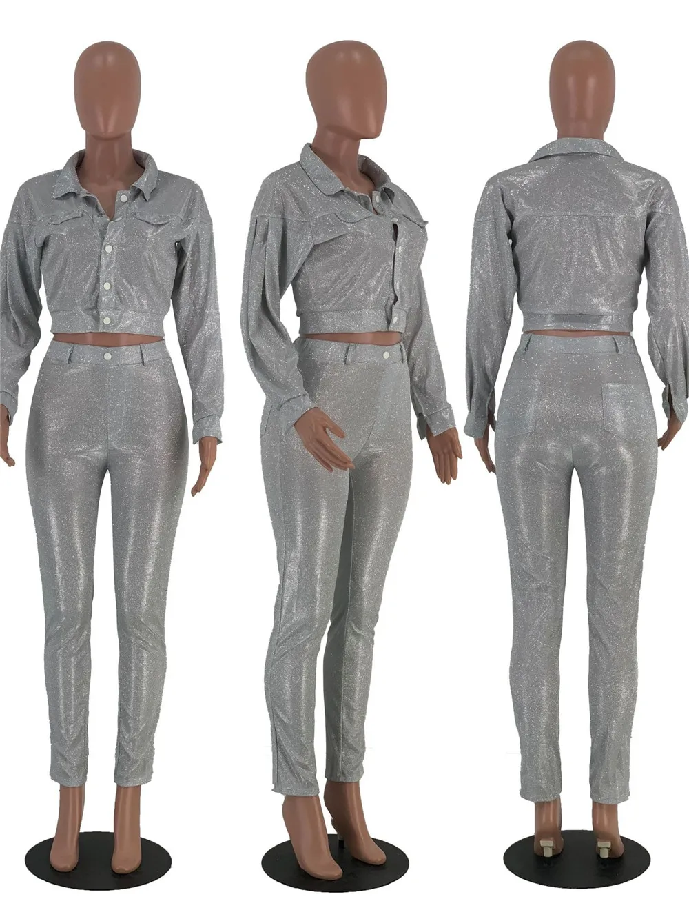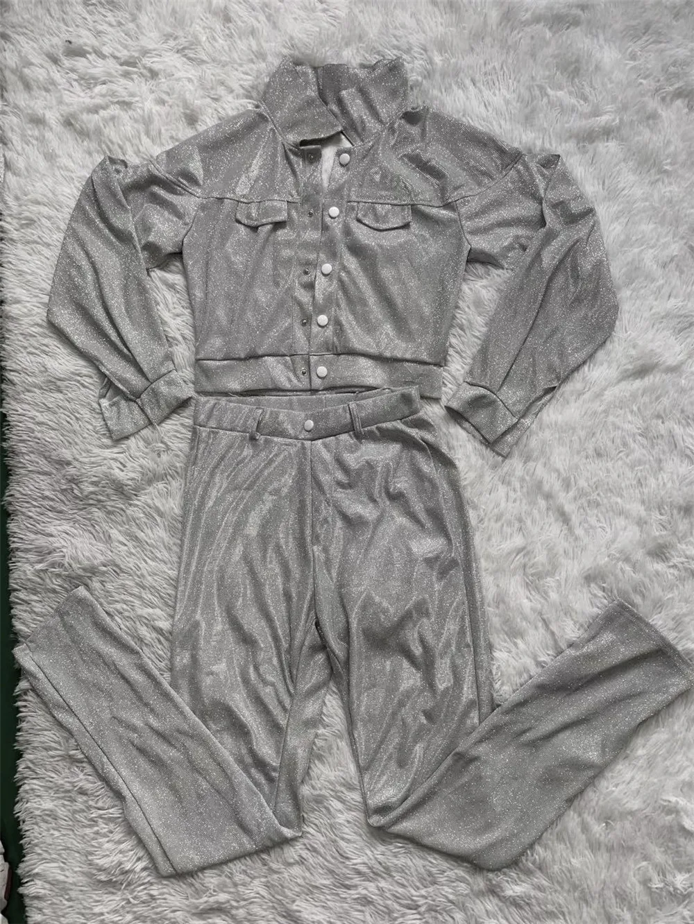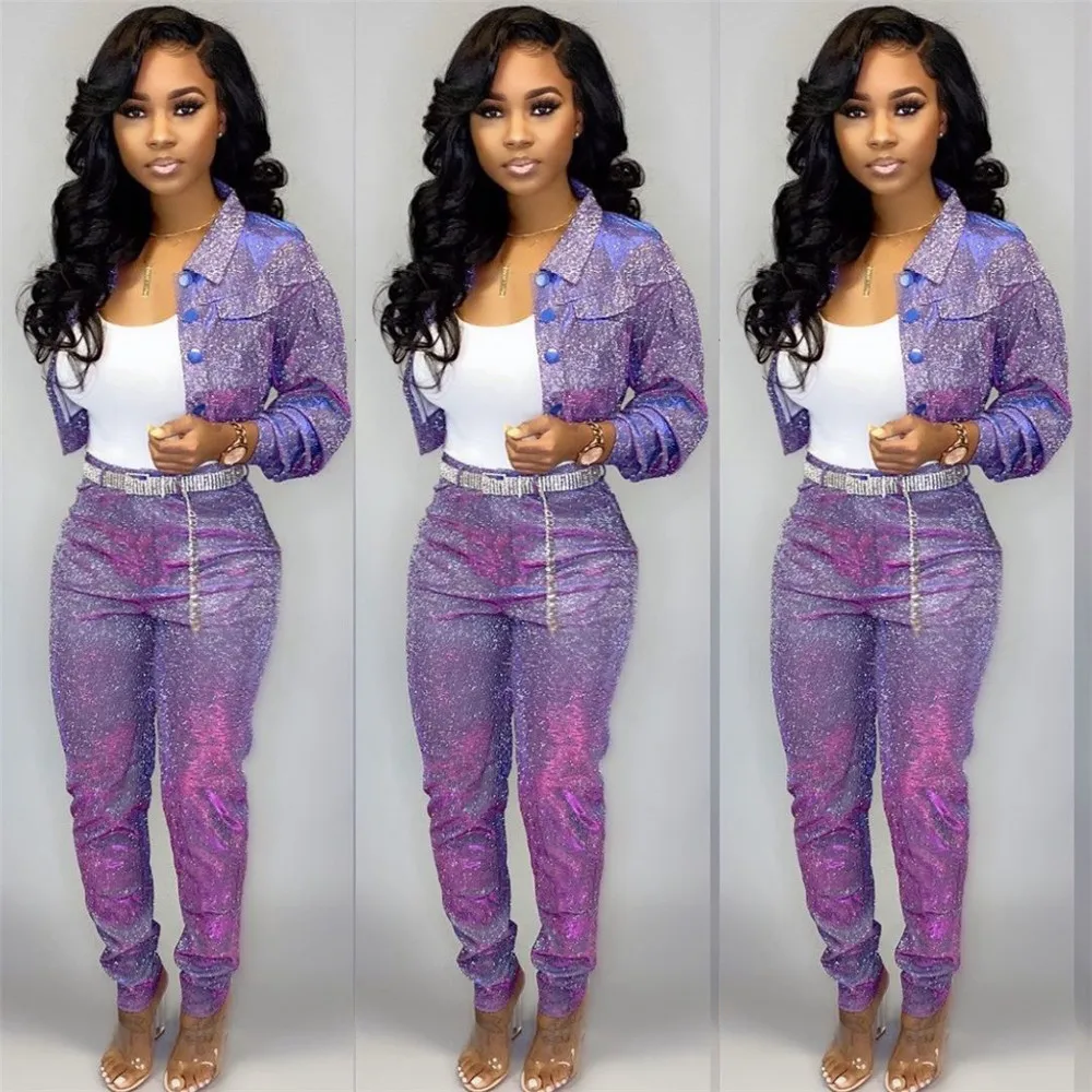 Sequin Glitter 2 Piece Set Women's Suit Single-breasted Jacket Top and Long Pants Sexy Club Outfits Matching Sets Ensemble Femme