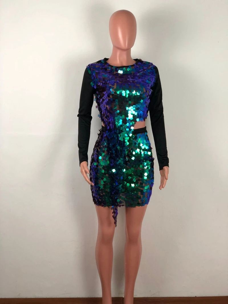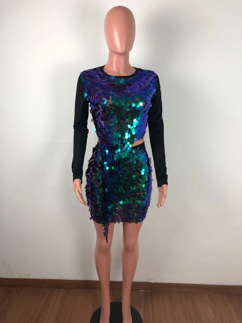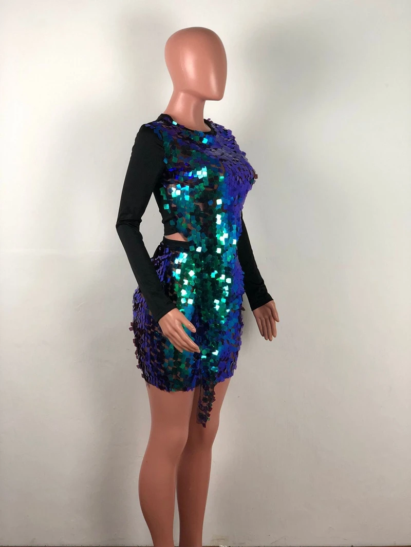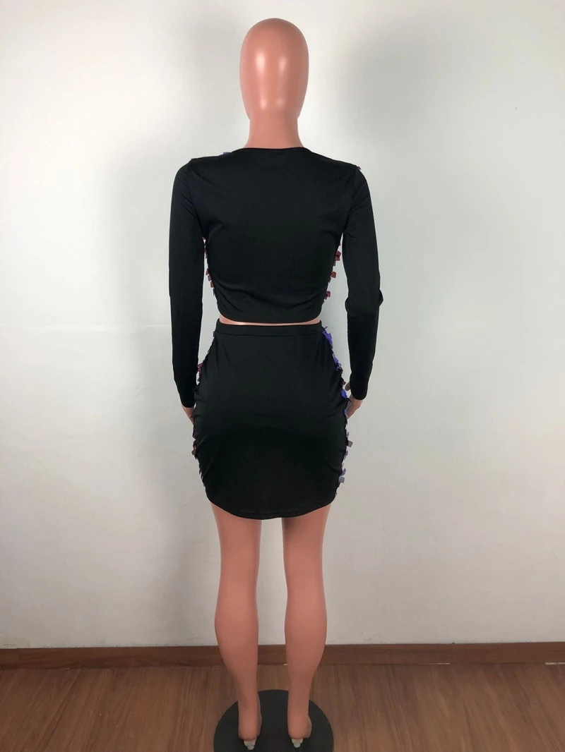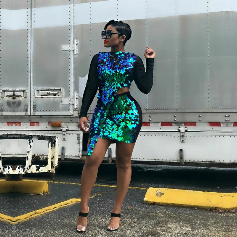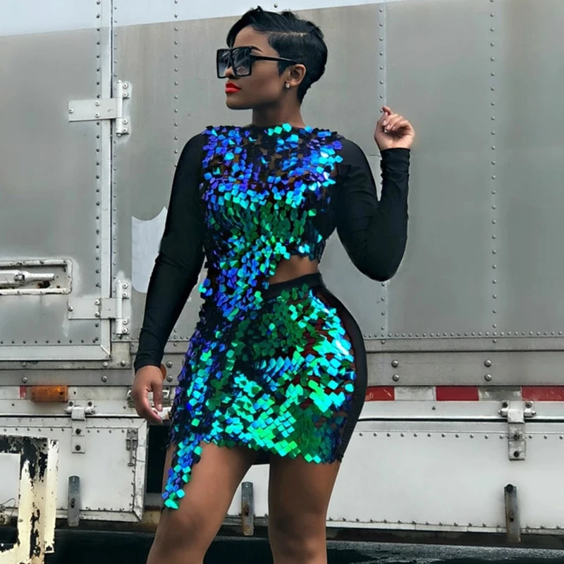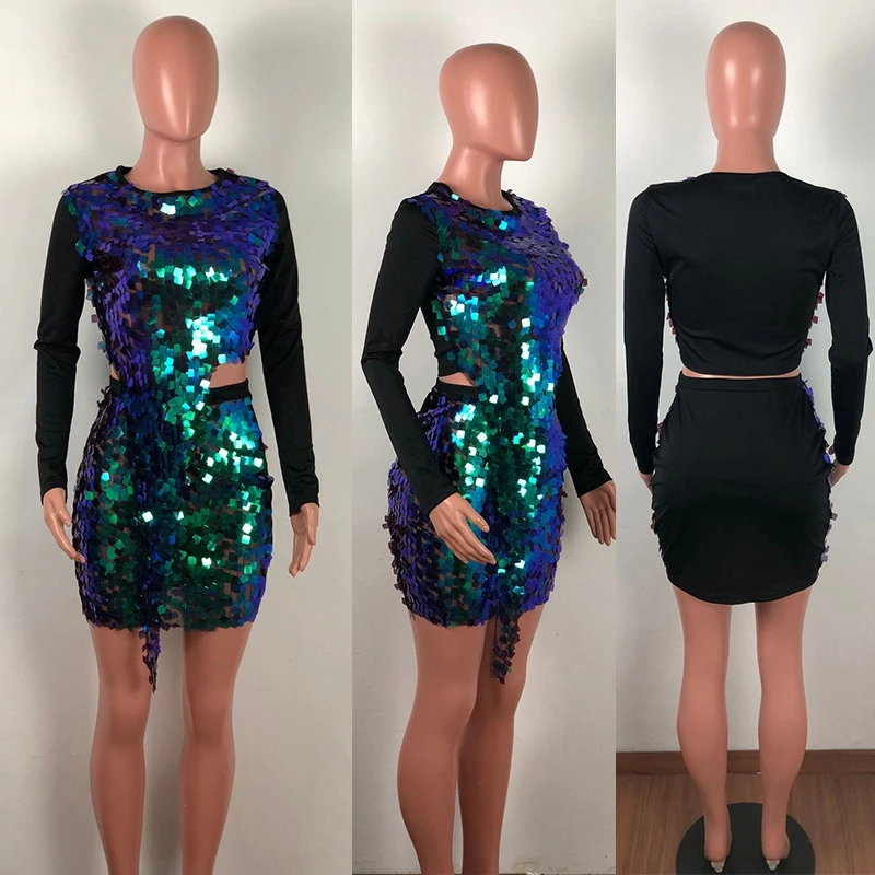 Sexy Sequin Two Piece Set Women Elegant 2 Piece Club Outfits Autumn Crop Top and Bodycon Skirt Set Party Matching Sets for Women