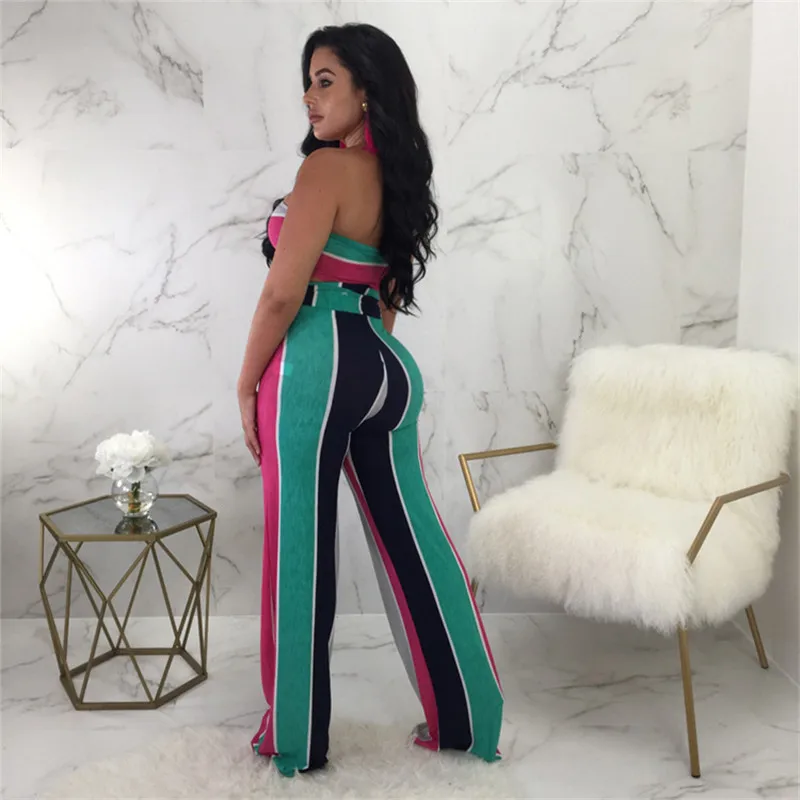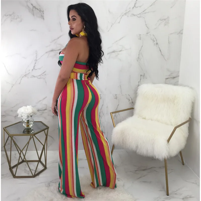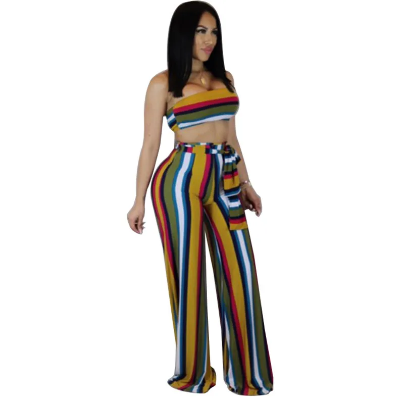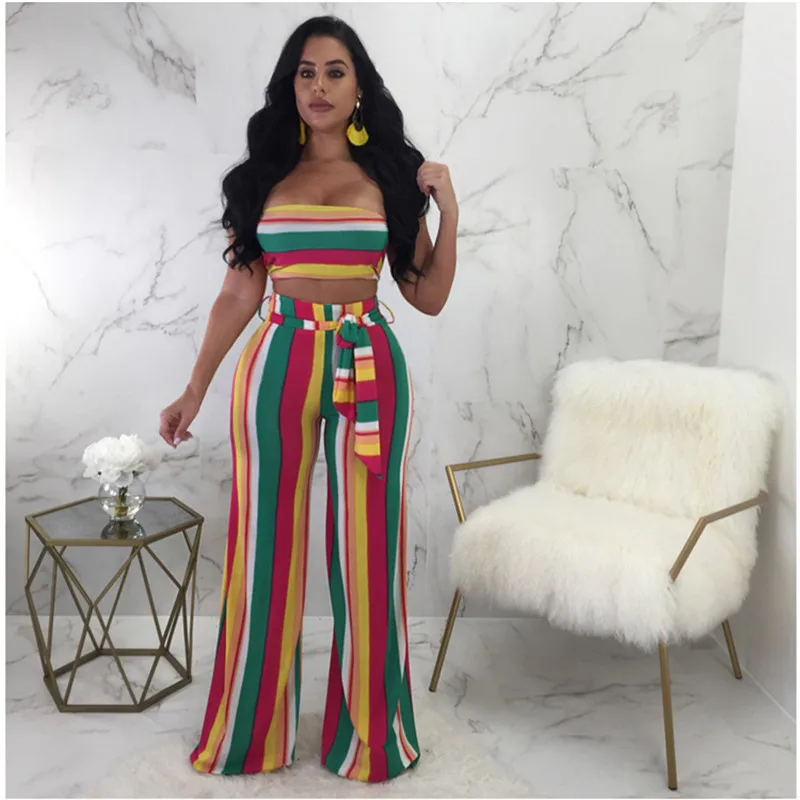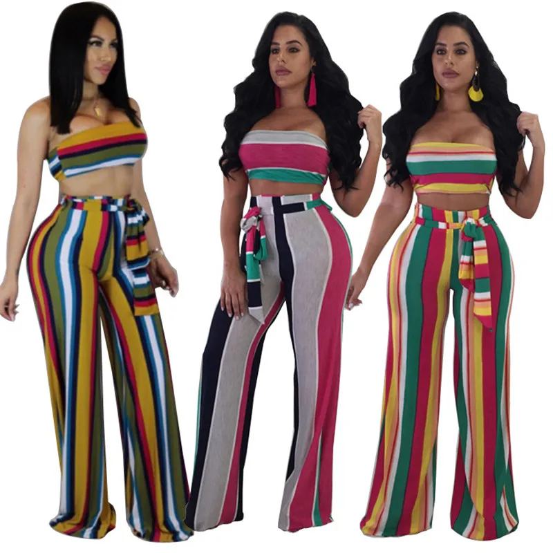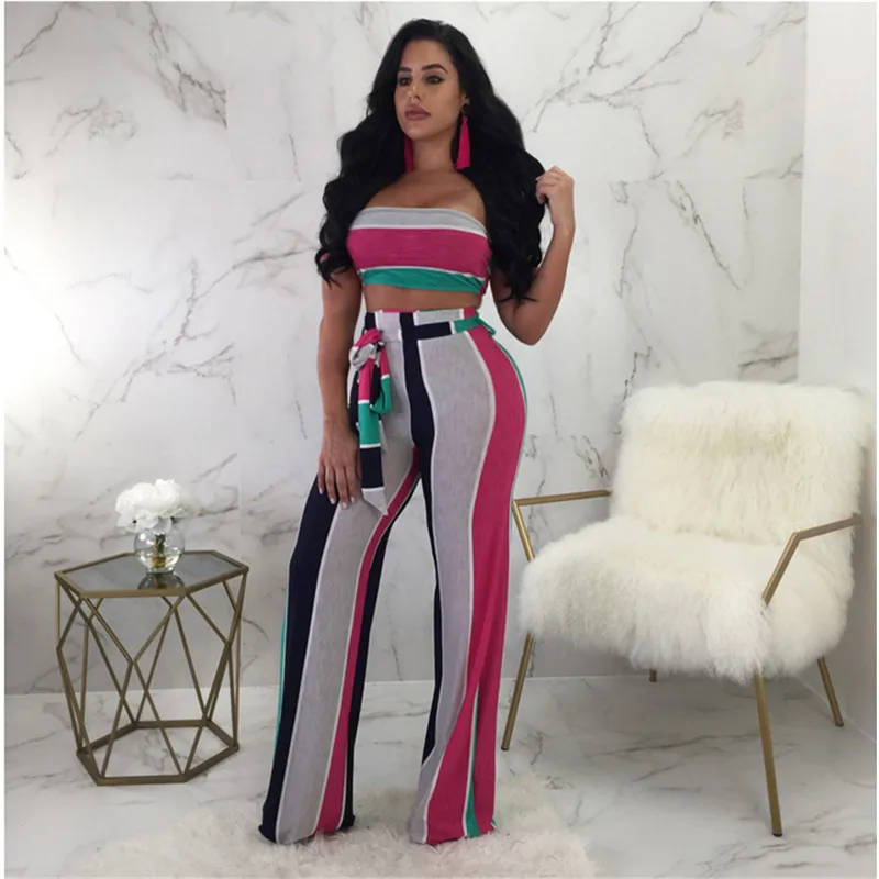 Sexy Two Piece Summer Outfits Women's 2 Piece Set Fashion Striped Strapless Crop Top and Wide Leg Pants Set Party Ladies Suit
