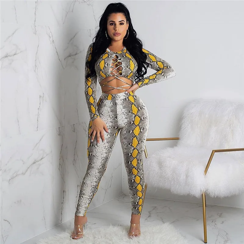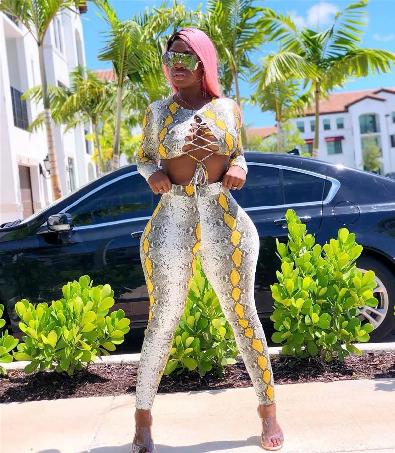 Snake Print Sexy 2 Piece Set Women Long Sleeve Lace Up Crop Top and Pant Suit Club Party Matching Sets 2 Piece Outfits for Women
