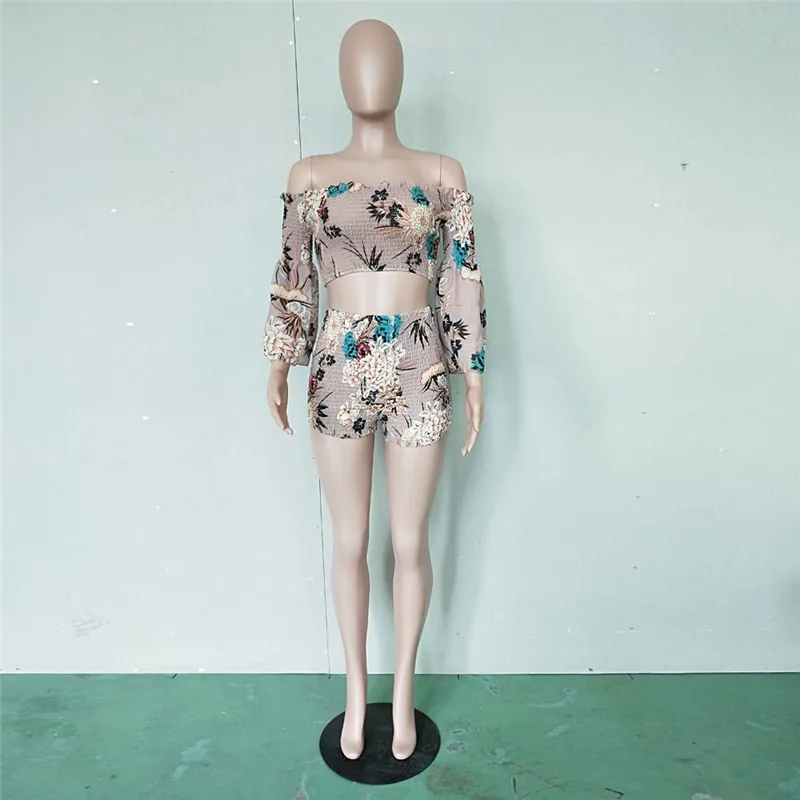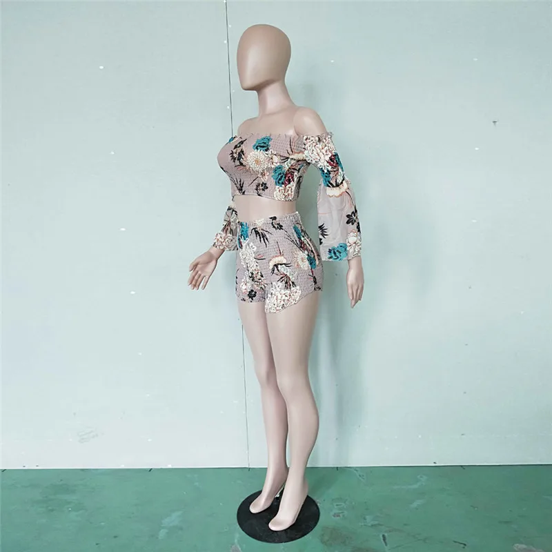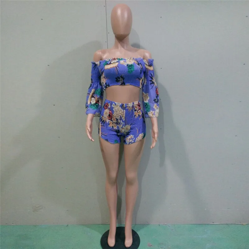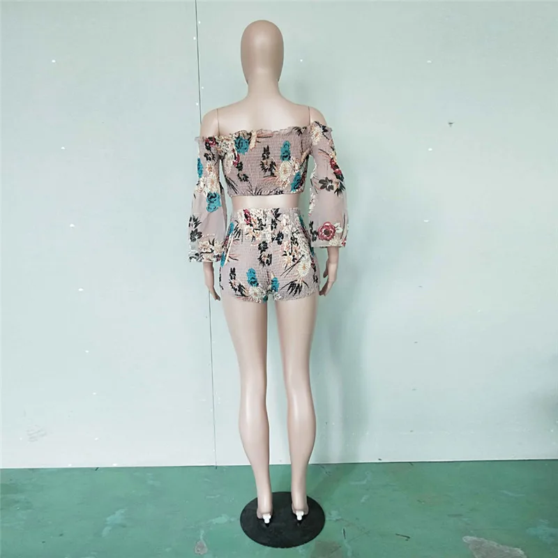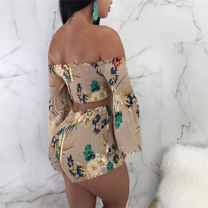 Summer Two Piece Shorts and Top Women Sexy Off the Shoulder Flare Sleeve Crop Tops + Shorts Floral Print Beach Wear Shorts Suit