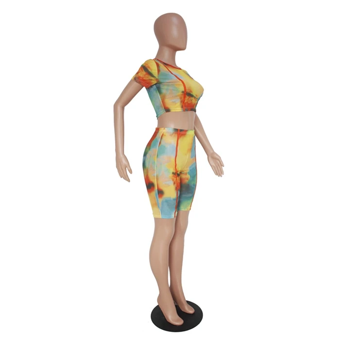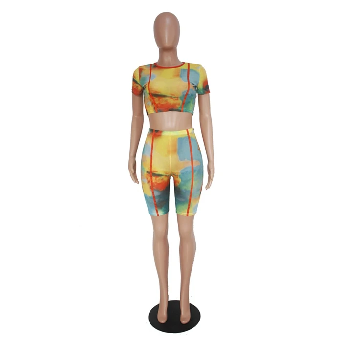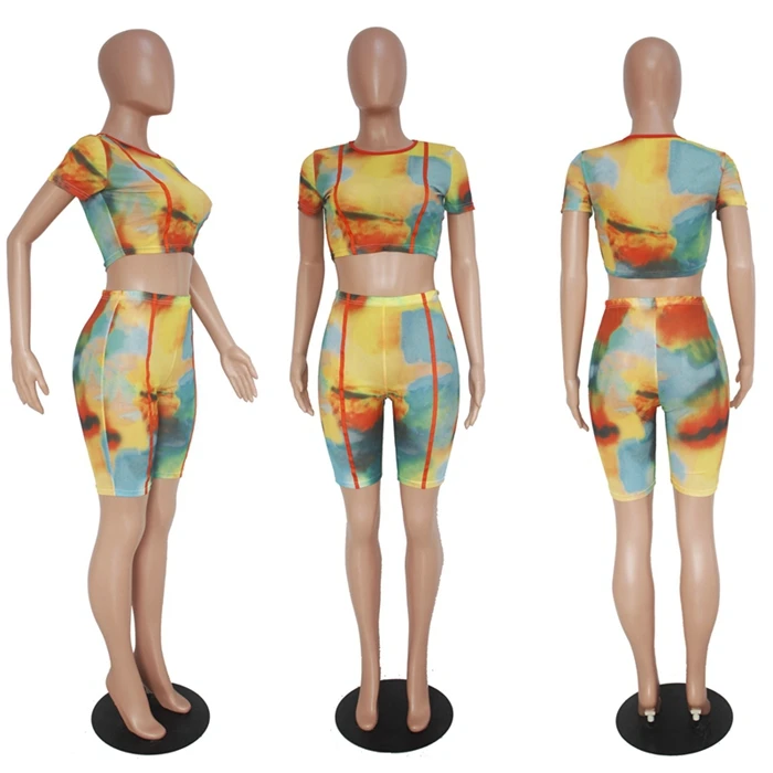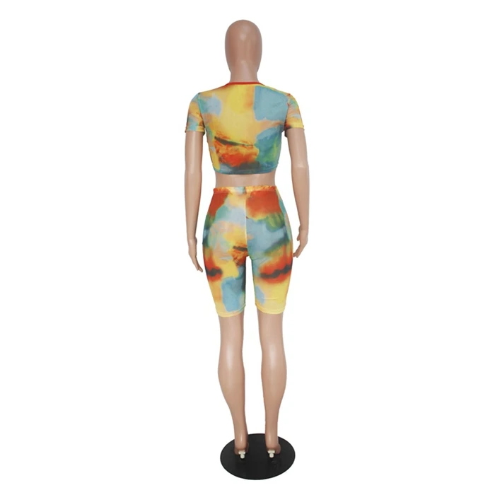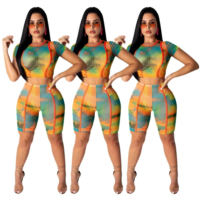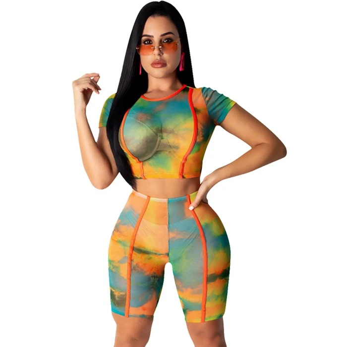 Tie Dye Print 2 Piece Outfits for Women Two Piece Set Crop Top and Shorts Set Sheer Mesh Sexy Club 2 Piece Summer Set Tracksuit
