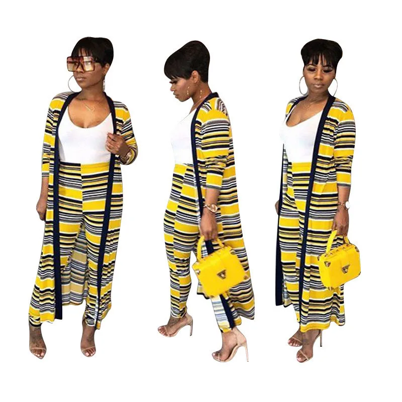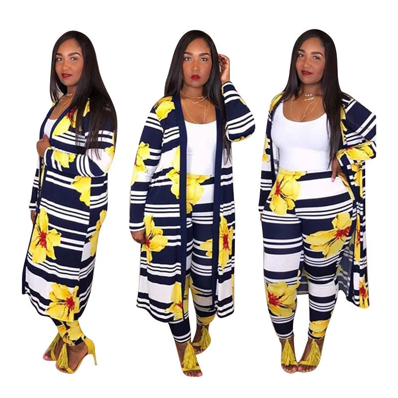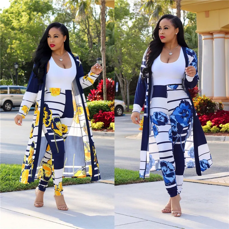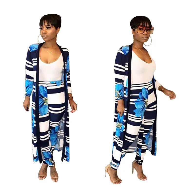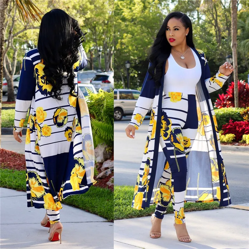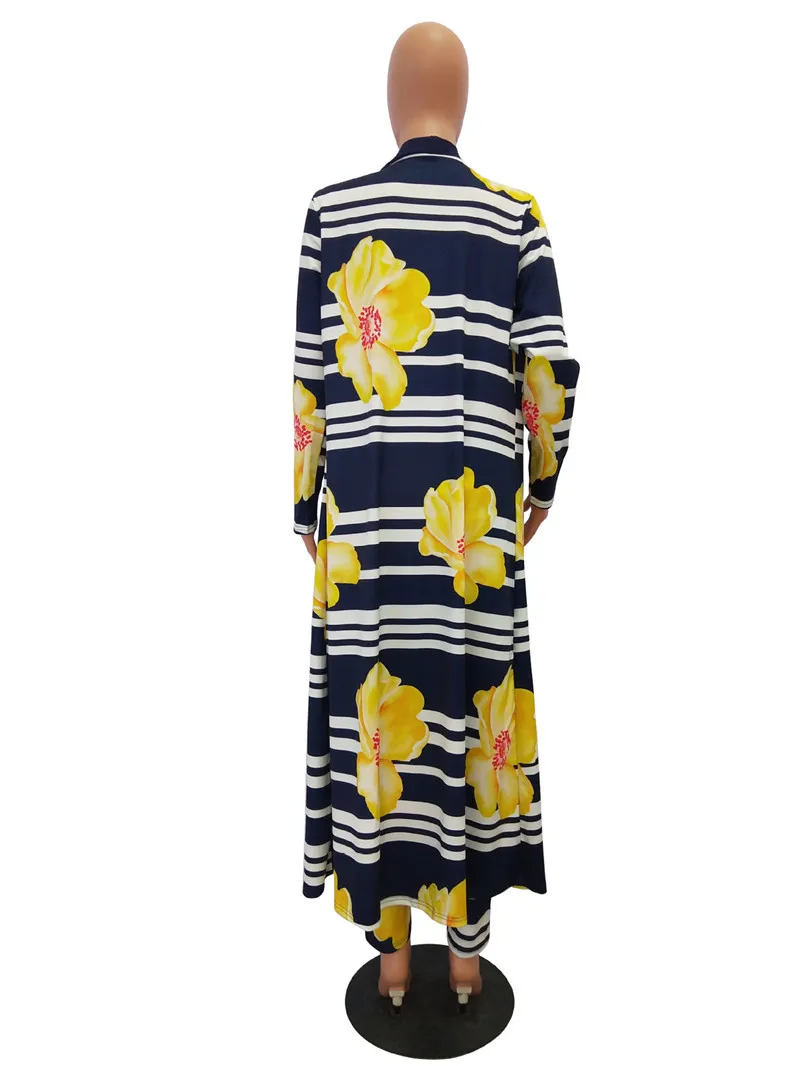 Two Piece Set Top and Pants Women Spring Autumn Long Sleeve X-Long Duster Coat and Pants Print Flower Casual 2 Piece Outfits
