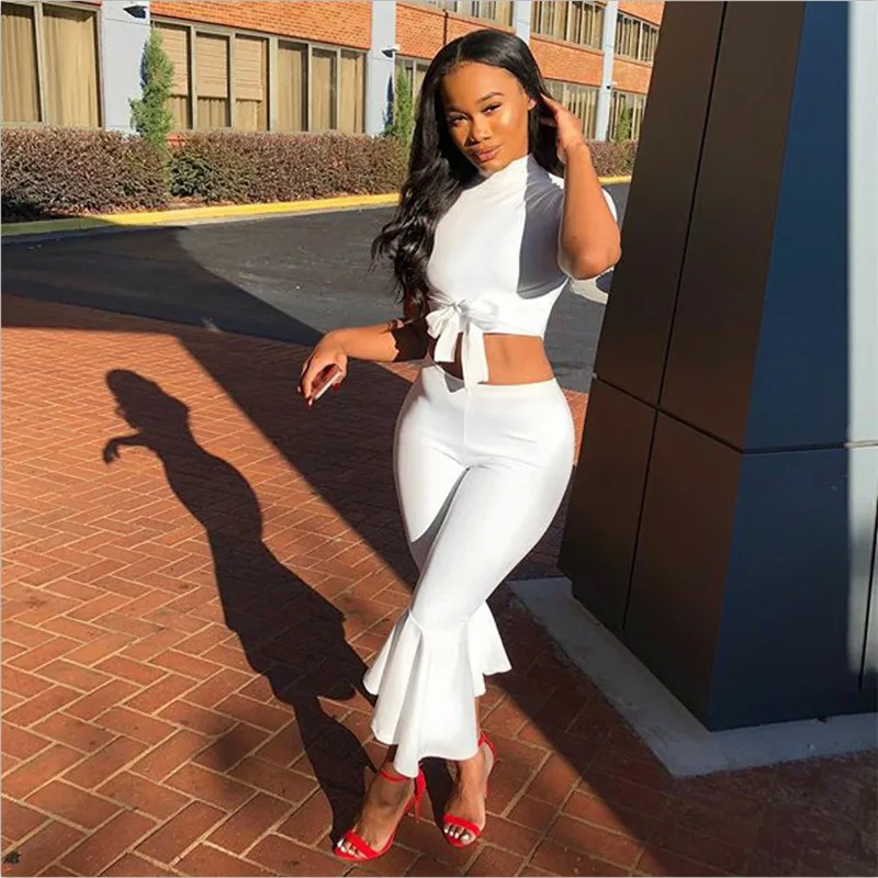 White Two Piece Set Summer Outfits Short Sleeve Bow Tie Up Top and Cropped Flare Pants Suit Fashion Sexy Women Sets