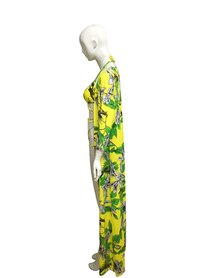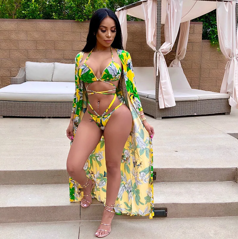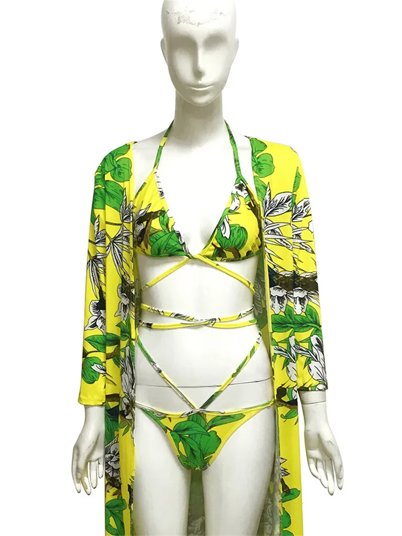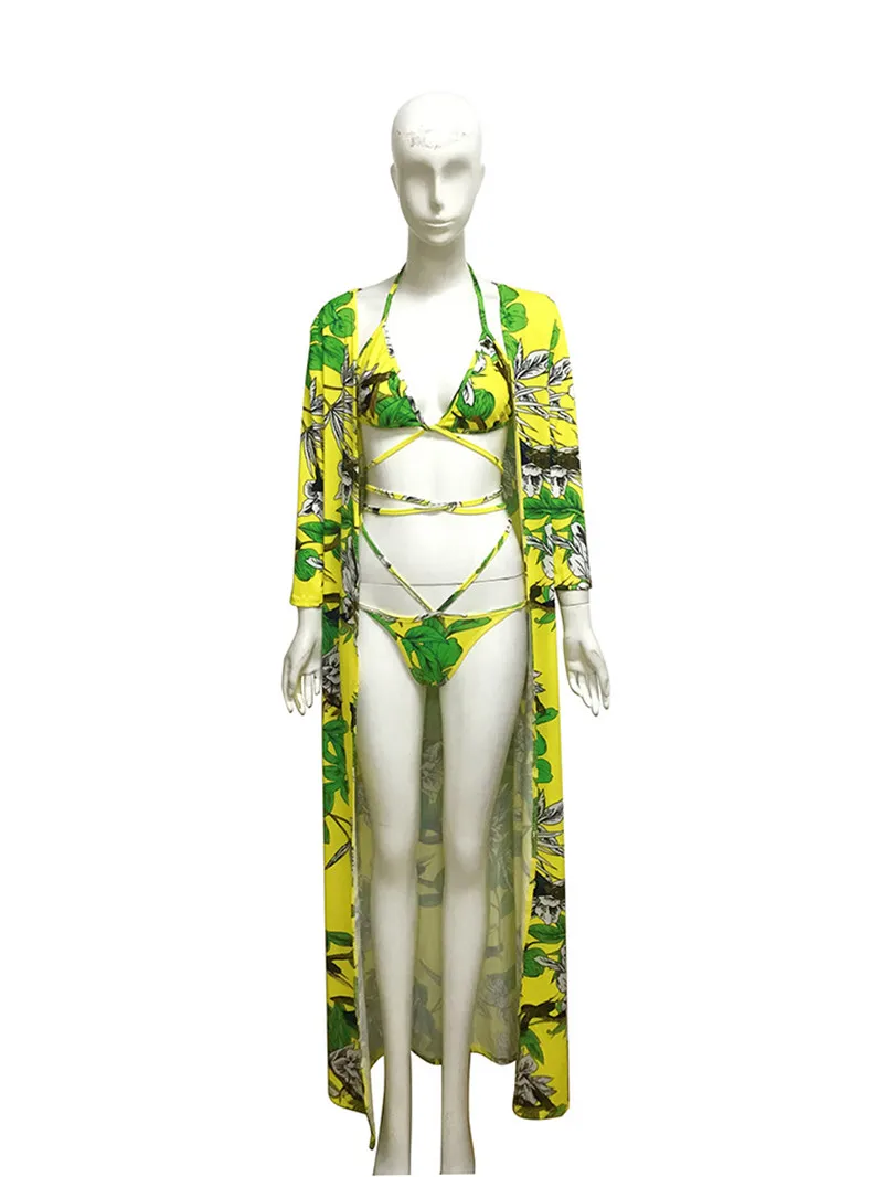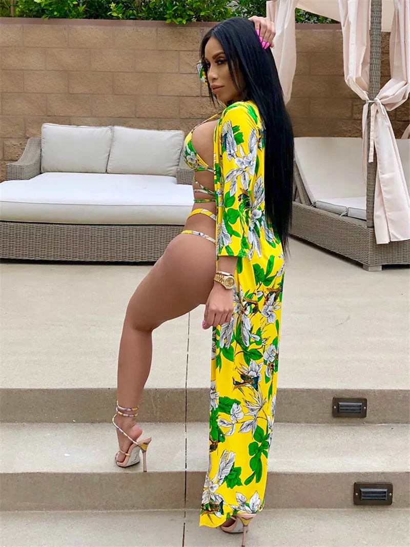 Women 3 Piece Suit Fashion Floral Print Crop Tops + Shorts + Long Cardigan Ladies Summer Sexy Boho Style Beach Outfits Set