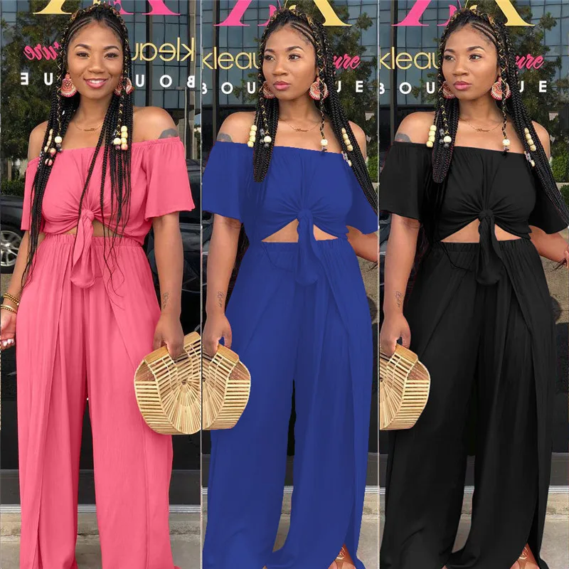 Women Loose 2 Piece Set Off Shoulder Pleat Crop Top and Split Long Pants Wide Leg Jumpsuit Casual Matching 2 Piece Outfits