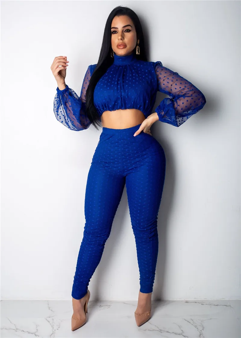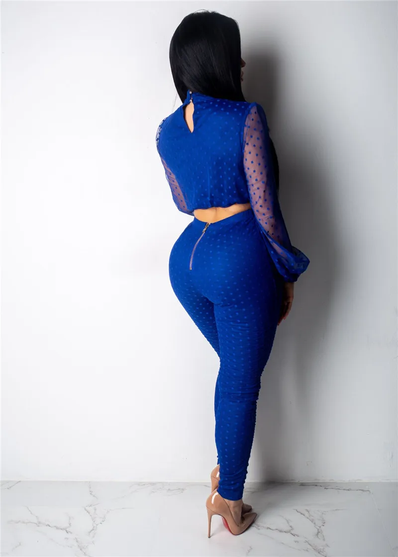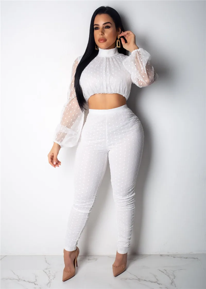 Women Polka Dot White Two Piece Set Sexy Mesh Sheer Lantern Sleeve Crop Top and Zipper Long Pants Suit Clubwear Matching Outfits