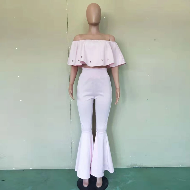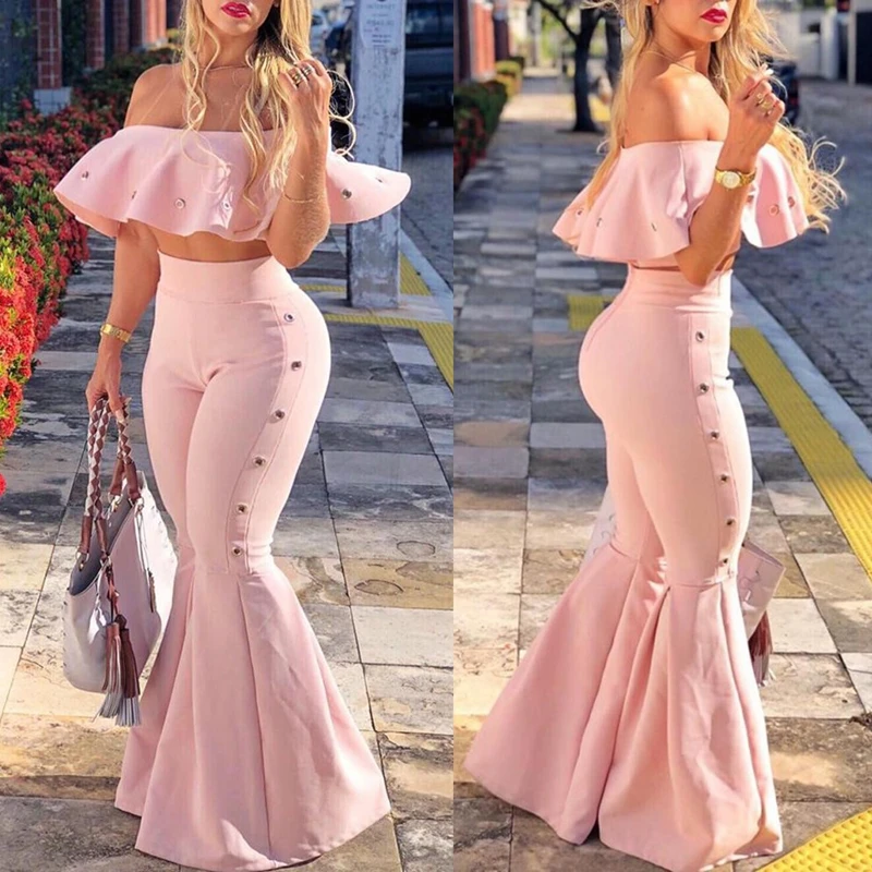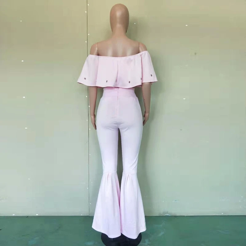 Women Ruffle Sexy Two Piece Set Top and Pants Off Shoulder Crop Top Elegant Pink 2 Piece Matching Set Outfits Flare Pants Set